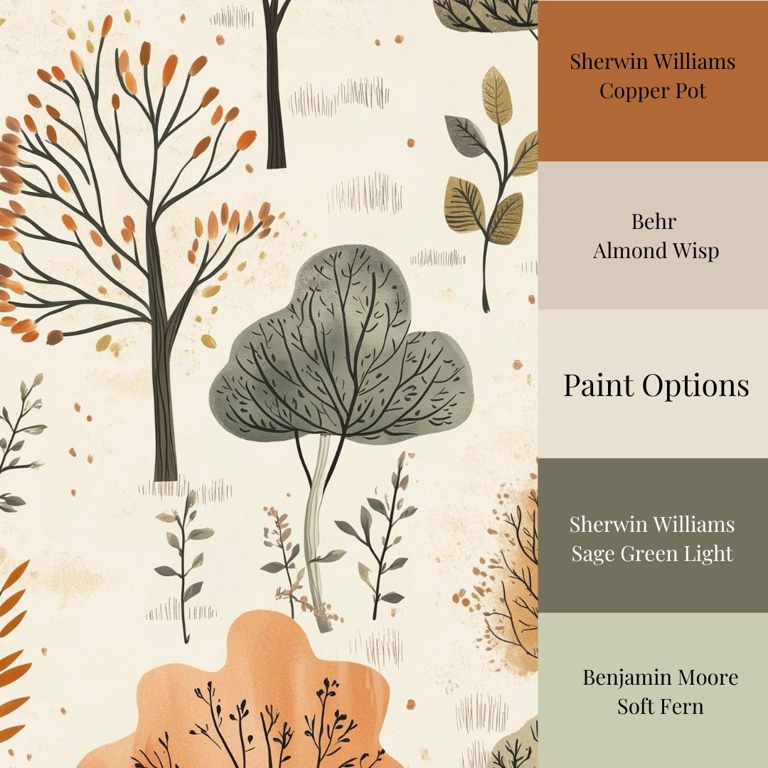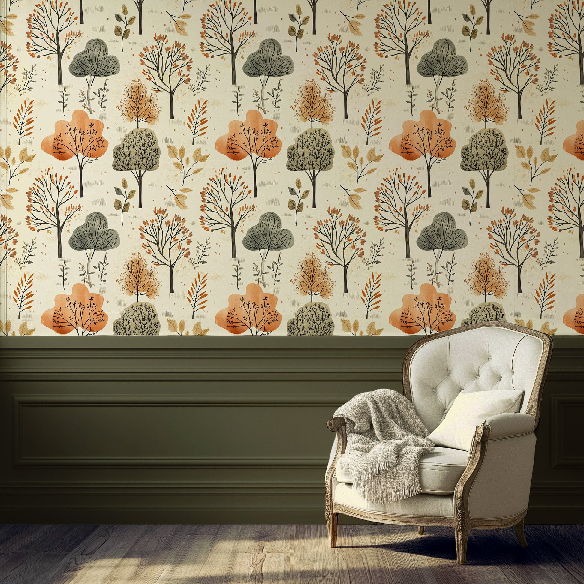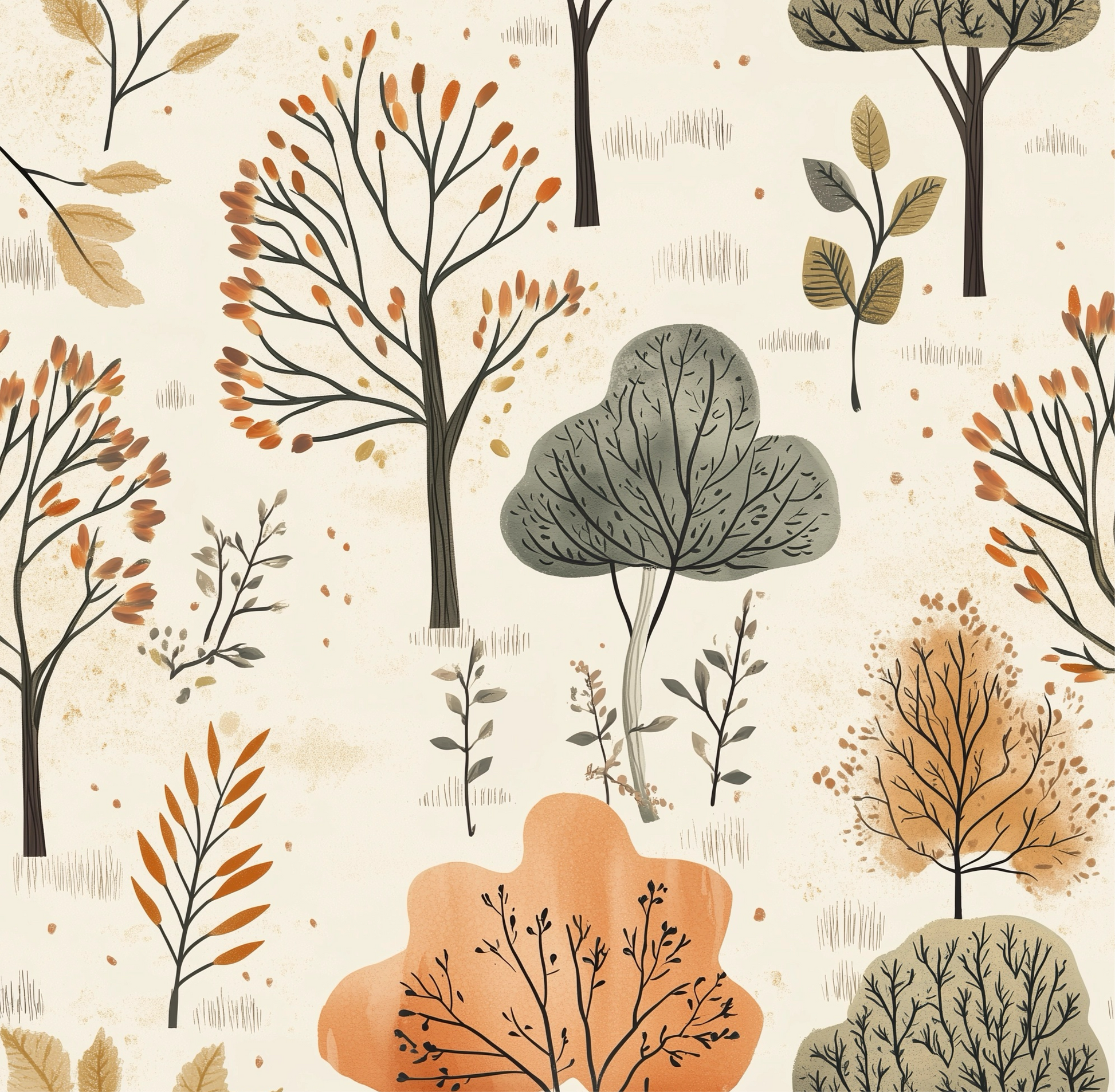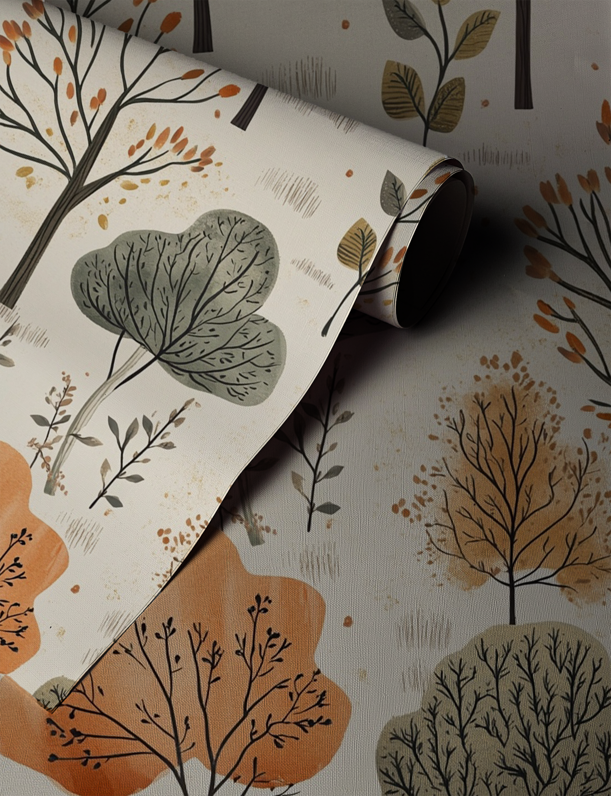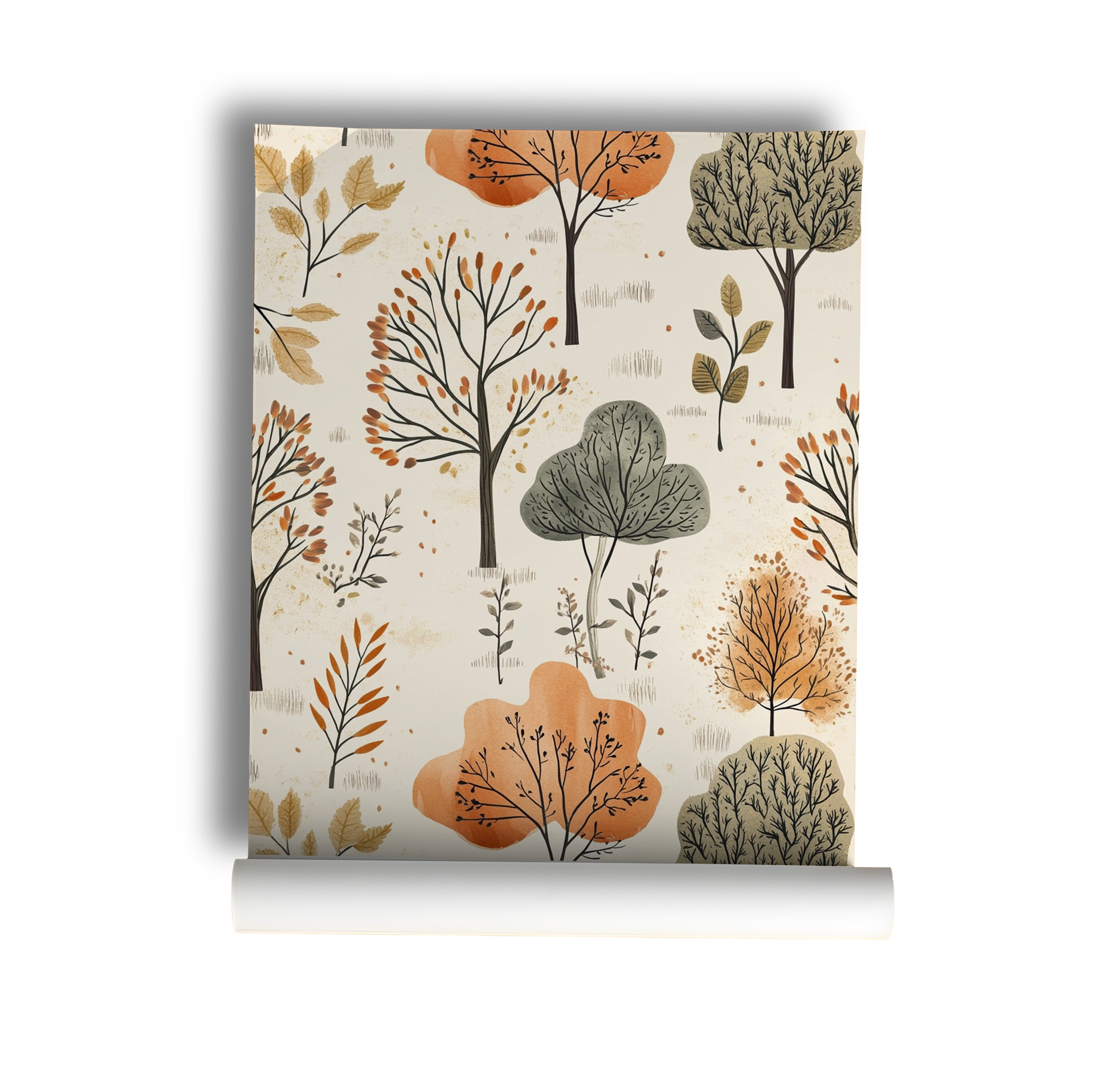 This design captures the charm of a hand-illustrated grove: painterly trees with sweeping branches, warm autumn leaves, and gentle textures scattered across a parchment-toned background. The palette blends rust, olive, ochre, and soft greys for a woodland scene that feels both childlike and timeless.