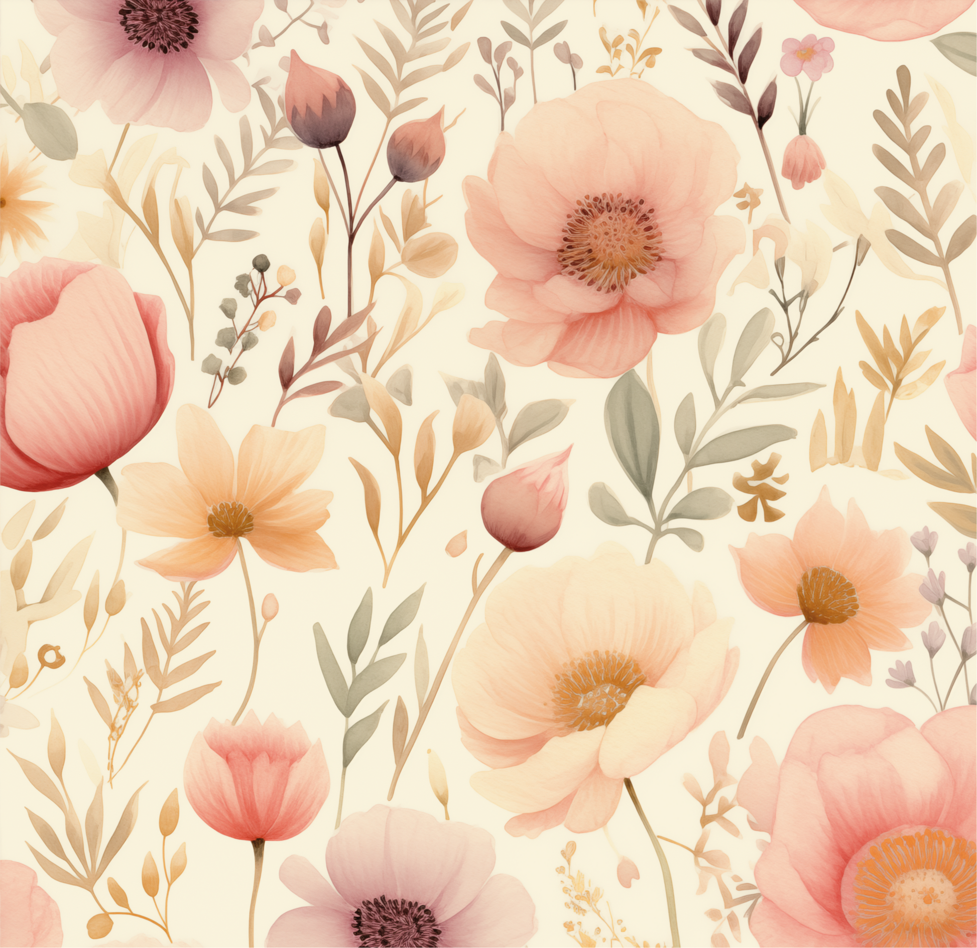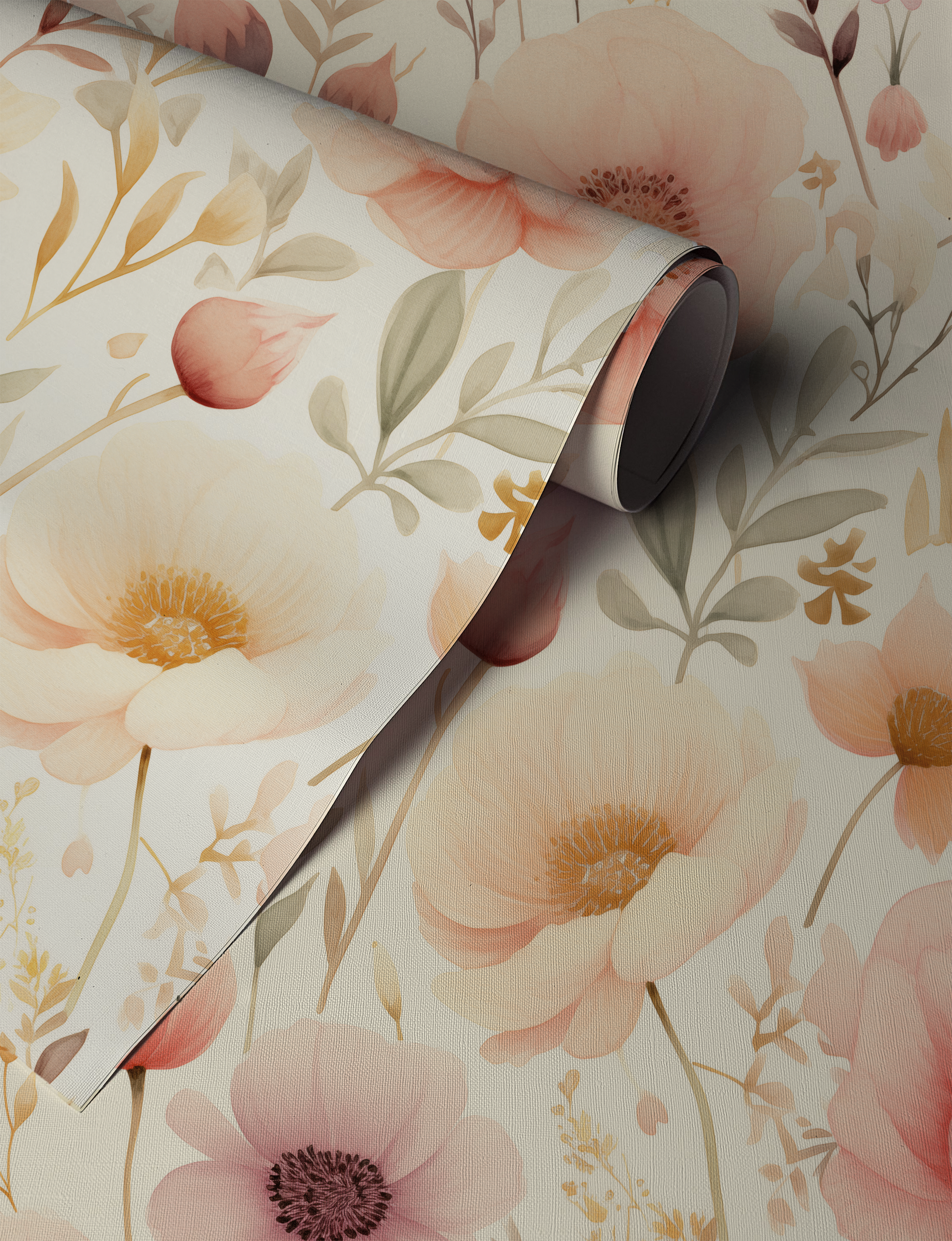 This design feels like morning sun filtering through sheer curtains. Soft floral shapes in watercolor washes of blush, peach, and golden yellow drift across a gentle cream background. The composition is open and breathable, made for interiors that value calm over clutter. It’s light without being stark—romantic without excess.