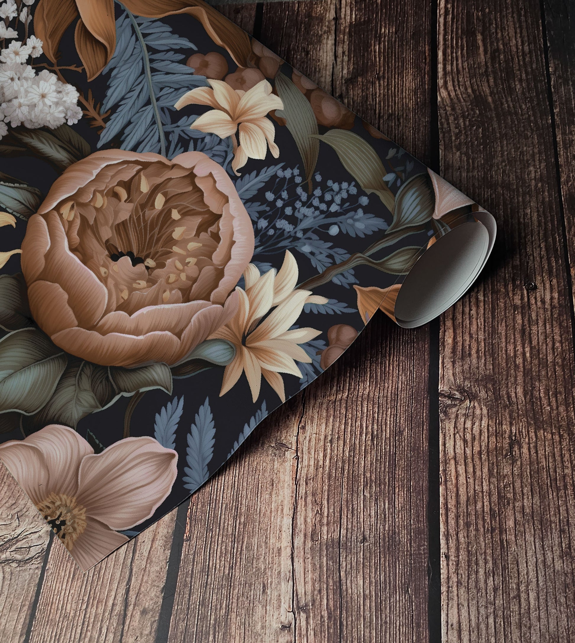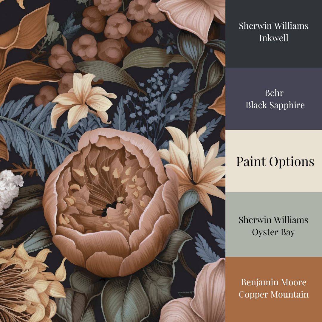 This isn’t a floral meant to be cheerful. It’s bold, quiet, and steeped in mood—a wallpaper for those drawn to dark poetry, antique libraries, and storm-washed windows.