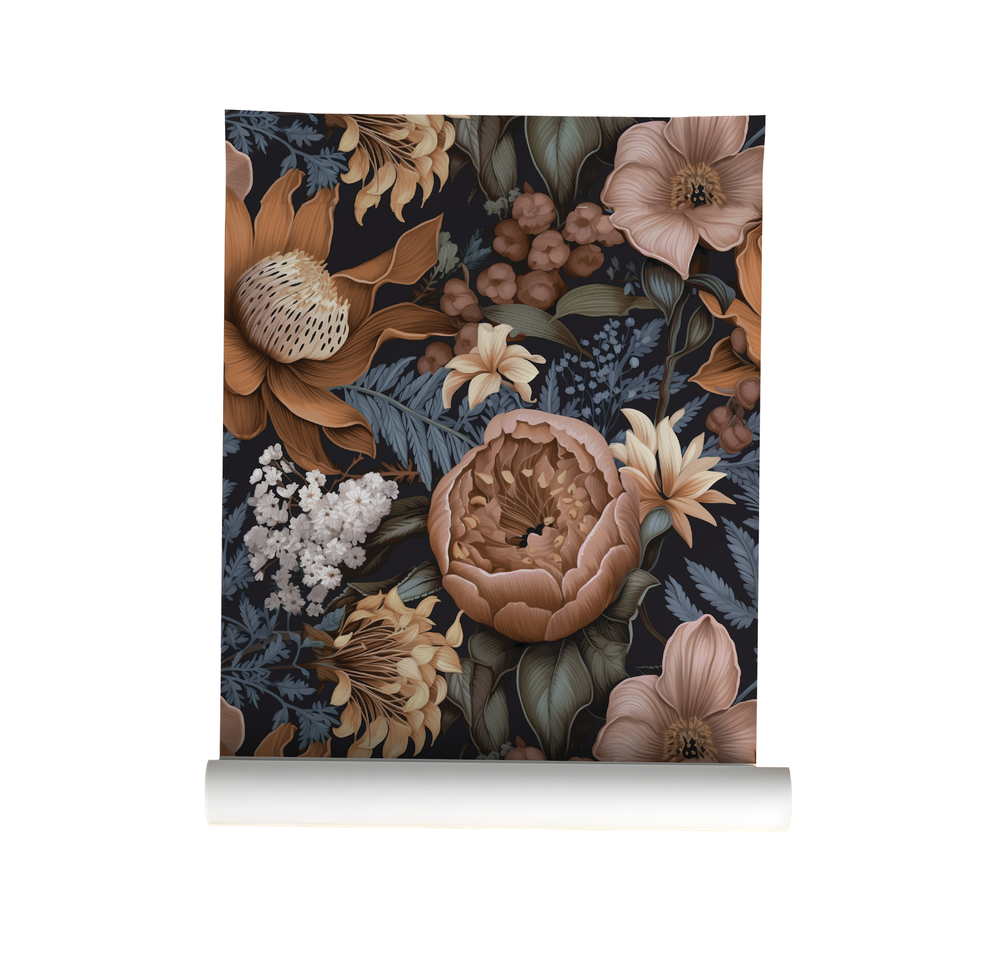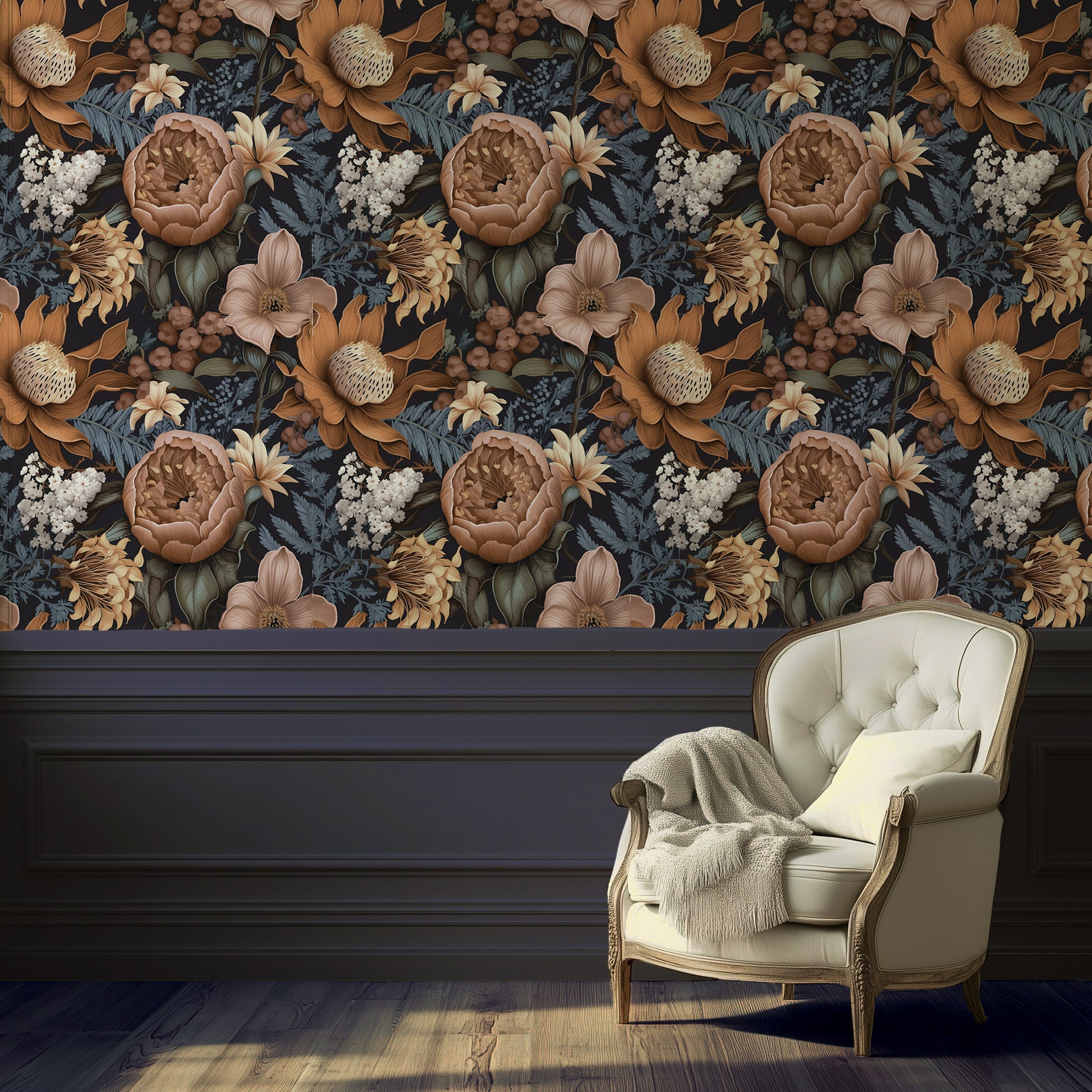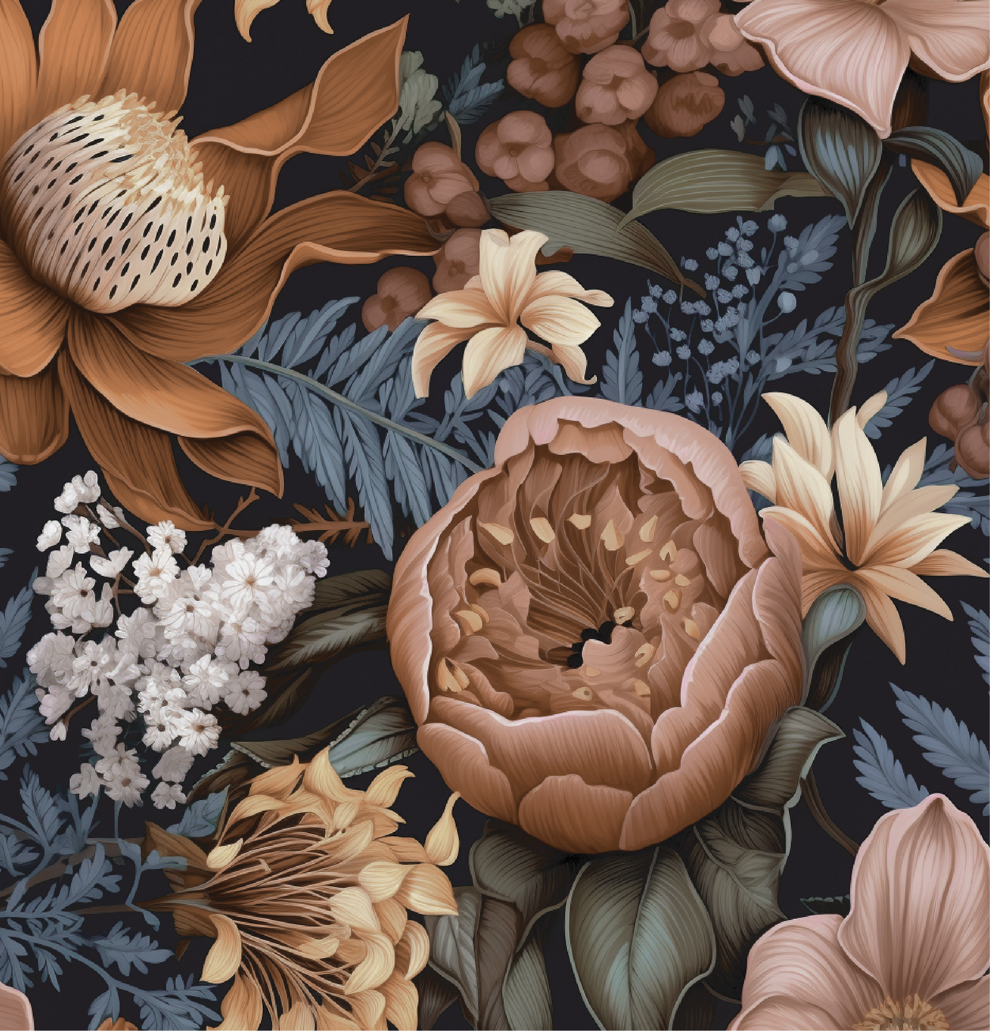 In the hush between dusk and midnight, wild blooms unfurl—copper petals, faded ochre lilies, and muted blue ferns drift like shadows in candlelight. This design feels like an old forest painting left too long in a forgotten manor, softened by time and mystery.
