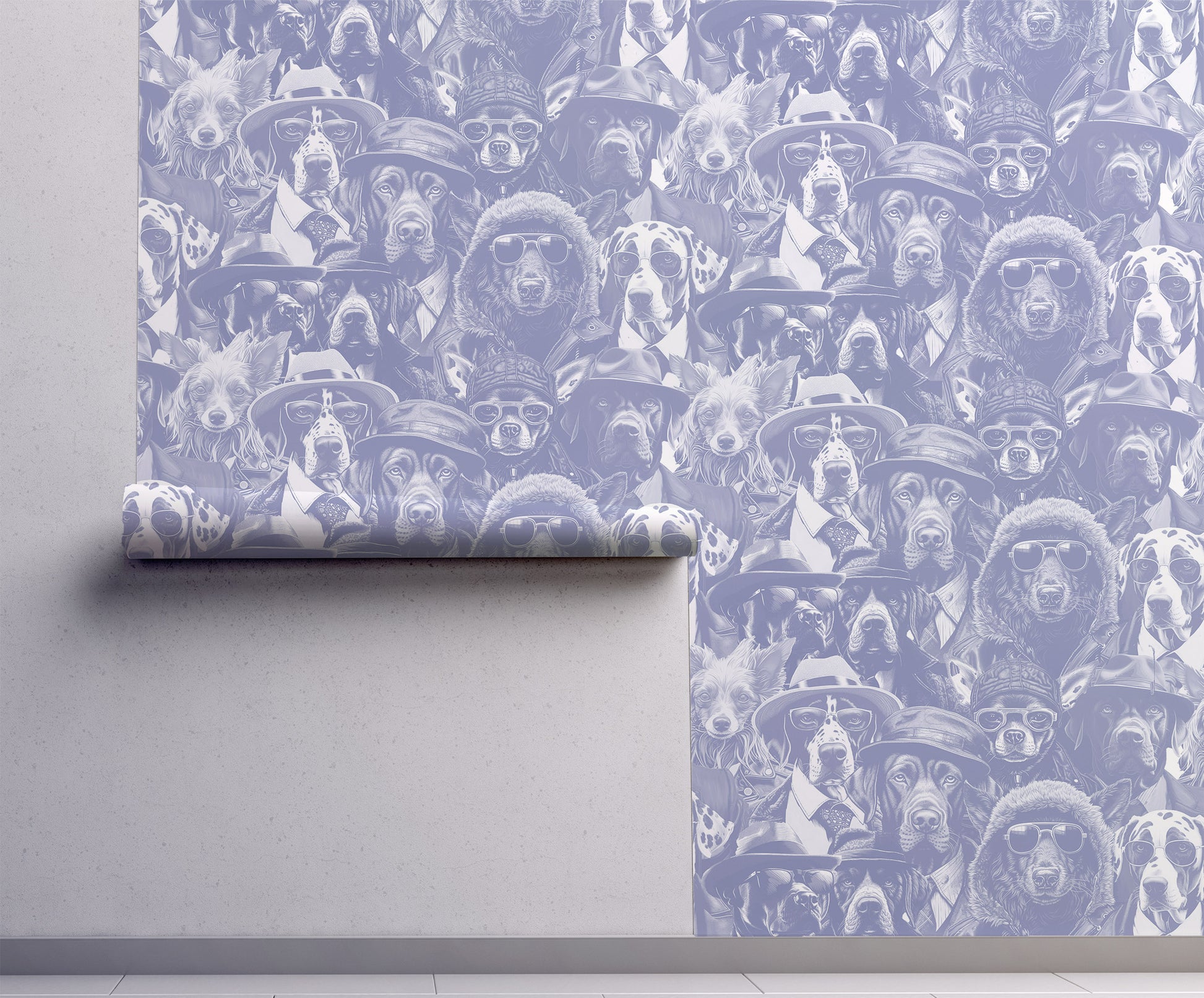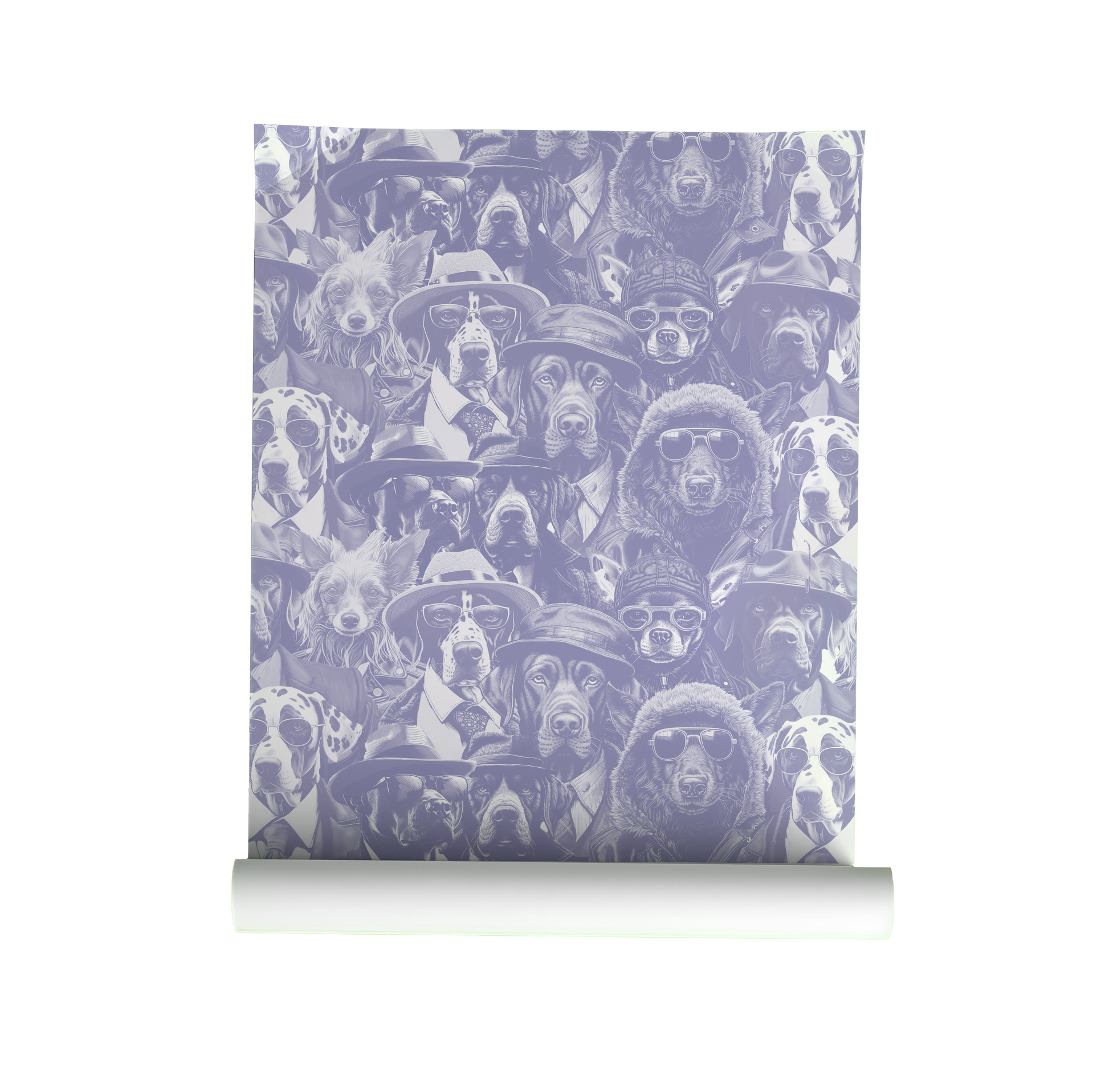 The lilac-grey palette brings a modern, refined softness while the illustrated characters add delightful personality. It’s the ideal statement wallpaper for dens, offices, pet spas, salons, and bold entryways.