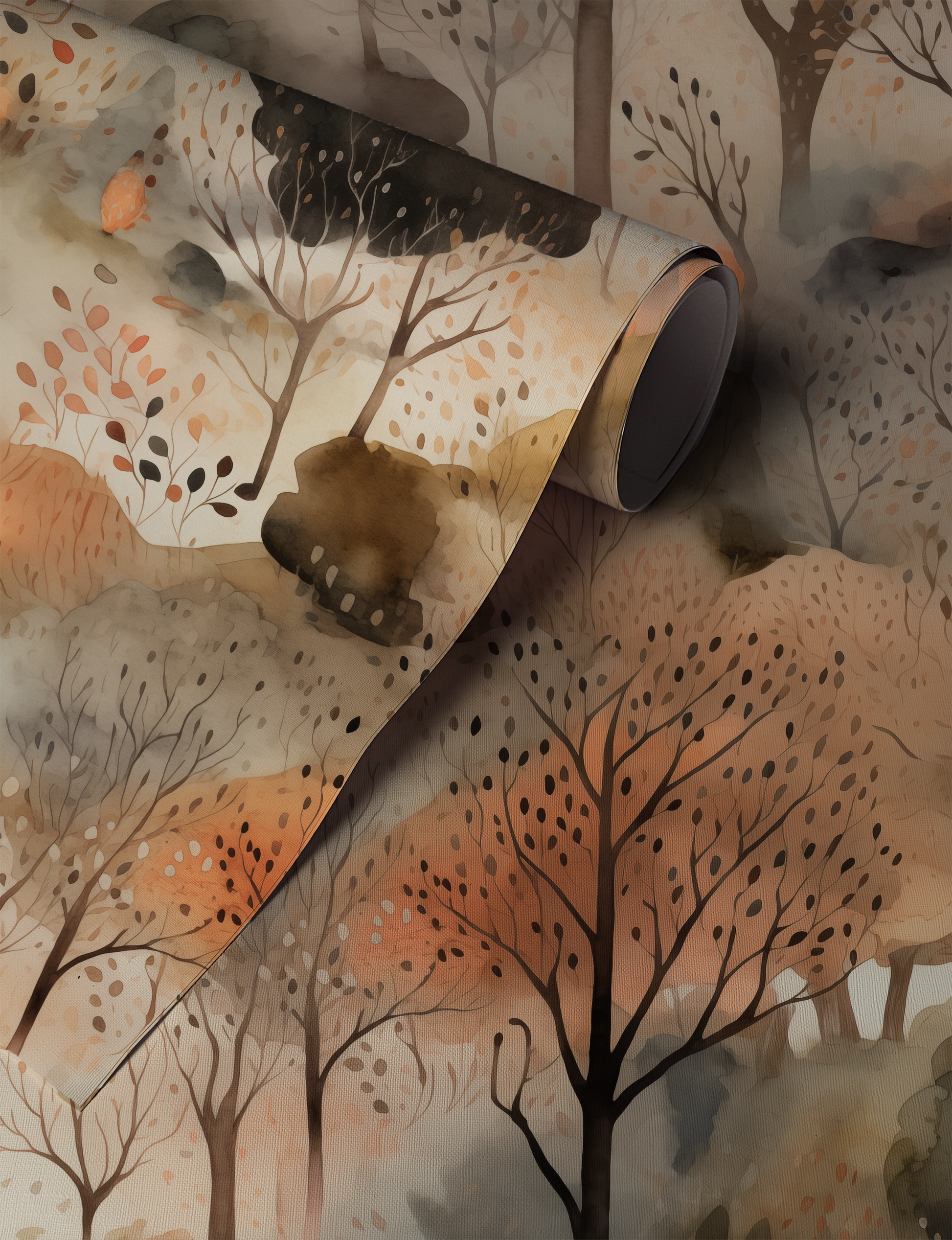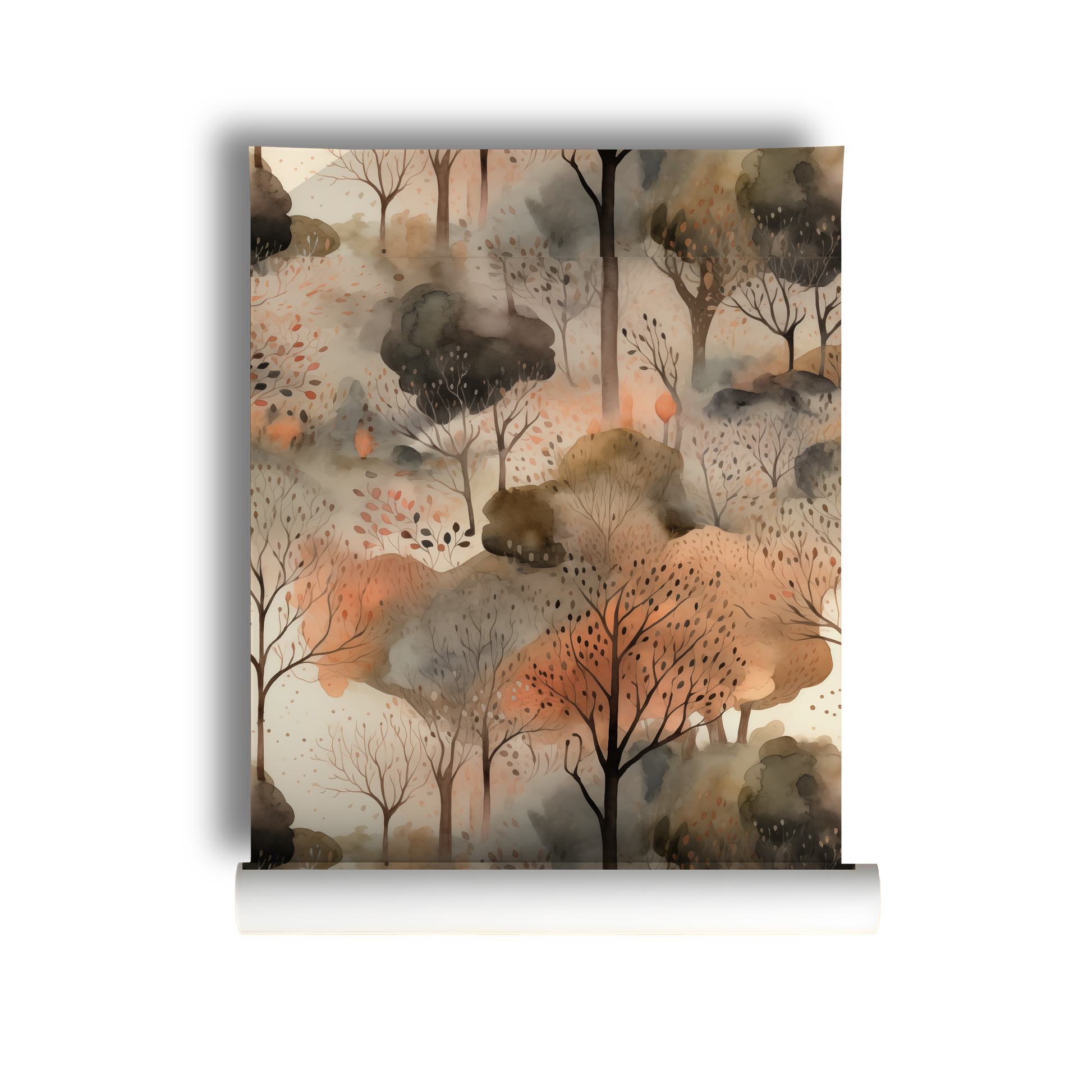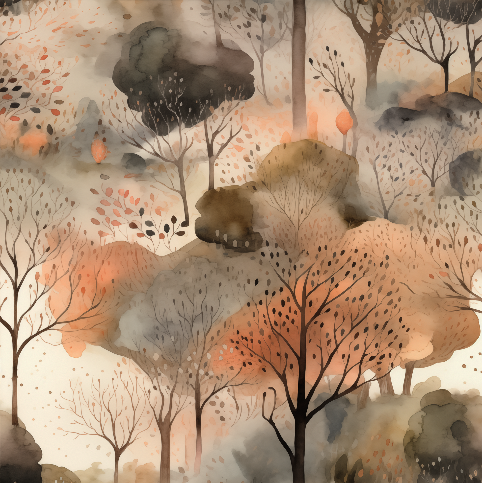This design is a dreamscape. Trees emerge from soft washes of peach, rust, and charcoal like they’ve been painted in a story you half remember. Leaves scatter like forgotten pages, and the whole scene feels like twilight in a fairytale—gentle, layered, and full of hush.