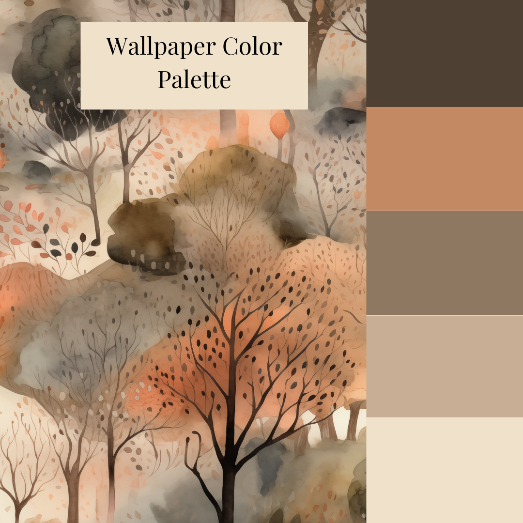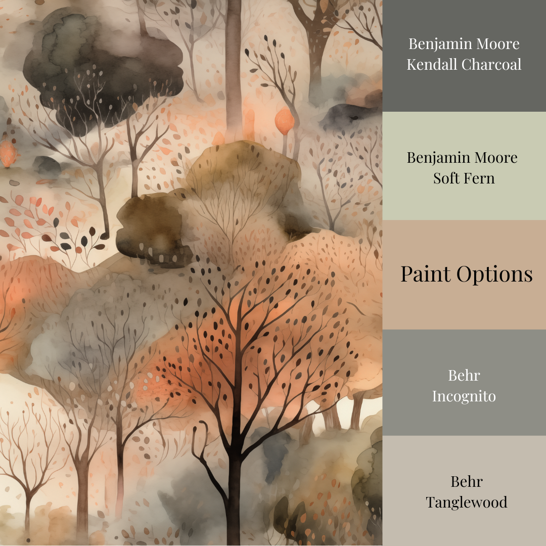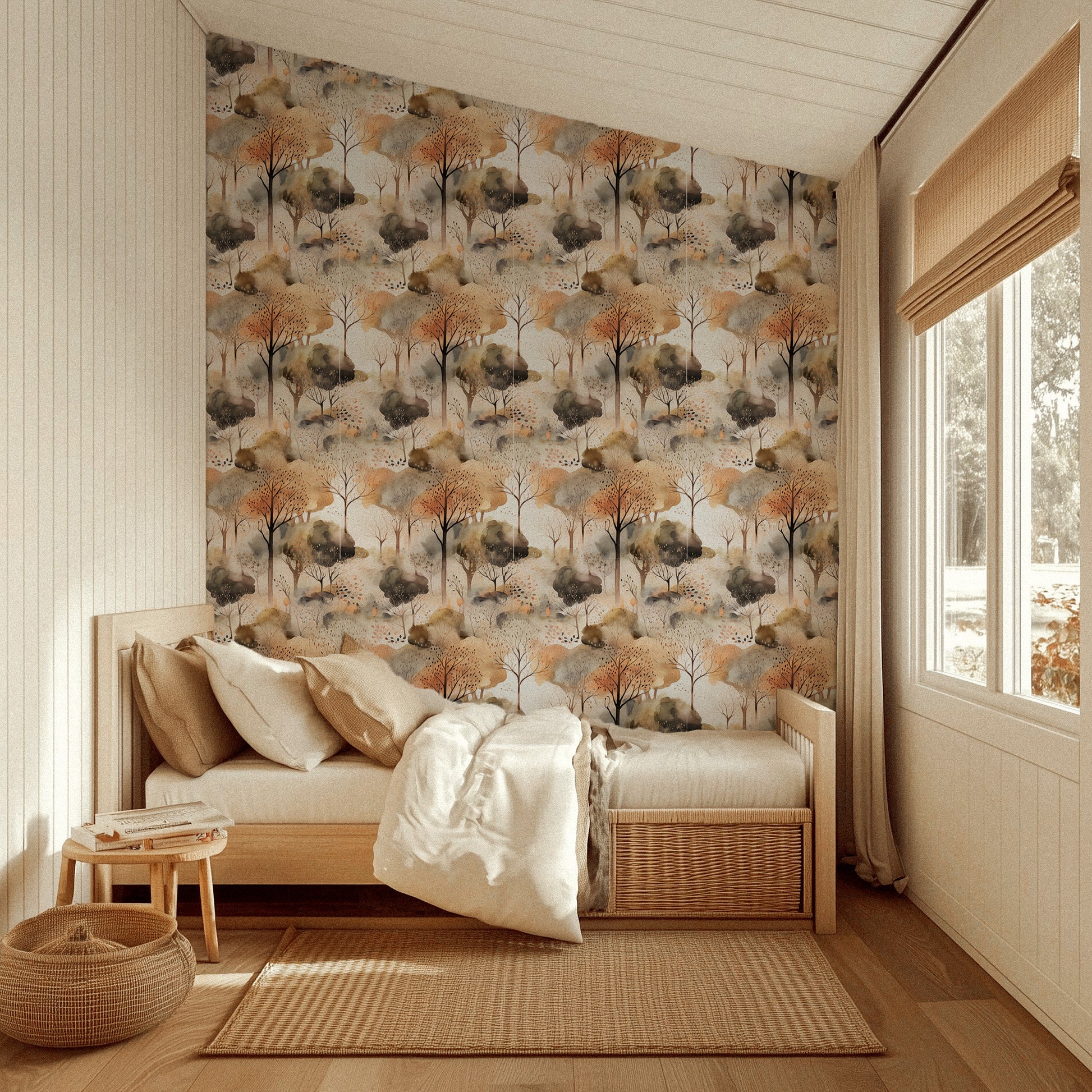 This design is a dreamscape. Trees emerge from soft washes of peach, rust, and charcoal like they’ve been painted in a story you half remember. Leaves scatter like forgotten pages, and the whole scene feels like twilight in a fairytale—gentle, layered, and full of hush.