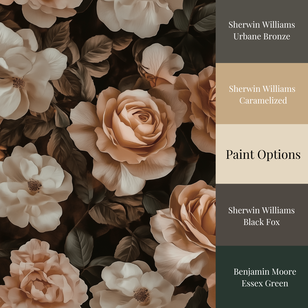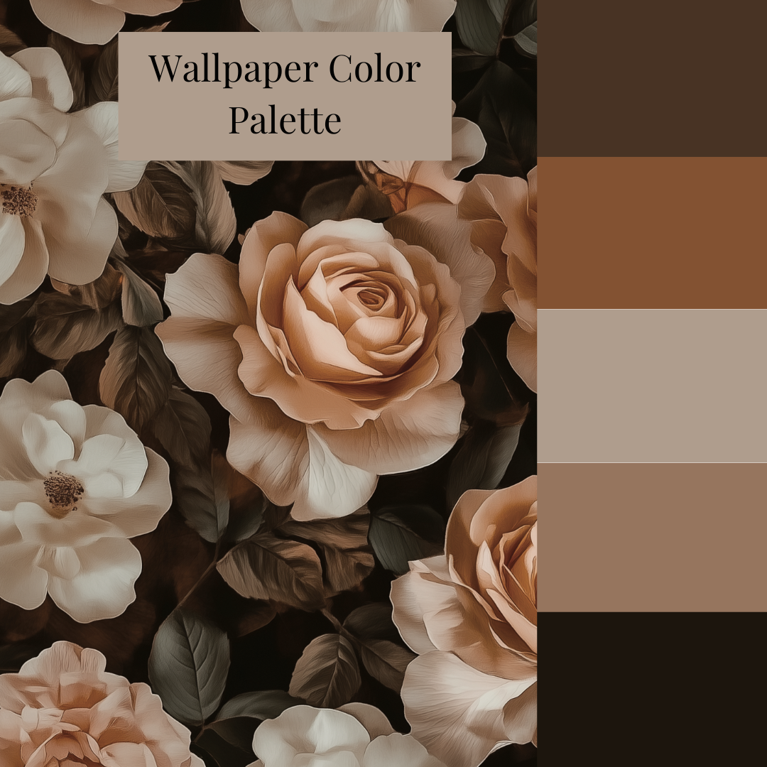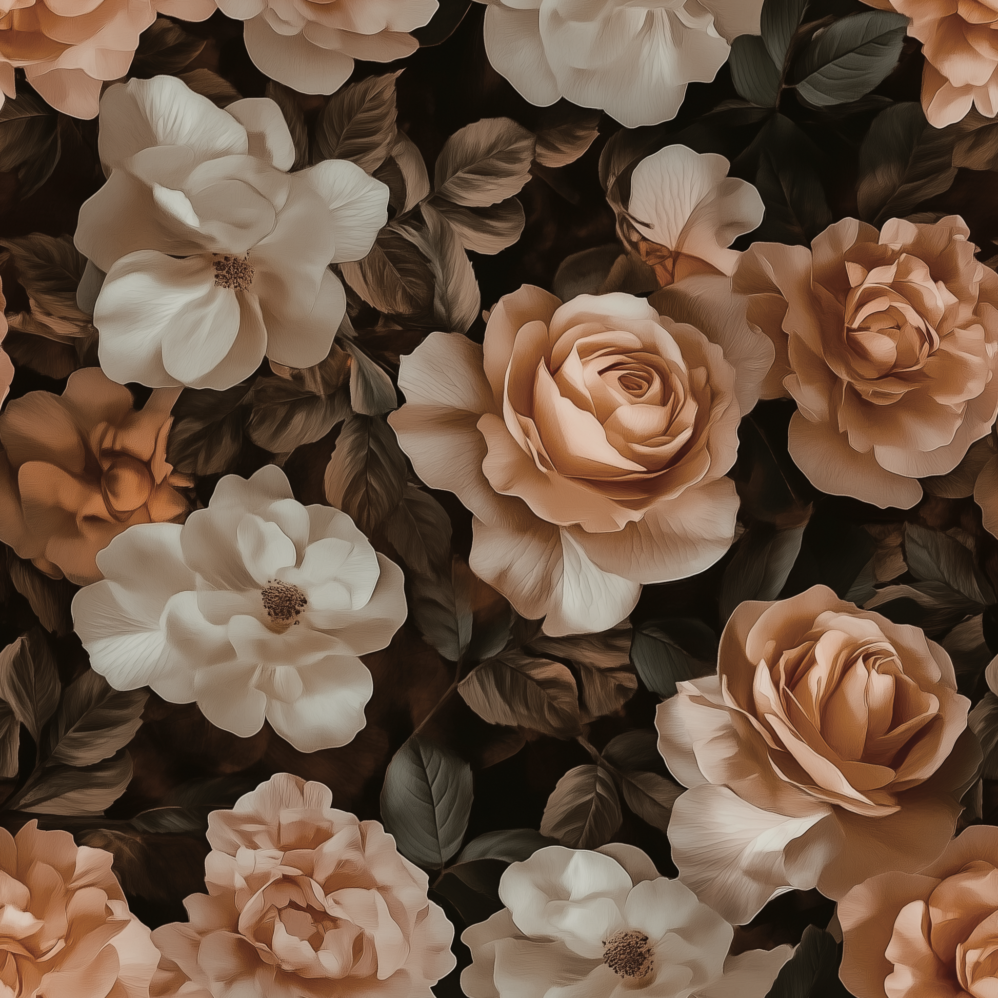 This design is rich with warmth and weight—honeyed roses, ivory petals, and sepia-toned blooms unfurl over a deep shadowed ground. The palette leans into aged parchment and dark amber, like a bouquet left to dry in a velvet-draped room. Moody but golden, soft but structured—this wallpaper feels like memory.