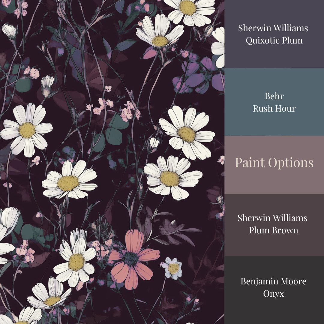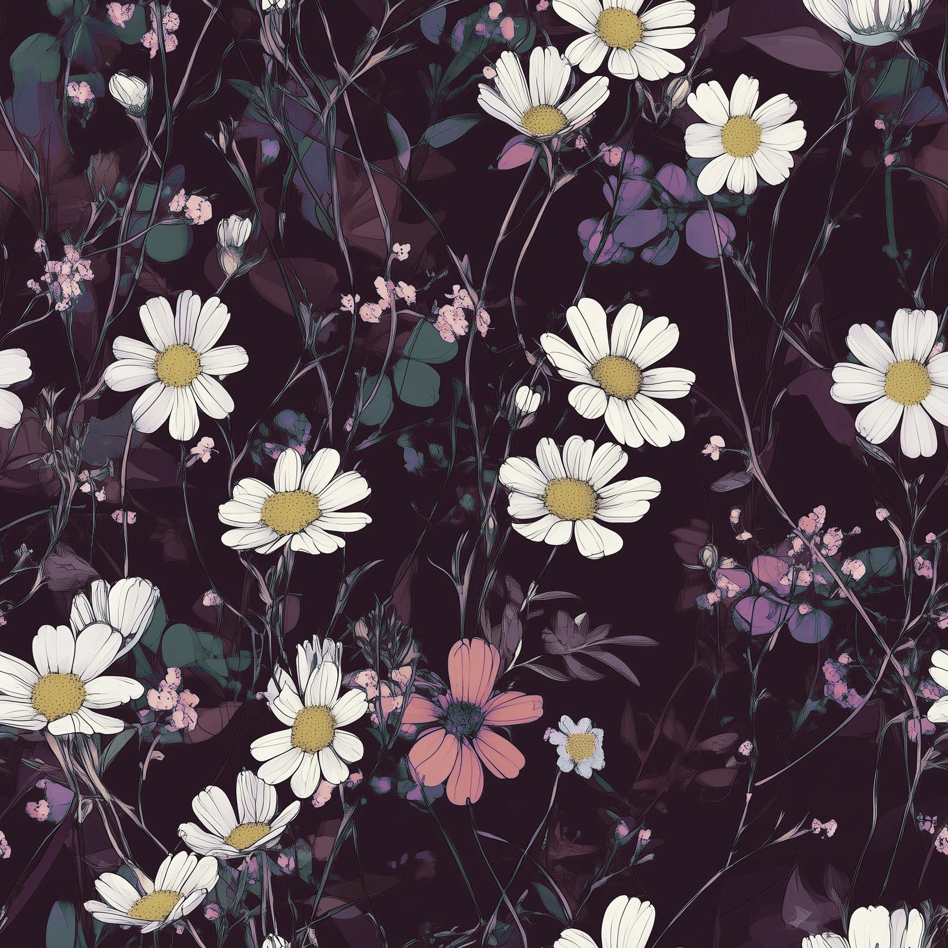 This design is an ode to the ones who never quite fit inside the lines. A meadow of white-petaled daisies, delicate blush blossoms, and untamed stems stretch across a backdrop of deep plum and shadowed green. It feels like a field remembered from childhood—slightly overgrown, soft with nostalgia, and defiant in its quiet wildness.