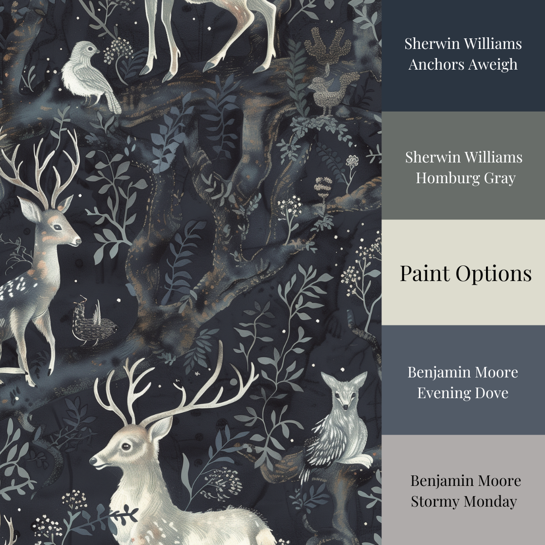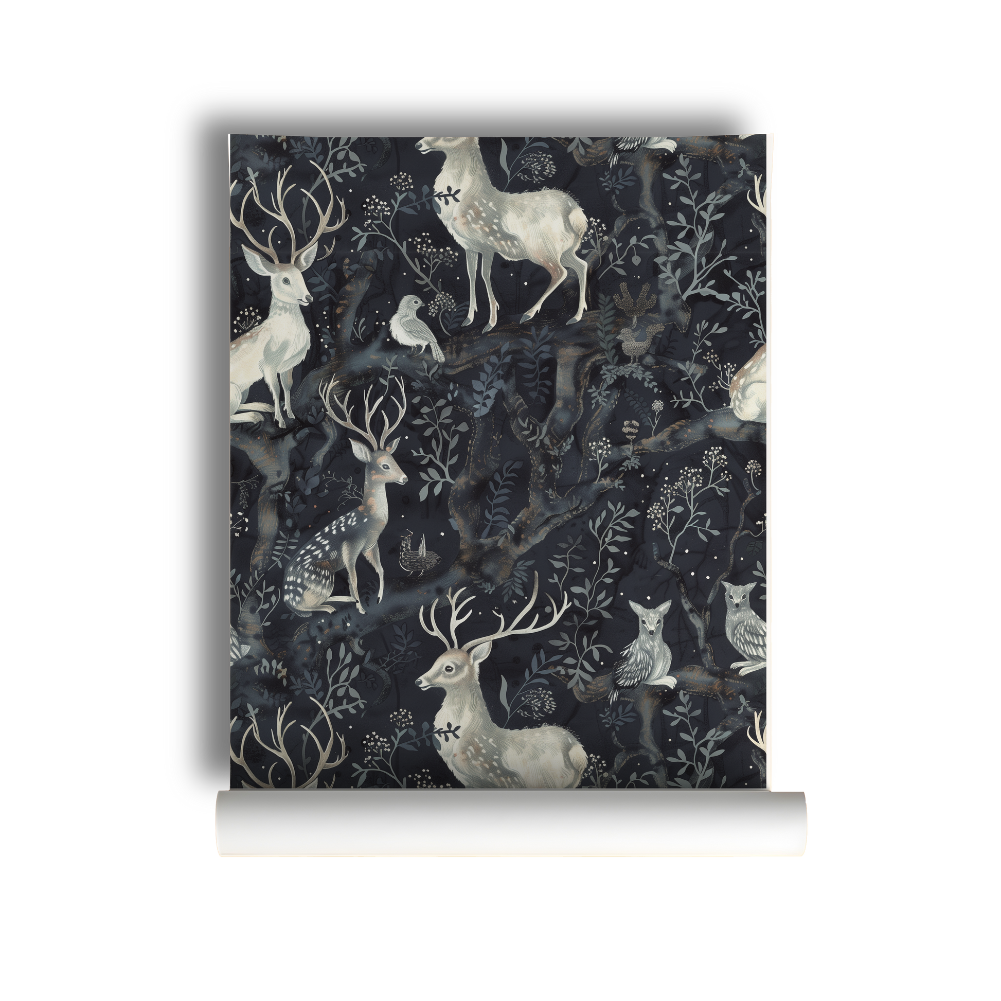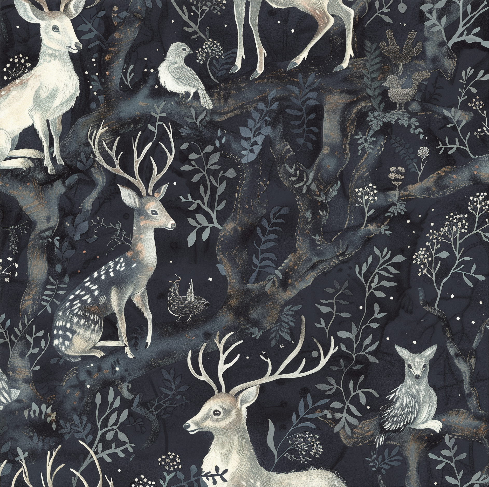 Fairy Tales is a twilight world of silver stags, wise owls, foxes, and birds nestled among moss-covered branches and deep indigo leaves. There’s a hush to it—but not an emptiness. The kind of stillness that comes when you know you're not alone, and yet feel completely safe.