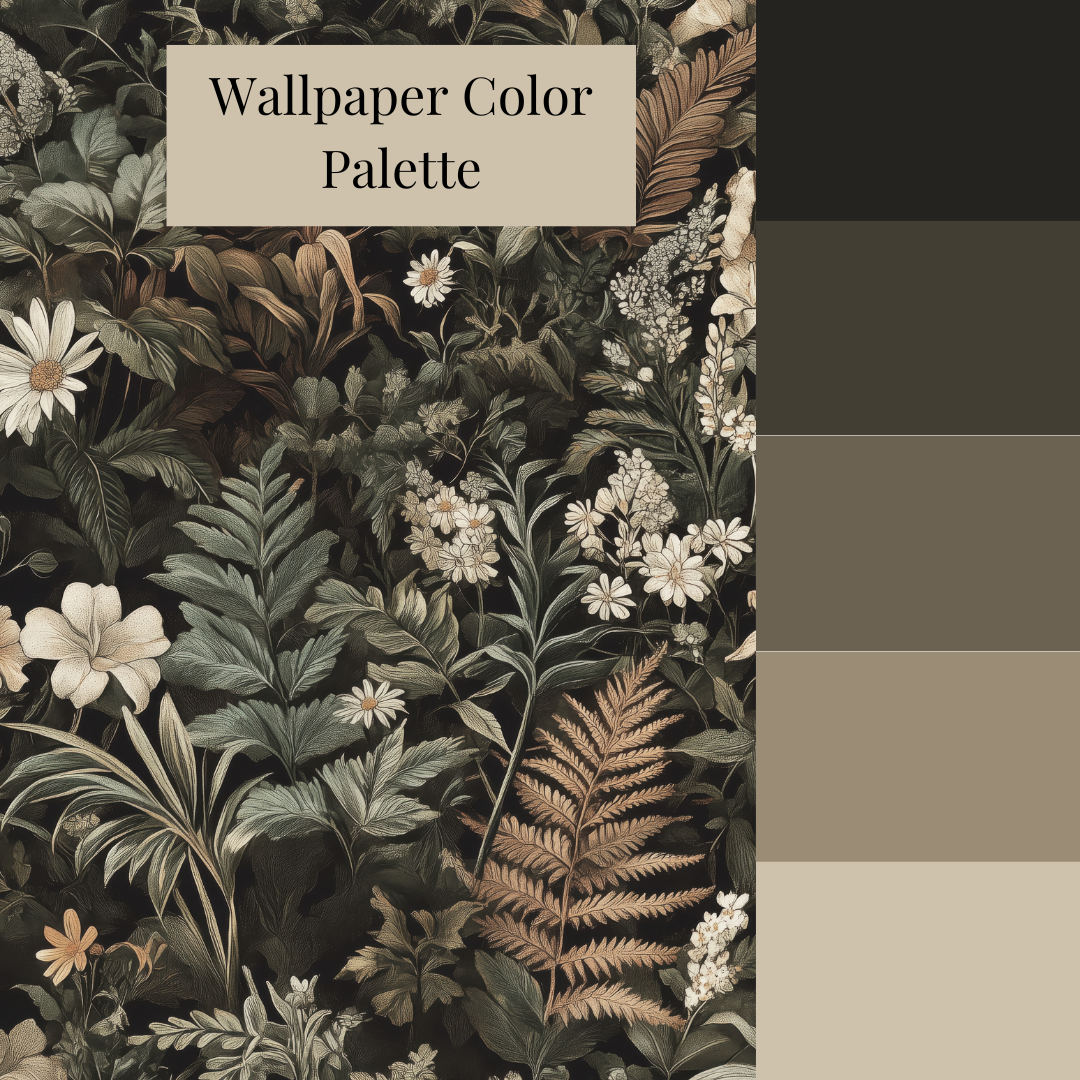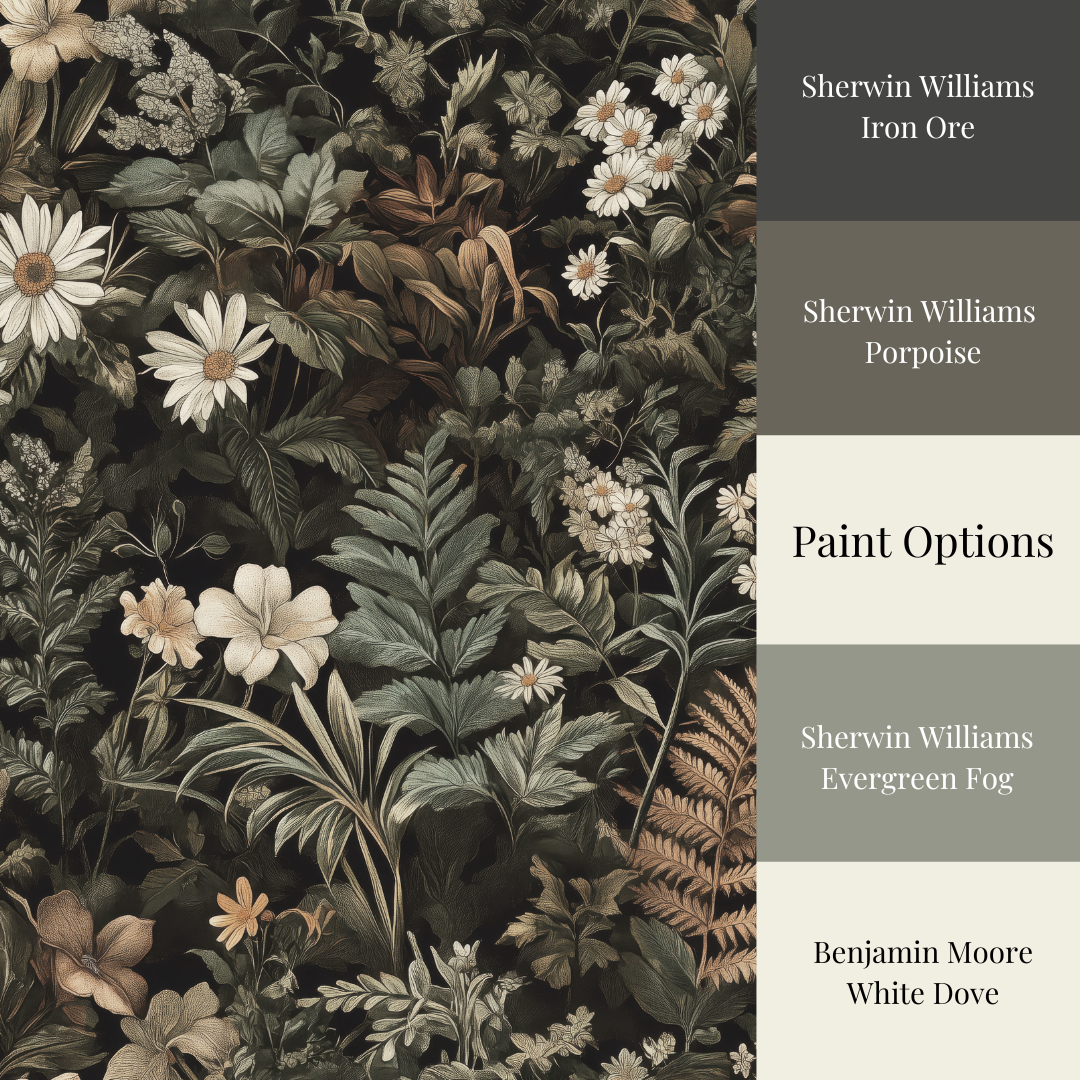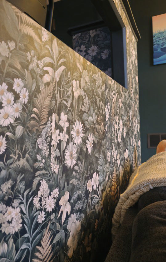 This design is a quiet rebellion—an untamed garden that grows in shadows and silence. With ivory blooms, golden ferns, and soft sage leaves layered over a deep charcoal base, it feels like something found between the pages of a long-lost botanical journal.