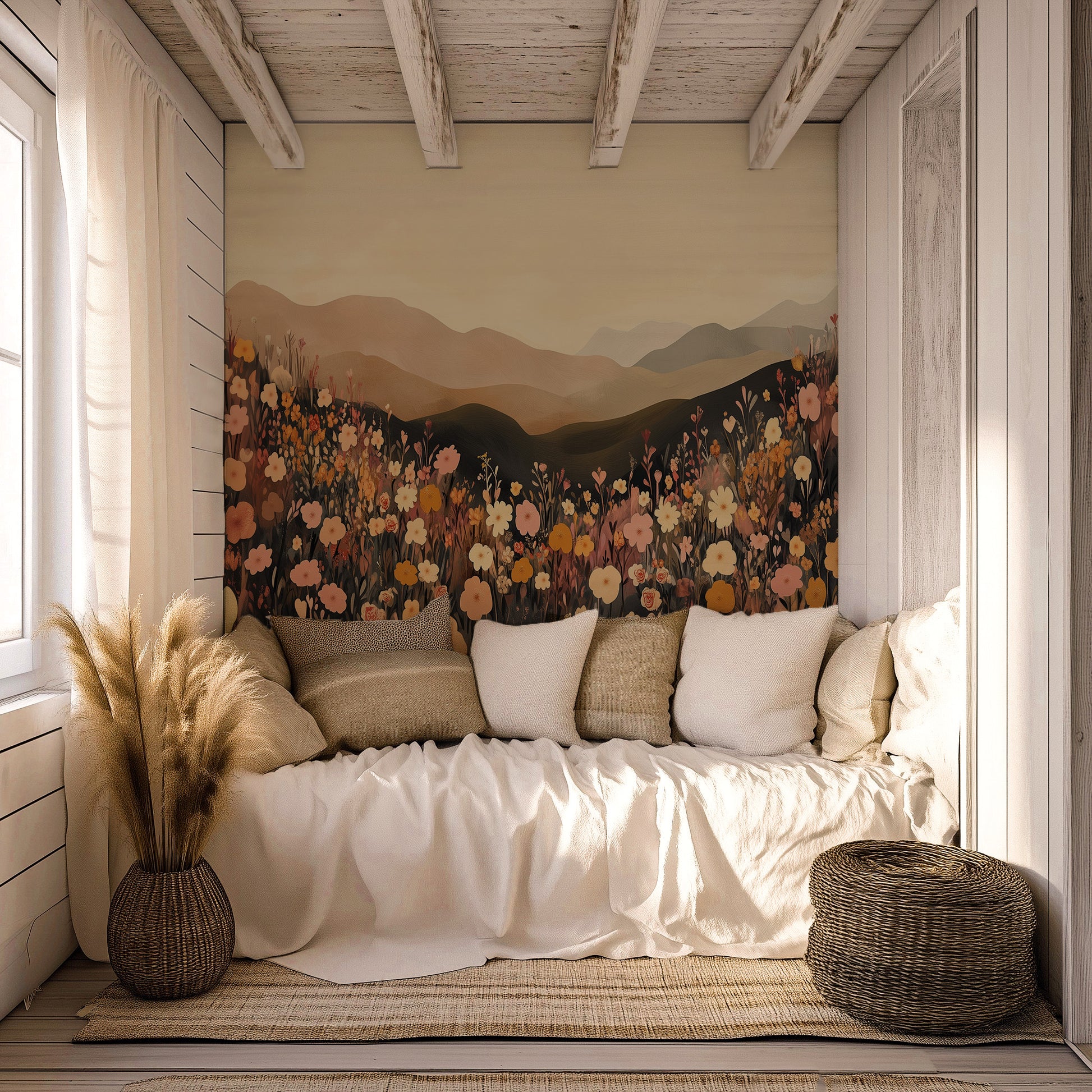 Just before nightfall, when the last light folds itself into the hills, the wildflowers take on a deeper hue—golden ochres, dusty mauves, and moon-pale cream. This mural captures that rare and fleeting magic: the bloom that happens in the dusk.
