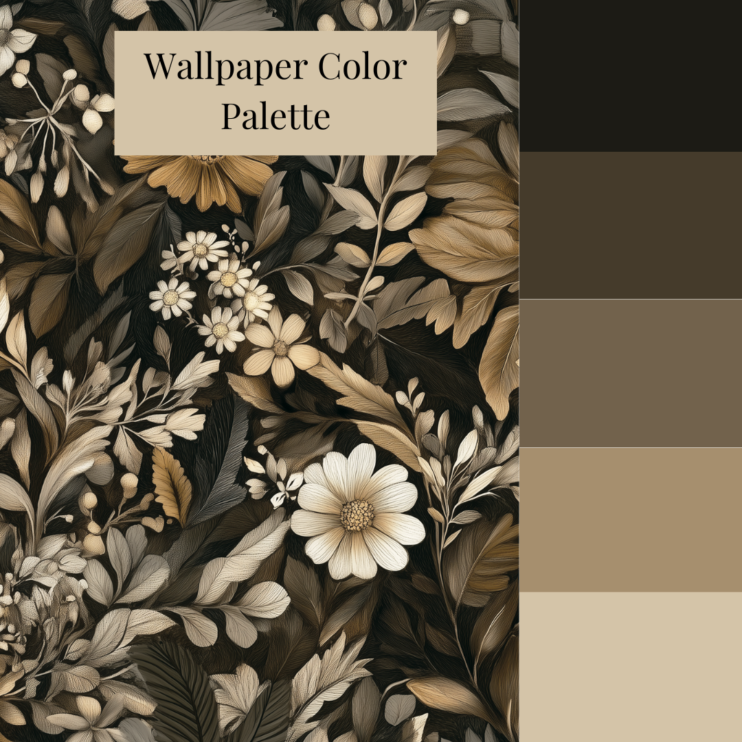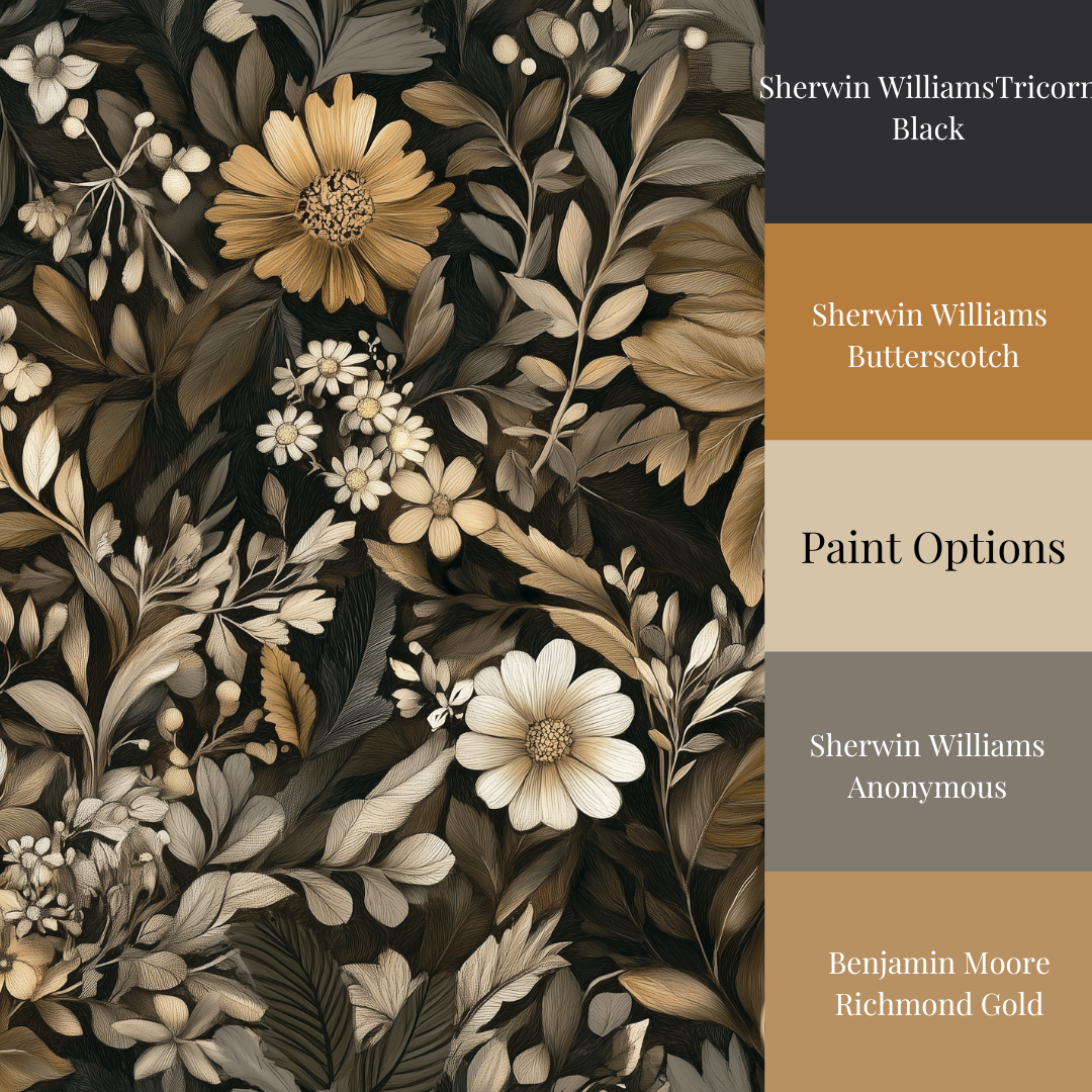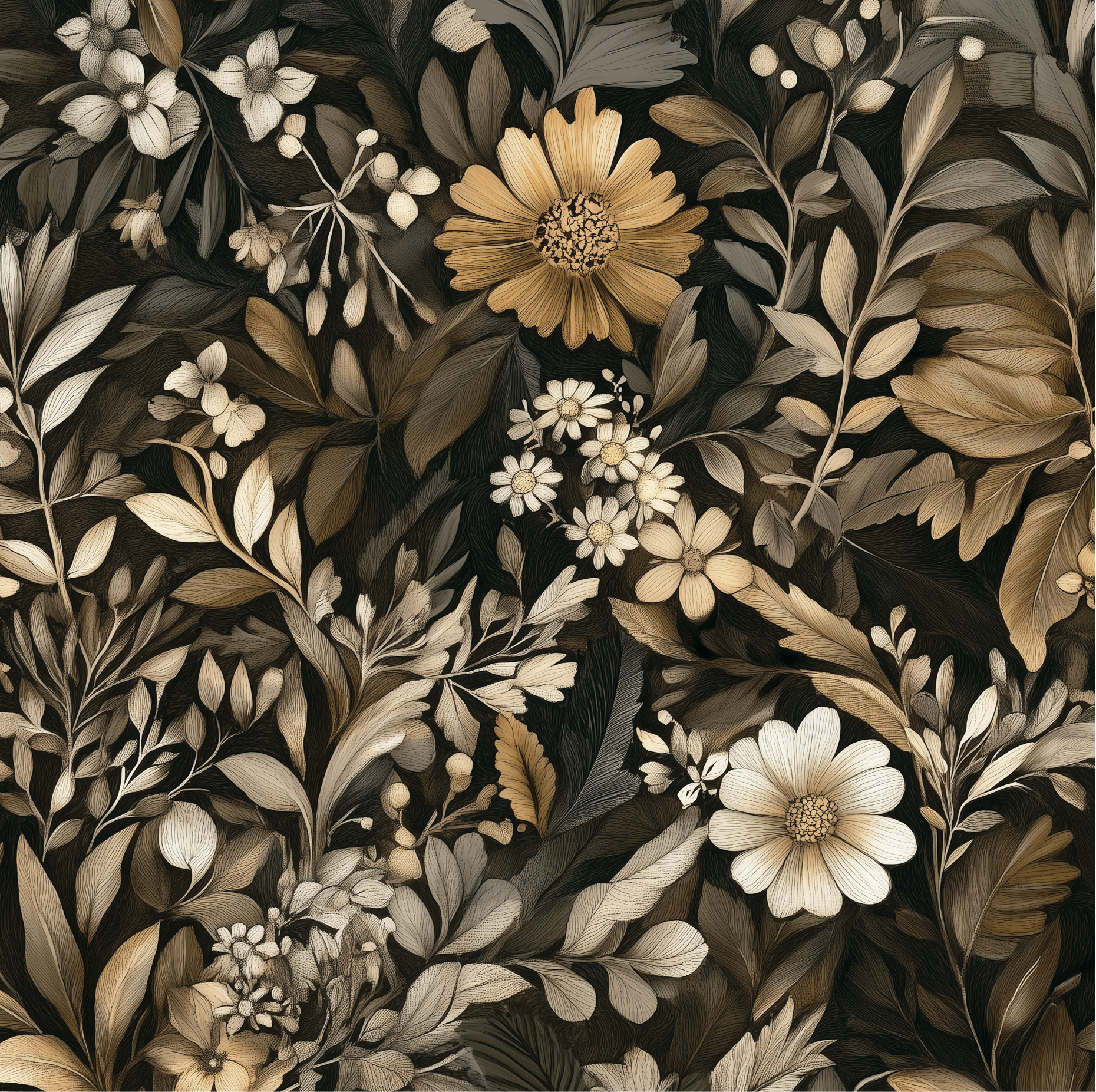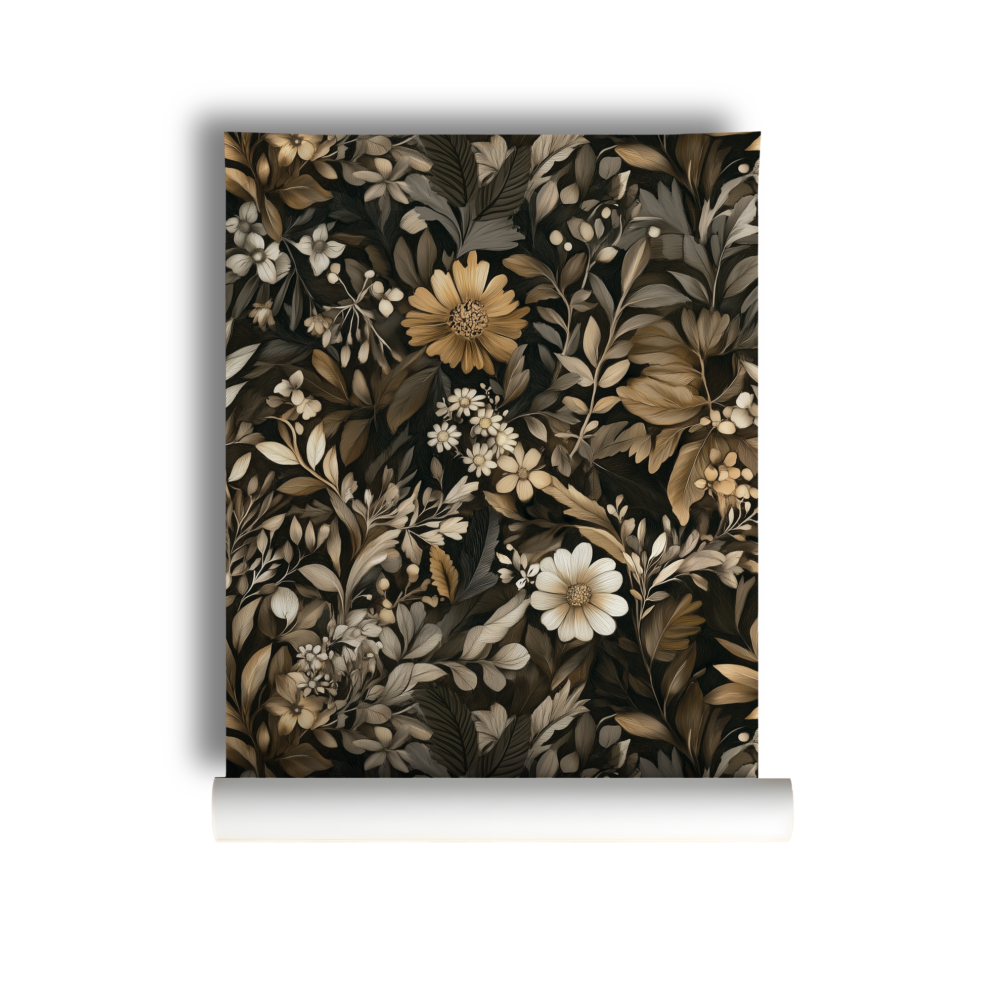 Transform your home with the cozy elegance of this dark botanical floral wallpaper. Featuring beautifully illustrated golden blooms, delicate cream flowers, and intricate foliage, this design evokes the warmth of an autumnal garden. Set against a rich dark background, the contrast highlights each botanical detail, making it perfect for creating a dramatic feature wall or an elegant, moody atmosphere in bedrooms, living rooms, or dining areas. The muted color palette exudes a sense of vintage sophistication, adding a romantic cottagecore charm to your interior.