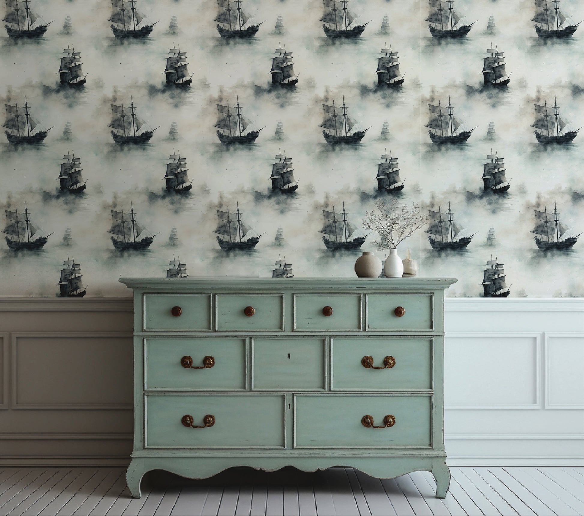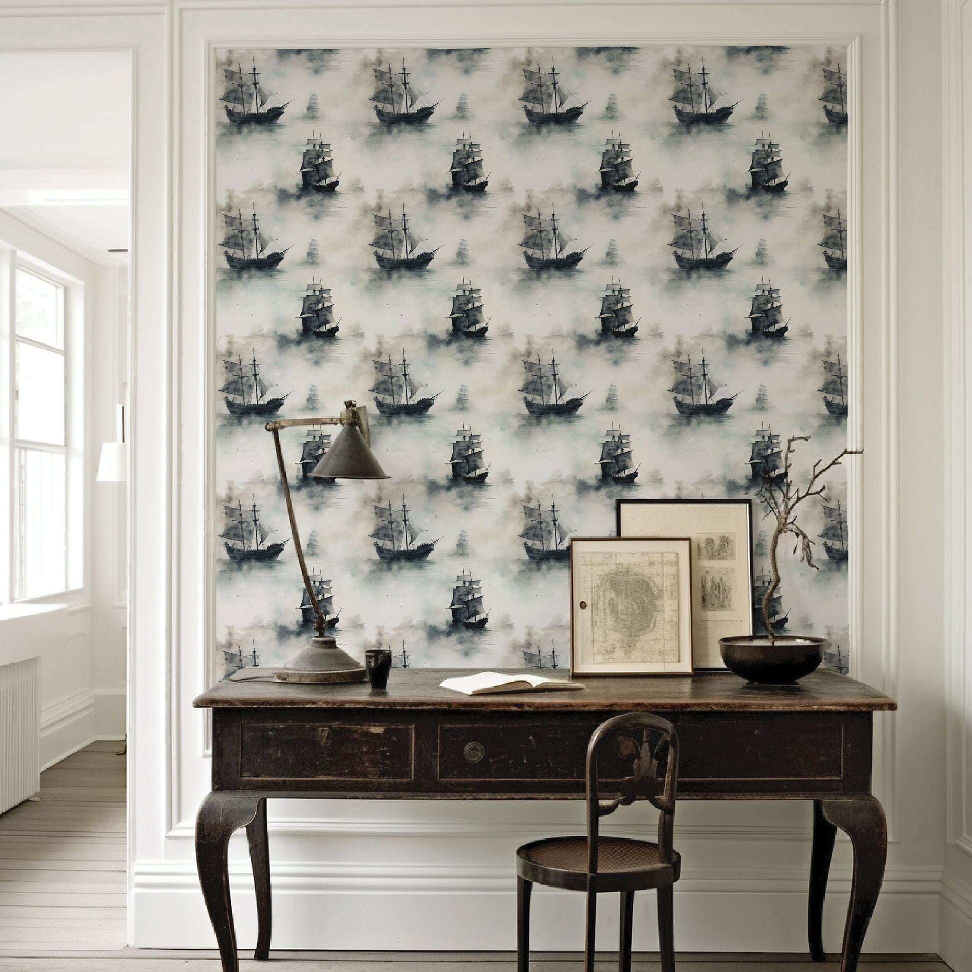In this quiet mist, time folds in on itself—ships glide past as if from another world, part ghost, part memory. This wallpaper captures the romance of fog-drenched mornings, where every ship is a story, and every room feels like the beginning of a tale.