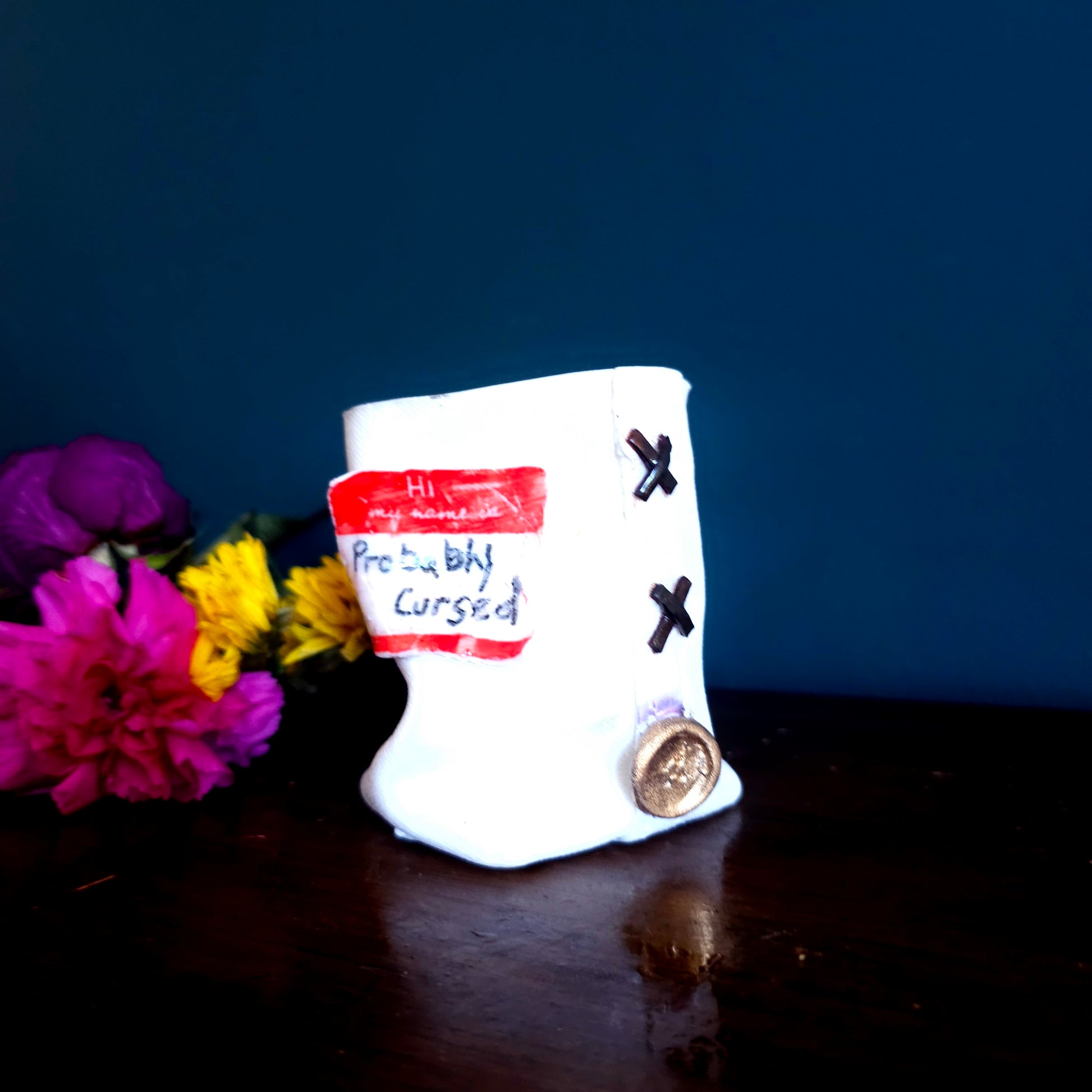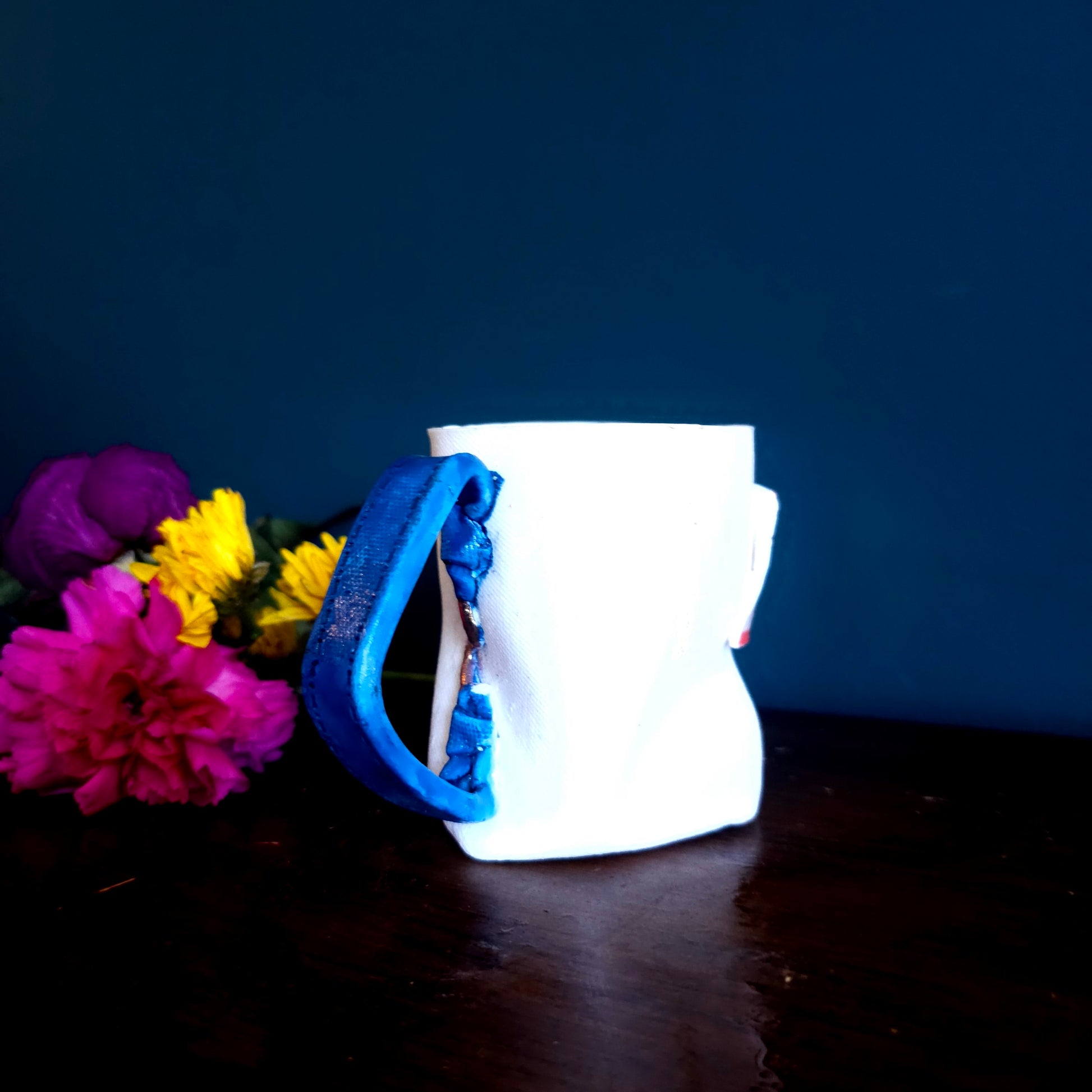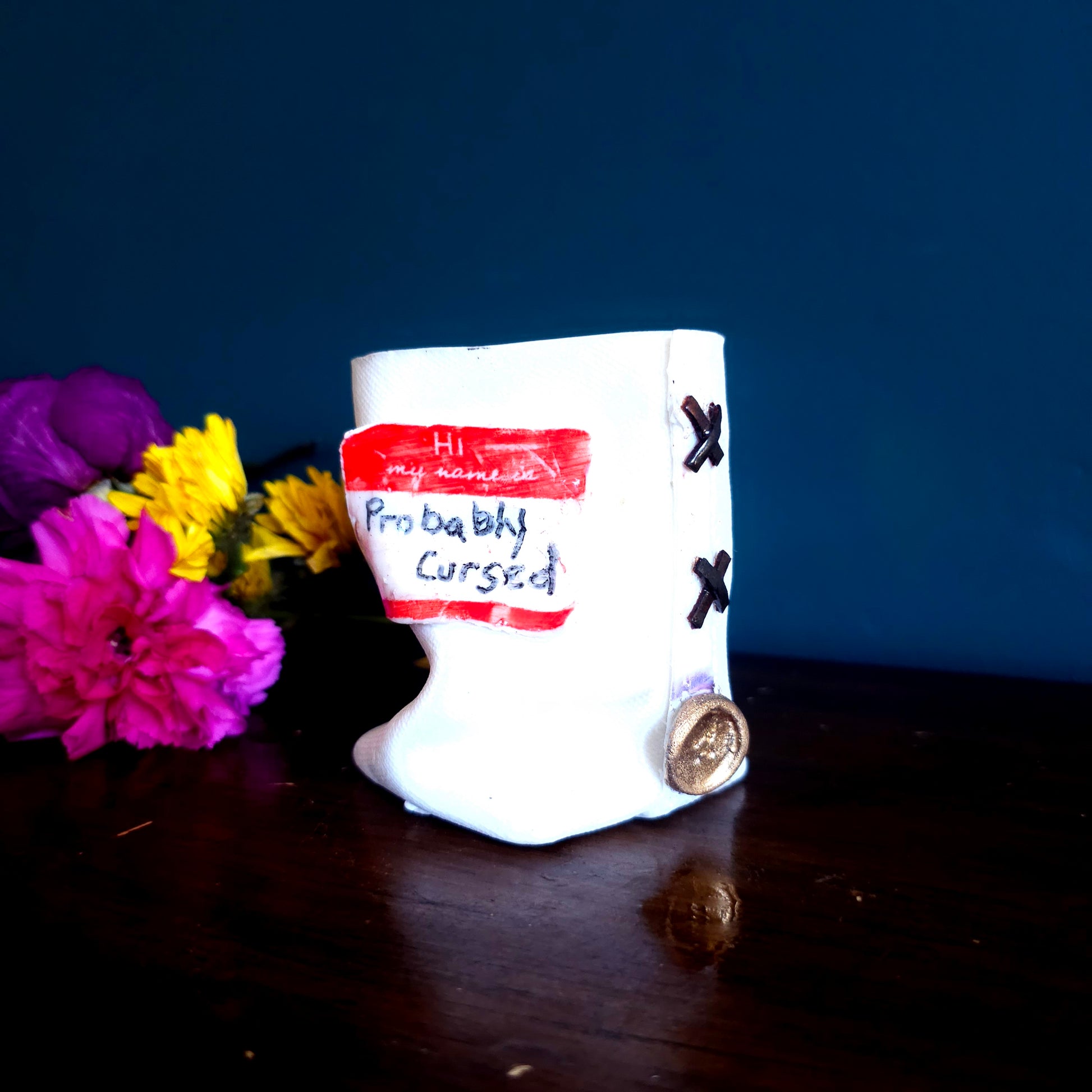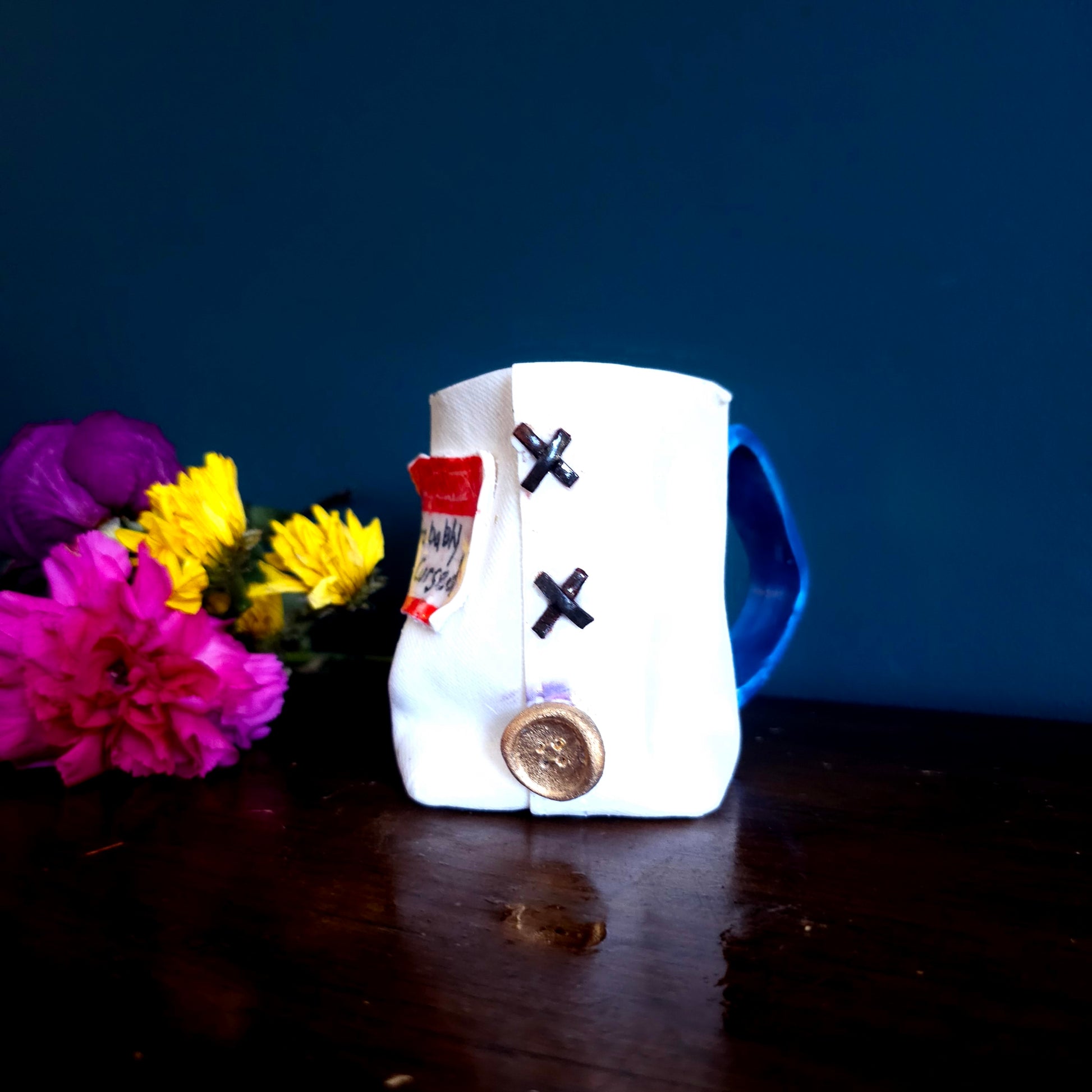 I created these mugs with the bends and shapes of a sweater that has been thrown on the floor for the millionth time. Some have patched holes from wear and tear, some are missing buttons. Some have worn name tags that have been torn off and stuck back on multiple times because you decided to wear your favourite sweater to an event that you didn’t want to attend, or just didn't like having to wear a name tag in the first place. But with these name tags you get to say how you actually feel.