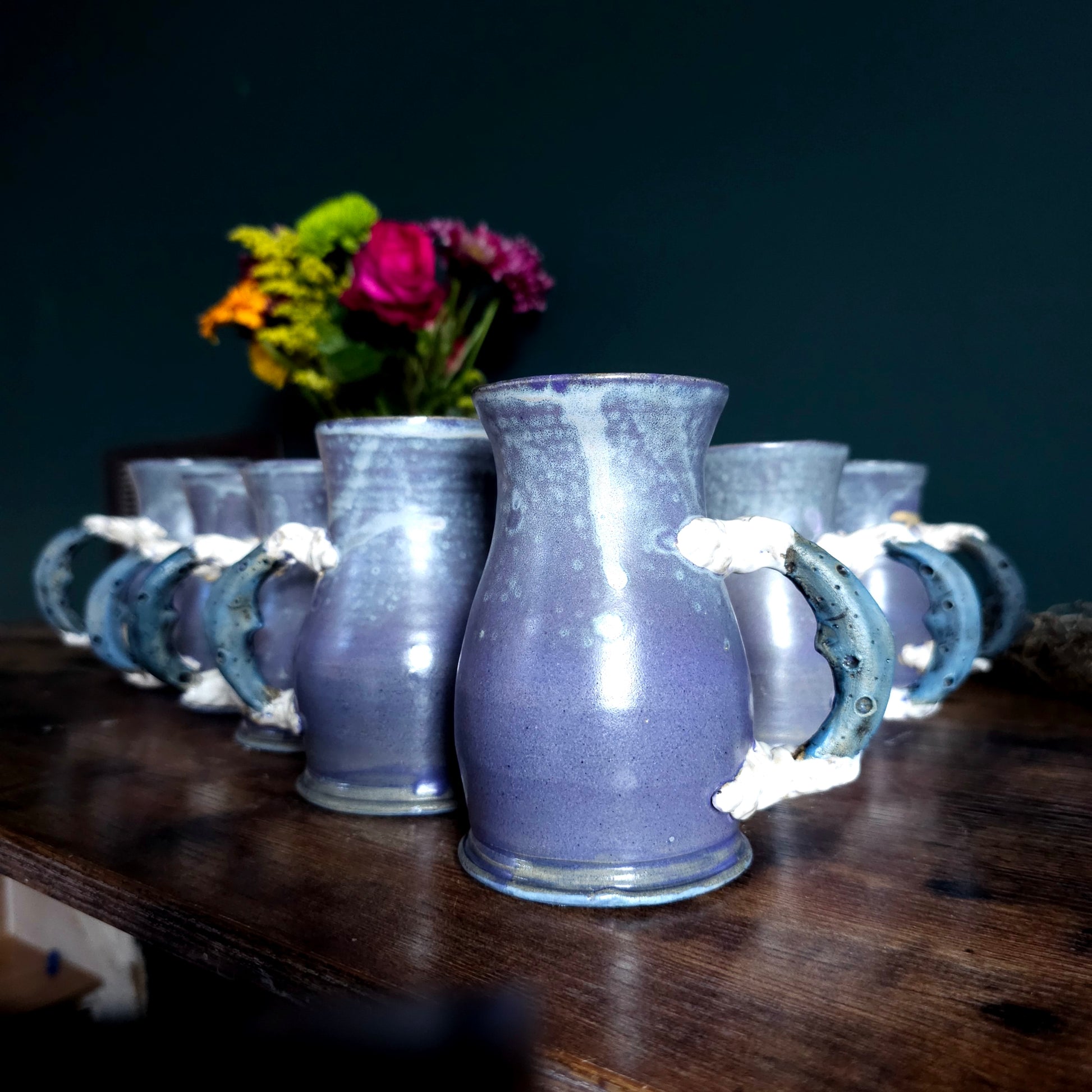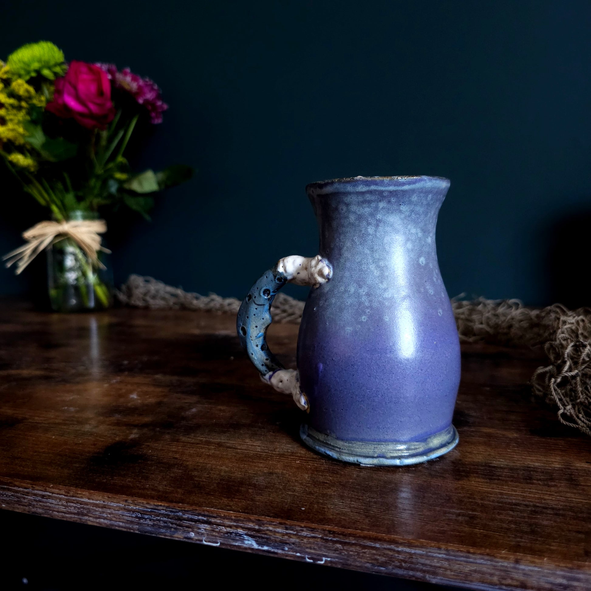Pour a little stardust into your life with my Lavender Sky Moon Mug, a wheel thrown piece glazed in dreamy gradients of moody lavender and starlit fog. Its curved silhouette feels grounded and organic, while the cratered, moon handle offers a magical, tactile connection to the cosmos.