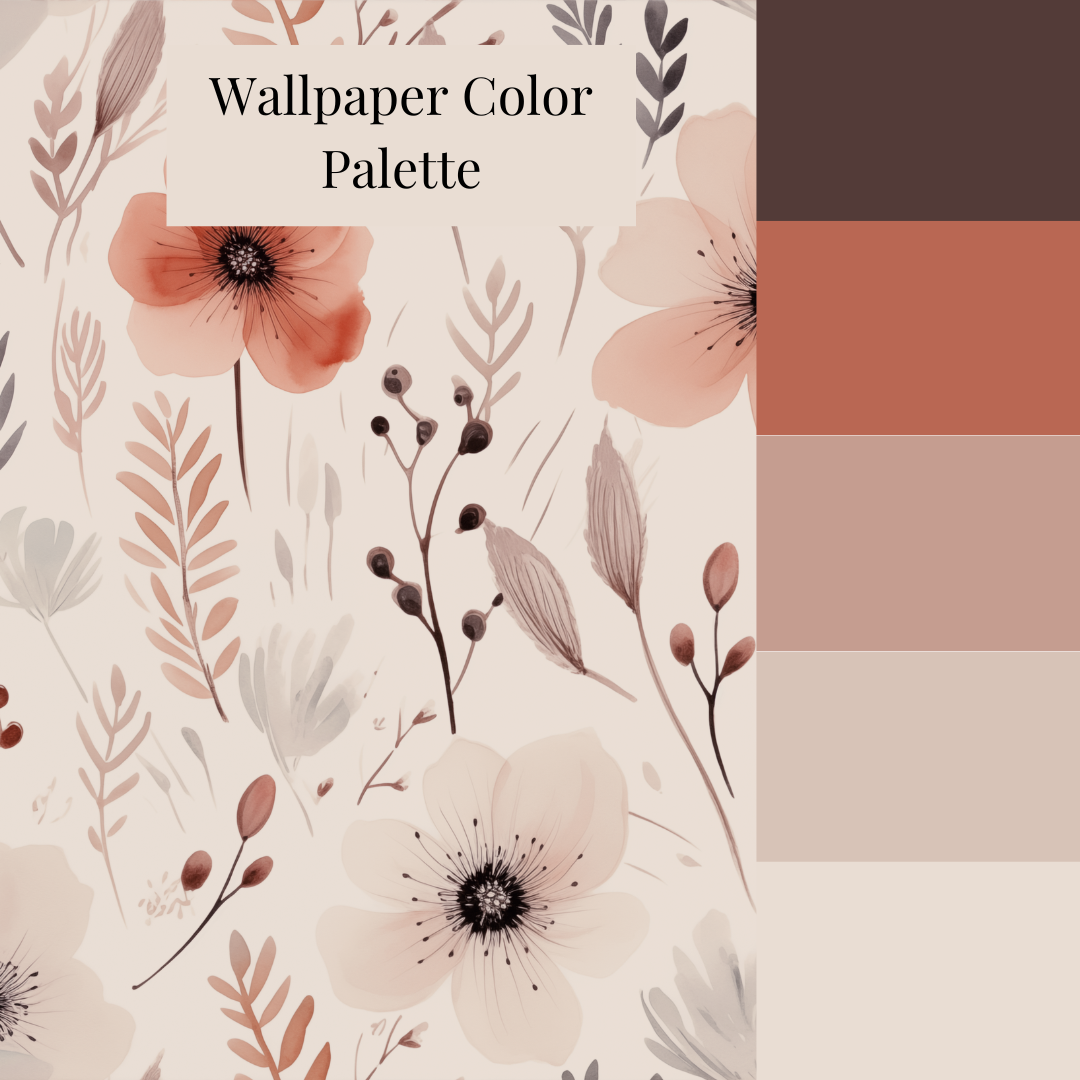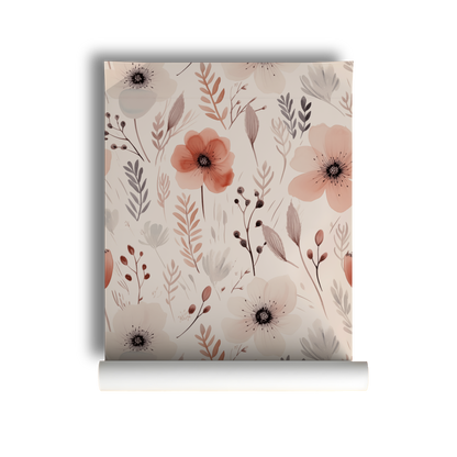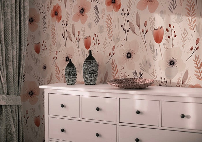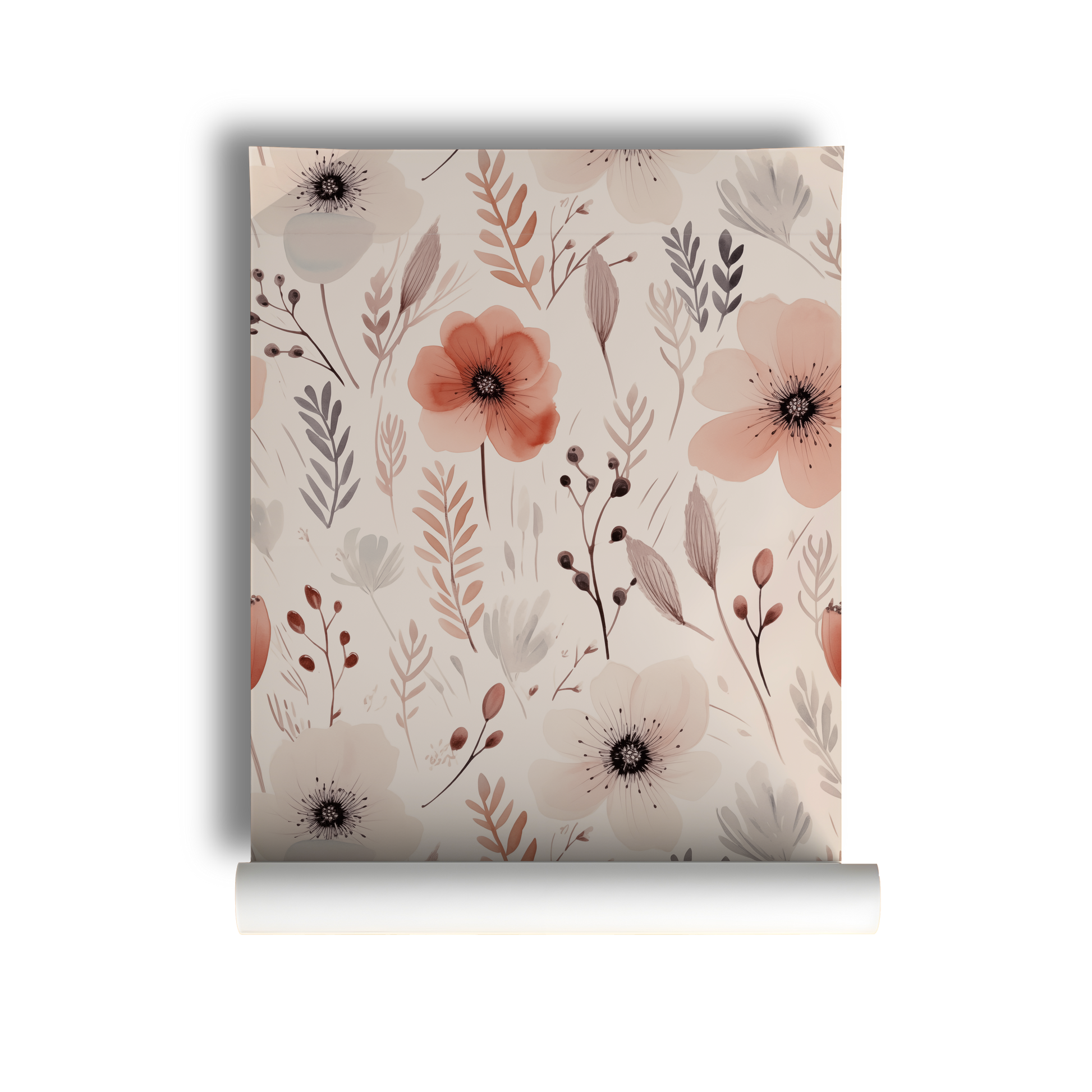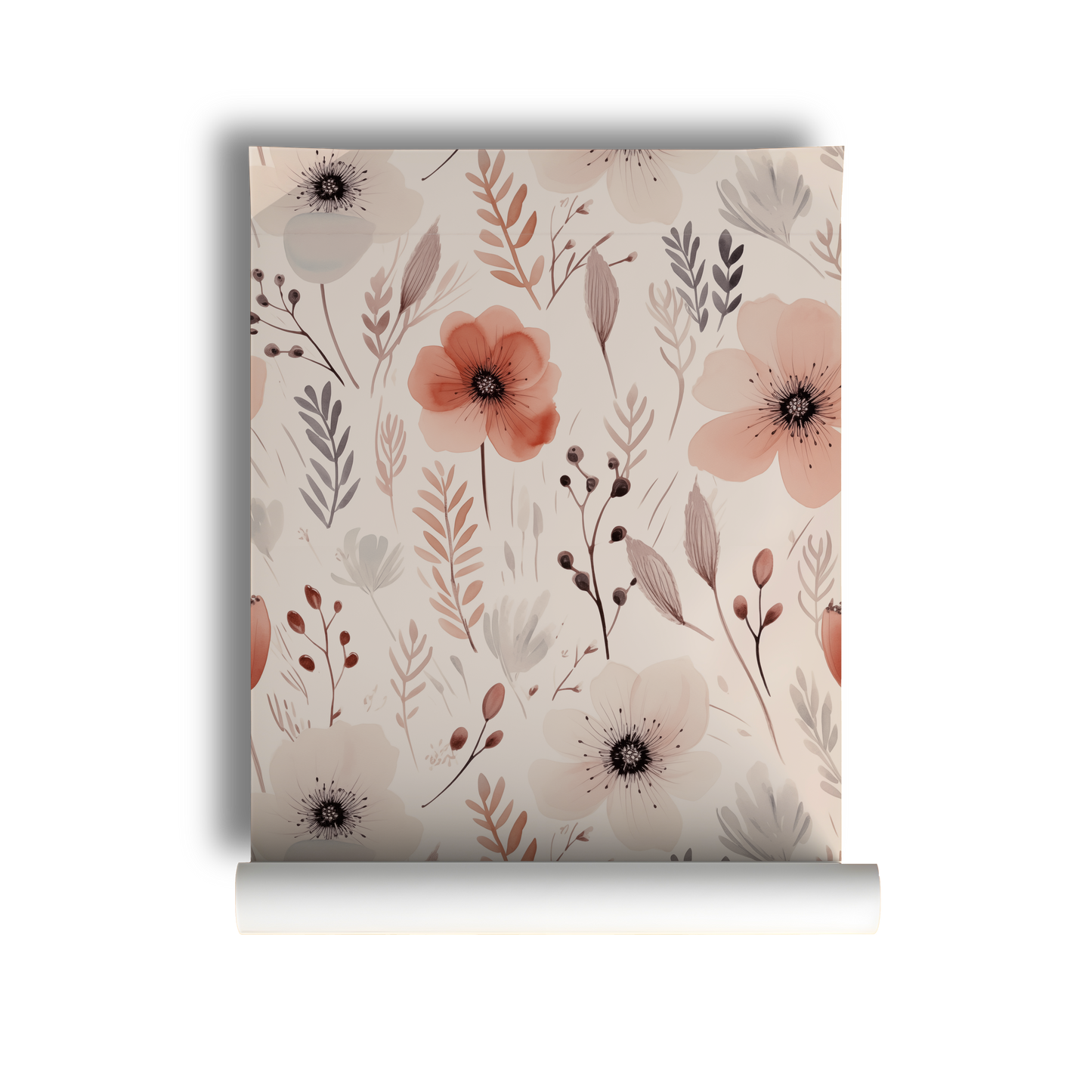 This design brings the feeling of a sun-warmed sketchbook—loose florals and wandering stems in soft blush, clay red, and dried lavender tones across a creamy backdrop. It’s airy but not sterile, minimal but still story-rich. Every petal feels painted by hand, offering subtle rhythm without overwhelming the space.