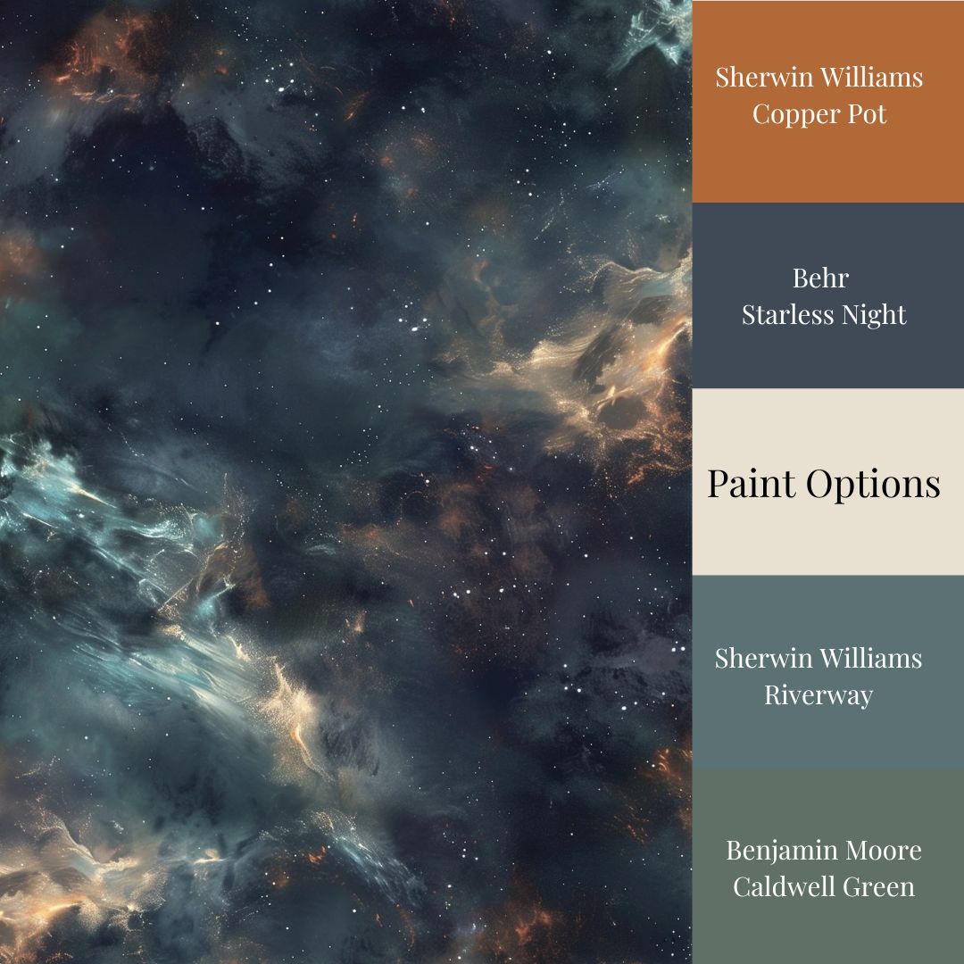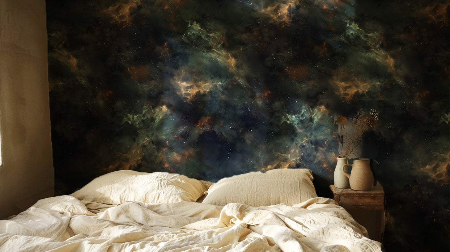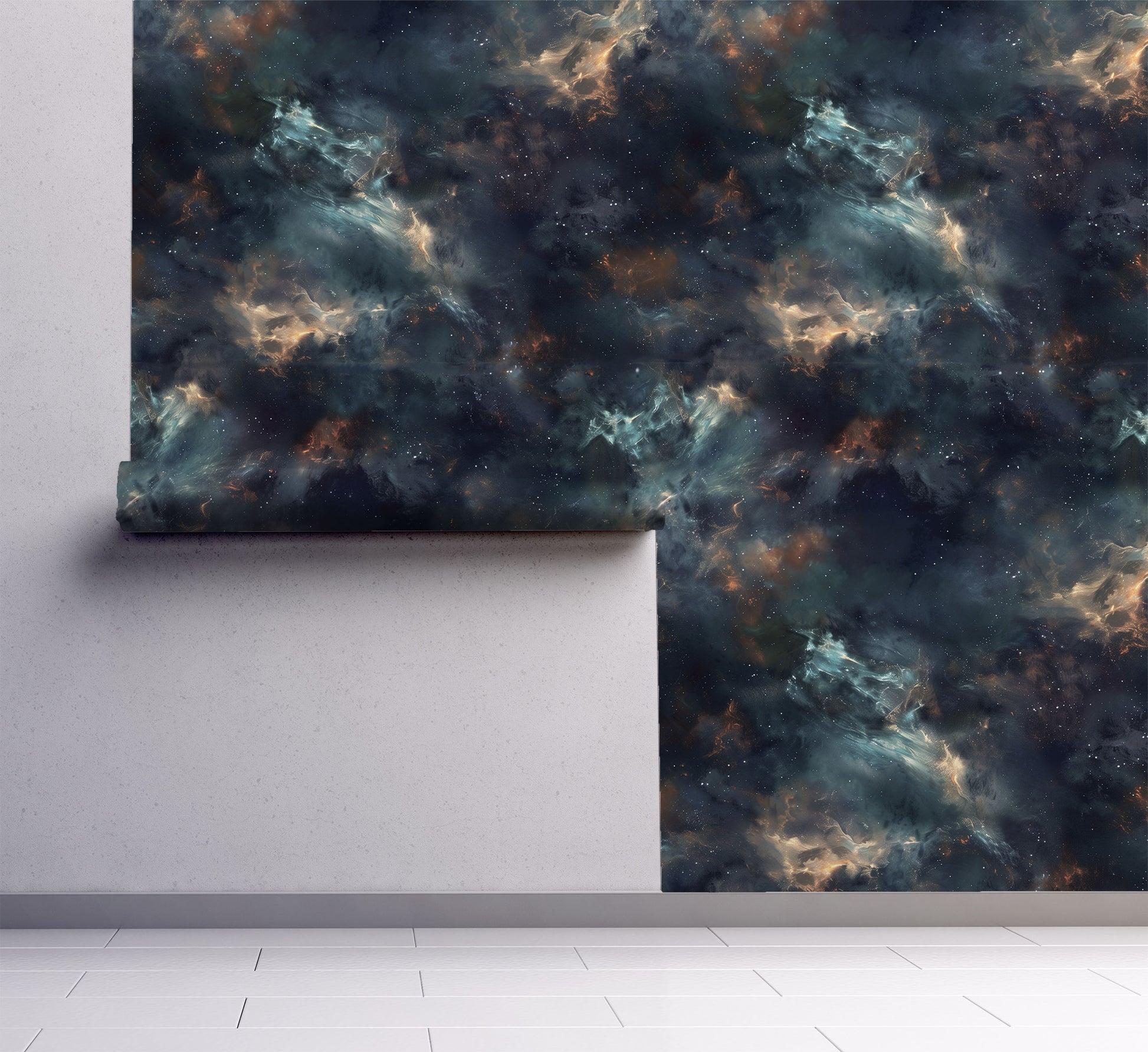 This design moves like a slow sky—swirls of ink-blue, copper, clouded gold, and teal shift through a star-filled expanse. There’s no beginning or edge, only motion and stillness living side by side. Inspired by the natural quiet of the cosmos, it brings a sense of infinite pause into grounded rooms.