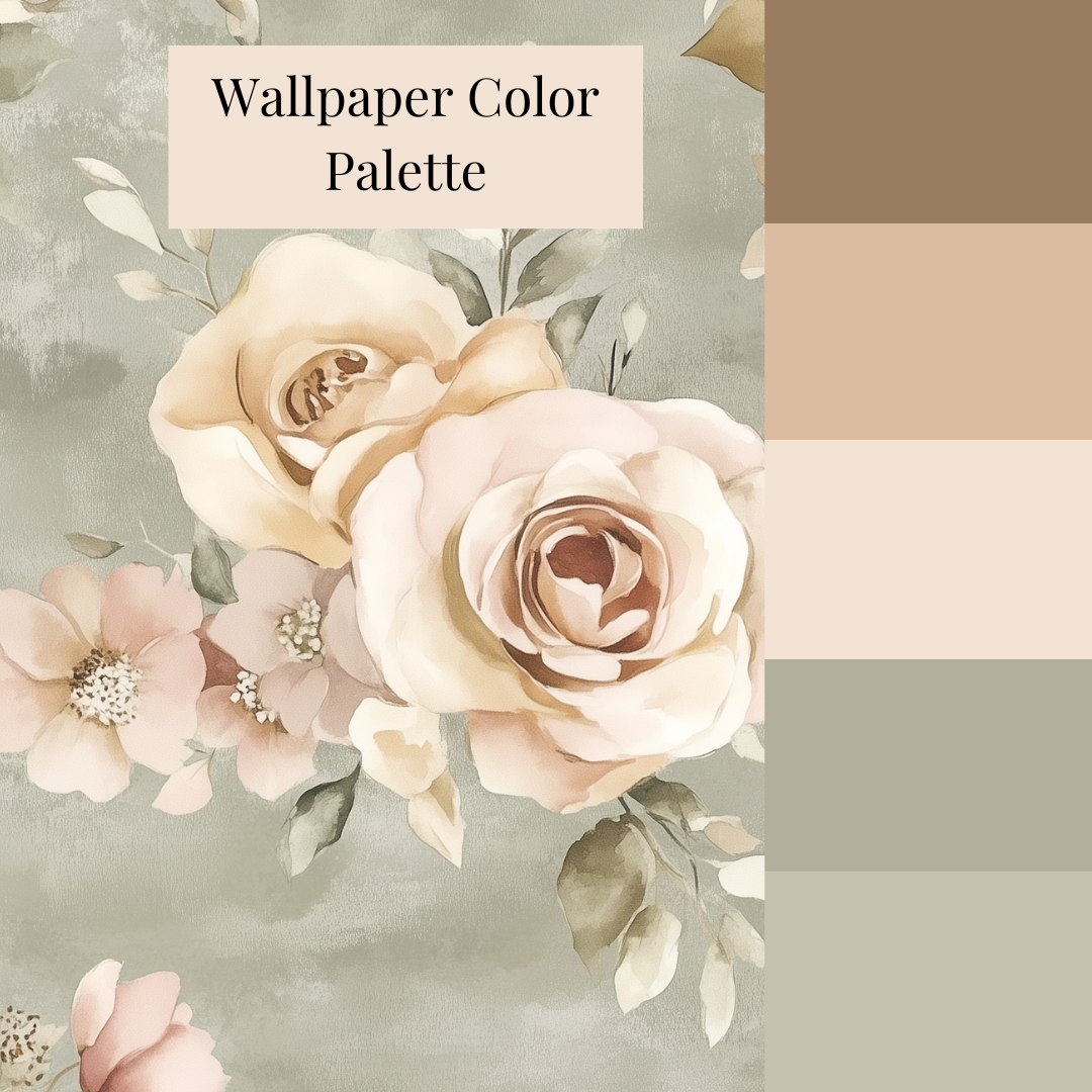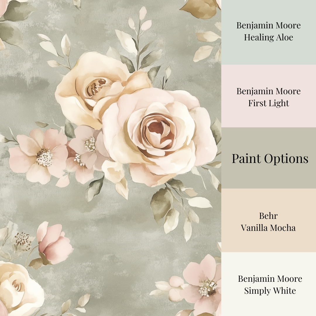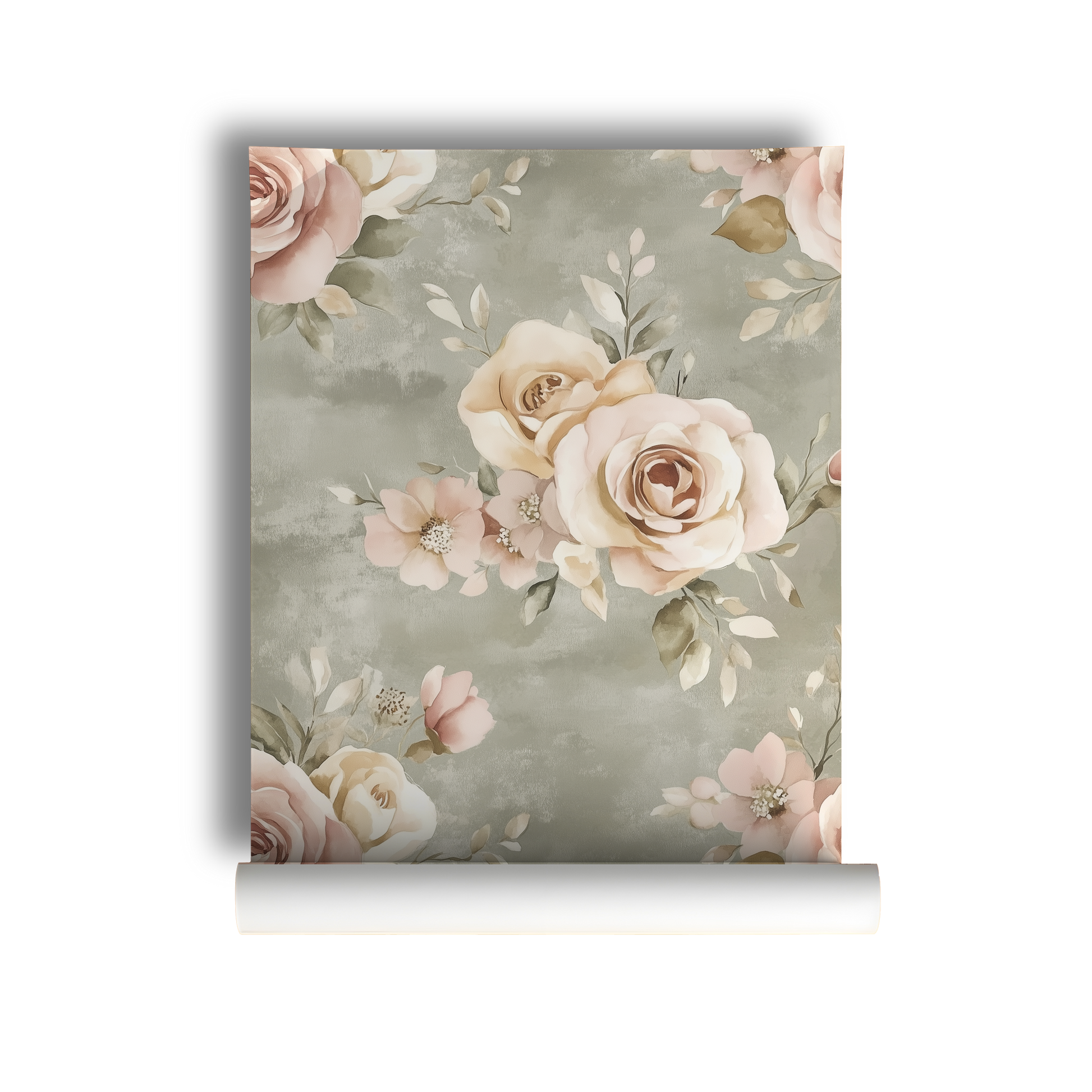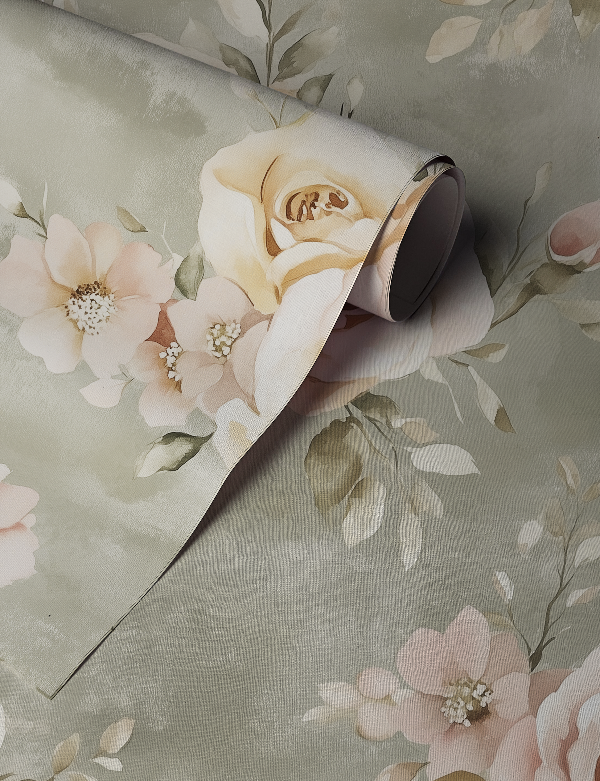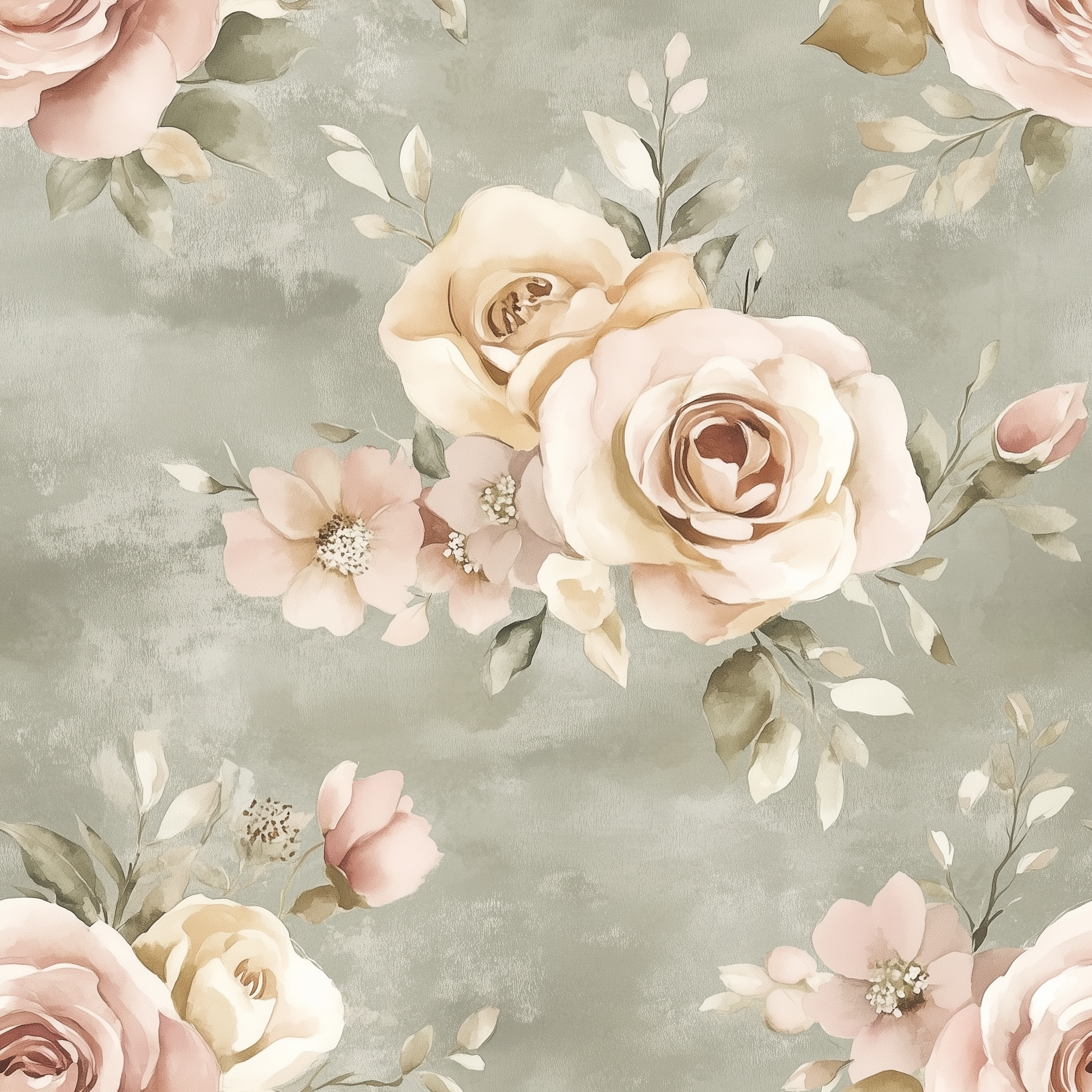This design is quietly intentional. Faded blush blossoms and pale cream roses soften against a sage-toned wash that looks like a painted sky before rain. Each detail feels gently aged, like a letter tucked in a drawer or a pressed flower forgotten in a book.