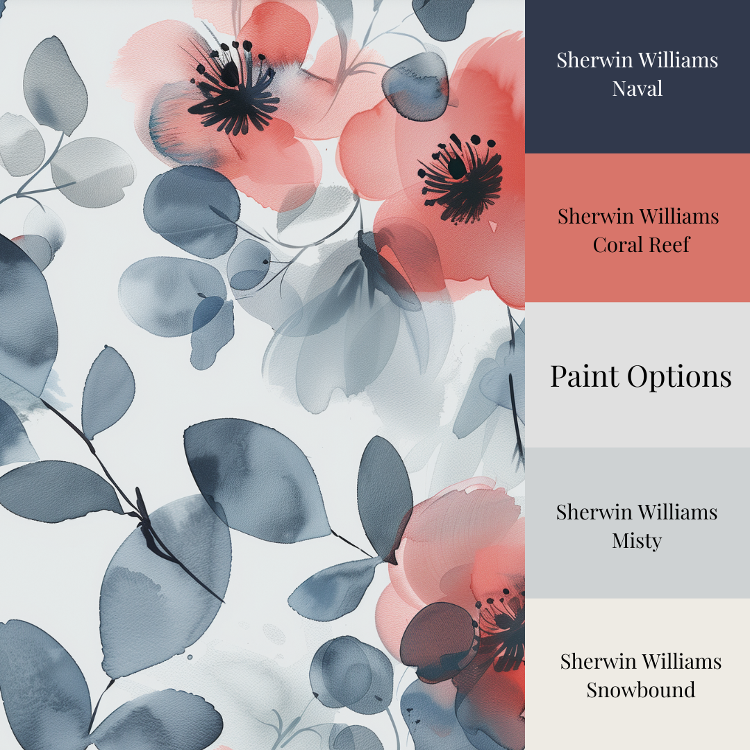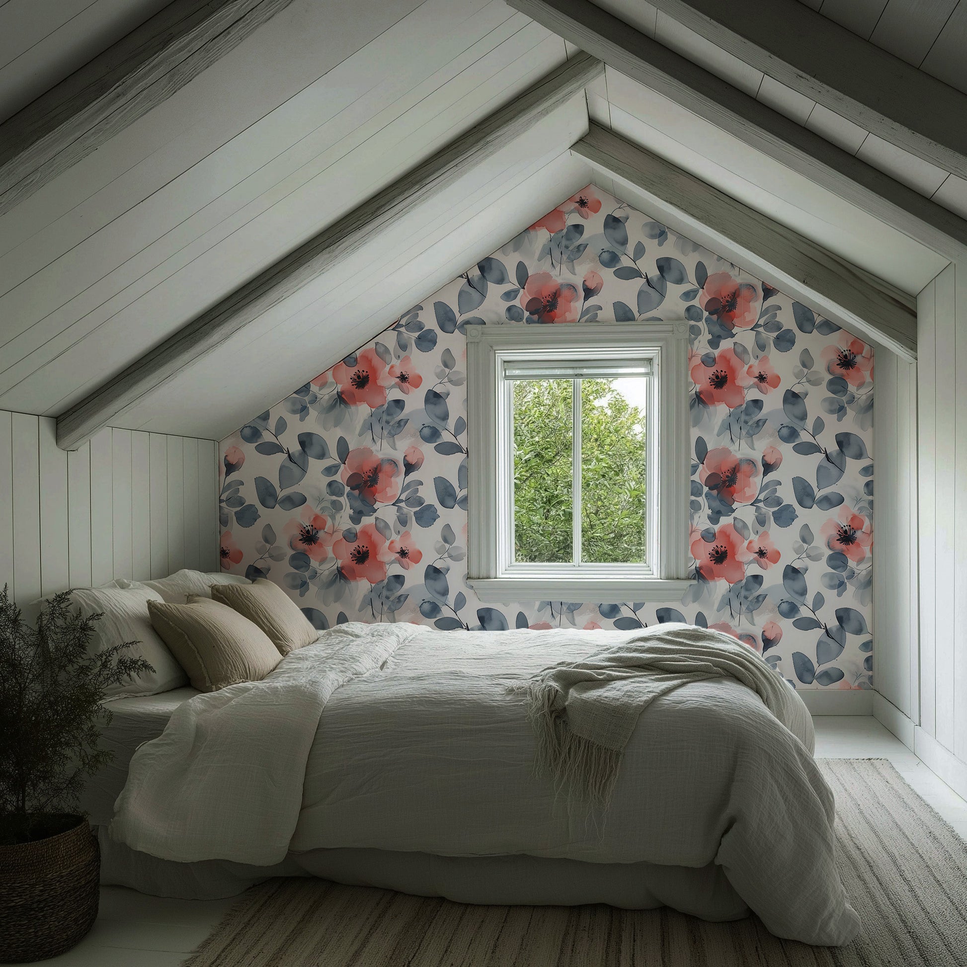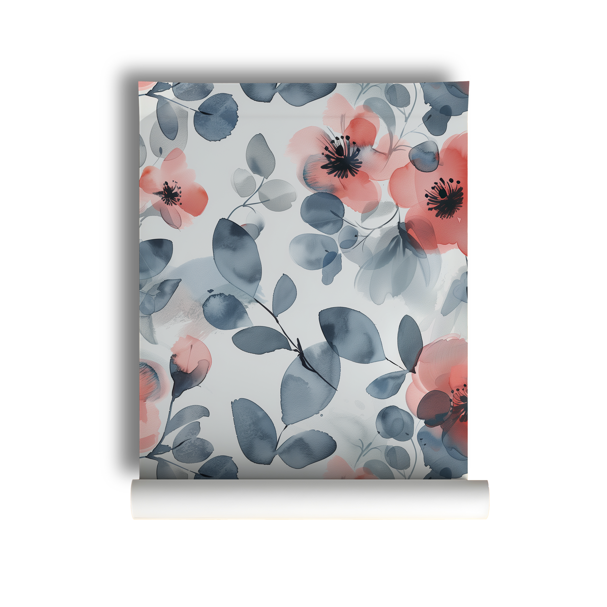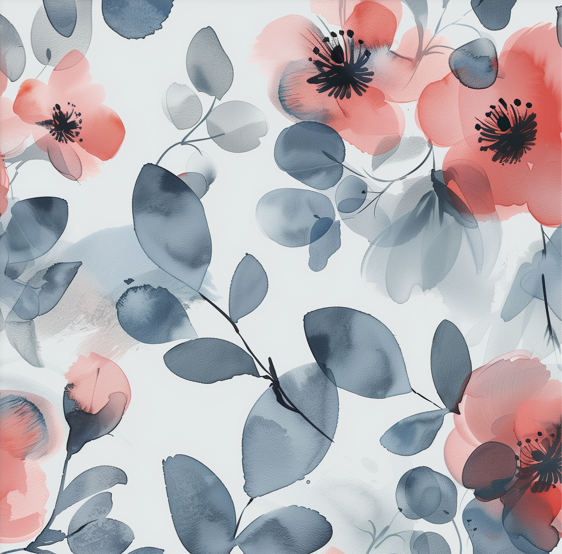 This design captures a moment of defiance—like wild poppies blooming through stone. Watercolor petals in coral red burst across an ivory sky, grounded by moody eucalyptus leaves in inky blues and storm greys. It’s a story of contrast, resilience, and quiet rebellion wrapped in floral softness.