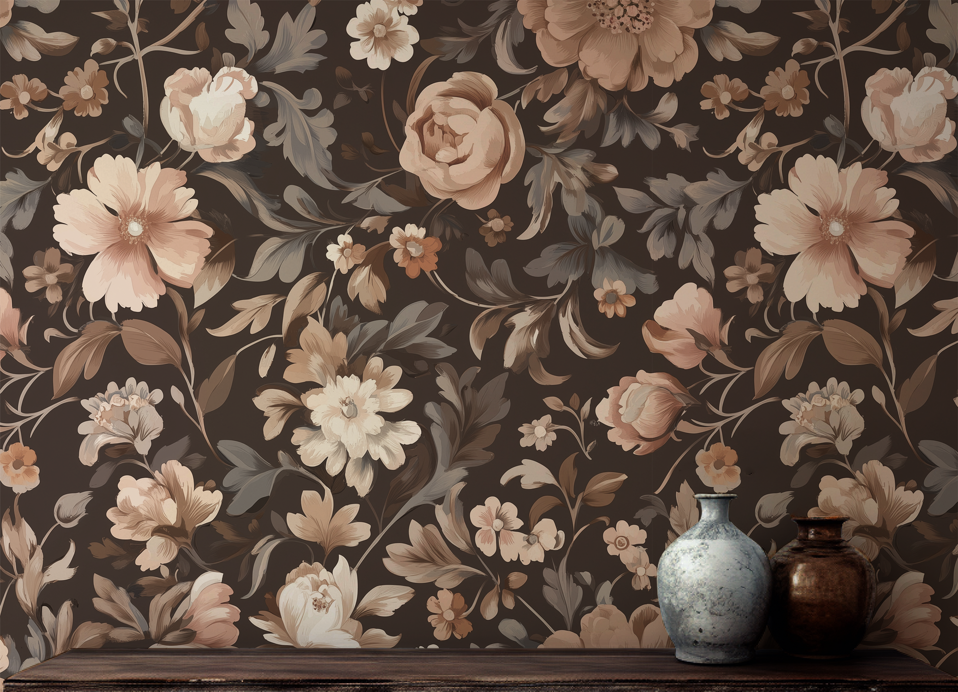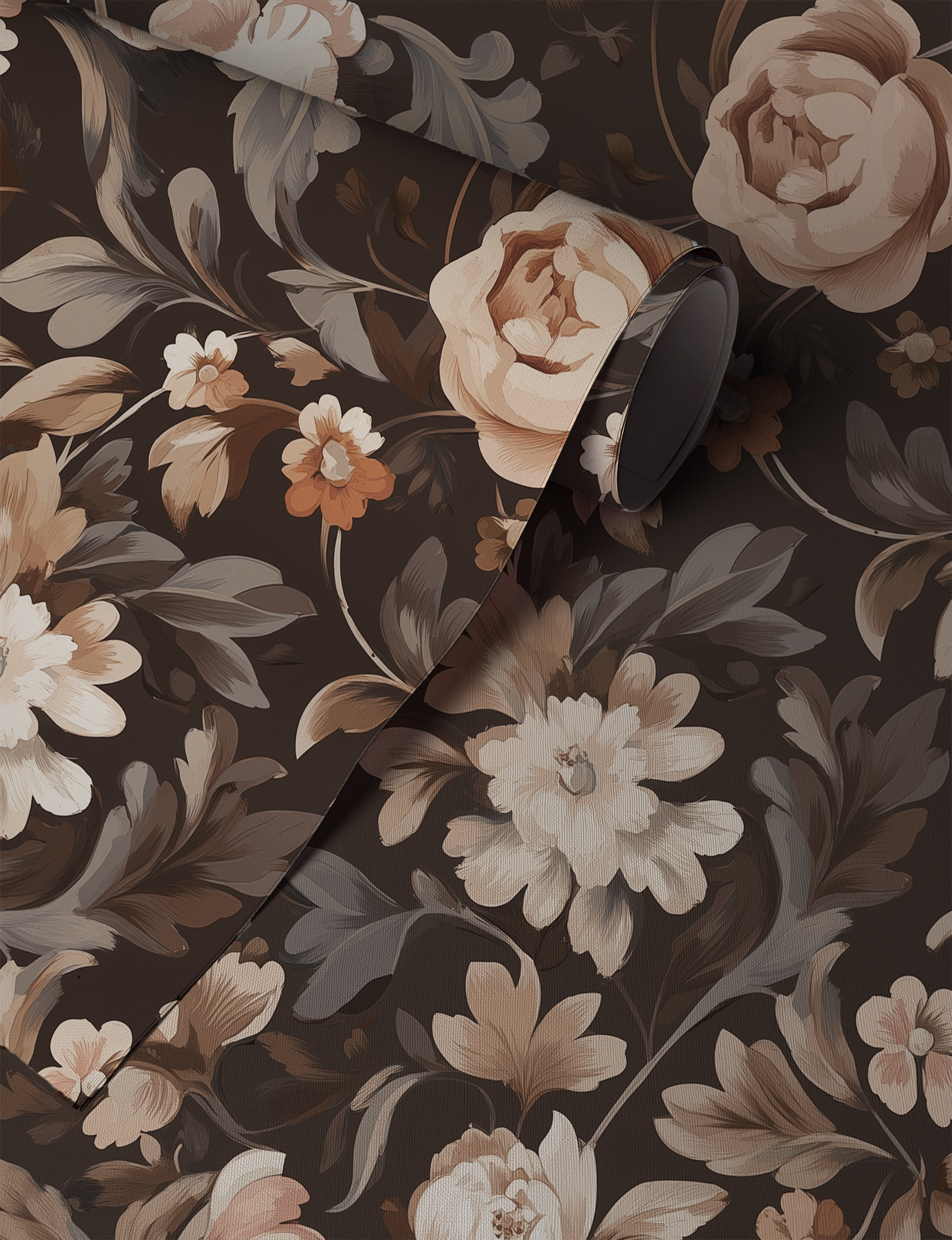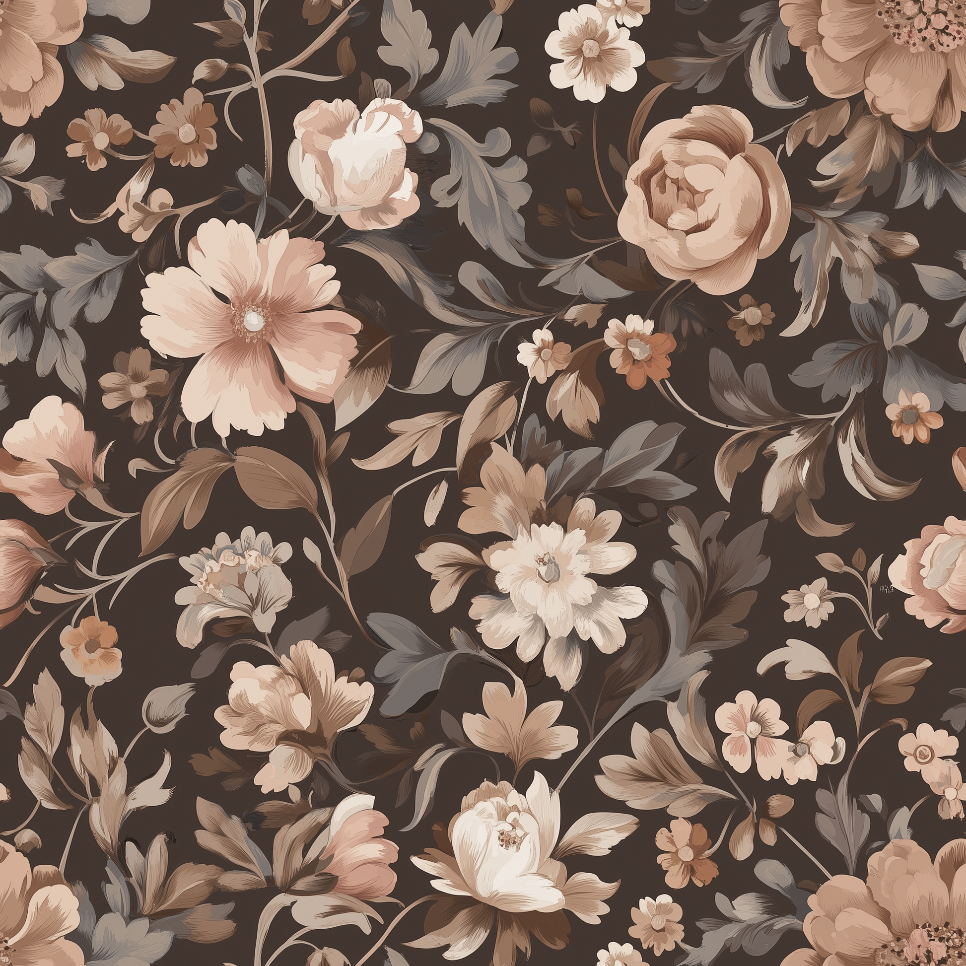 This design carries the softness of age—muted blush petals, bone-white florals, and warm taupe leaves spill over a backdrop of deep brown, like a faded textile kept folded in a cedar chest. There’s something familiar here: a quiet nostalgia wrapped in layered brushstrokes and gentle contrast.