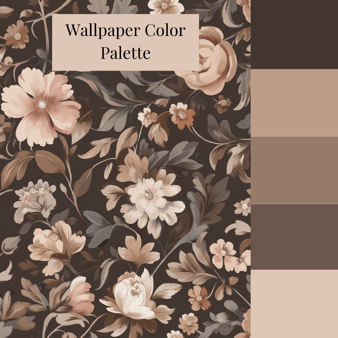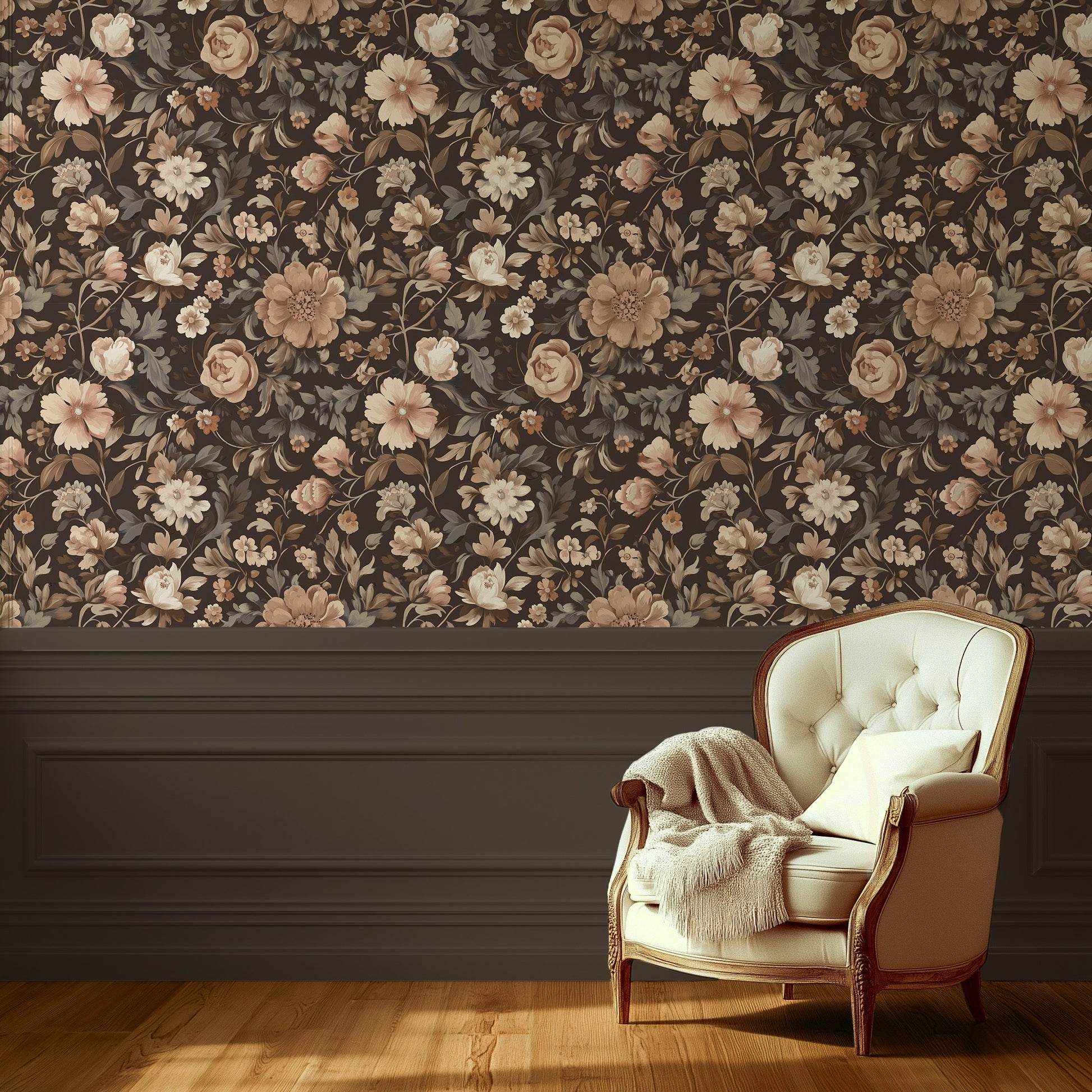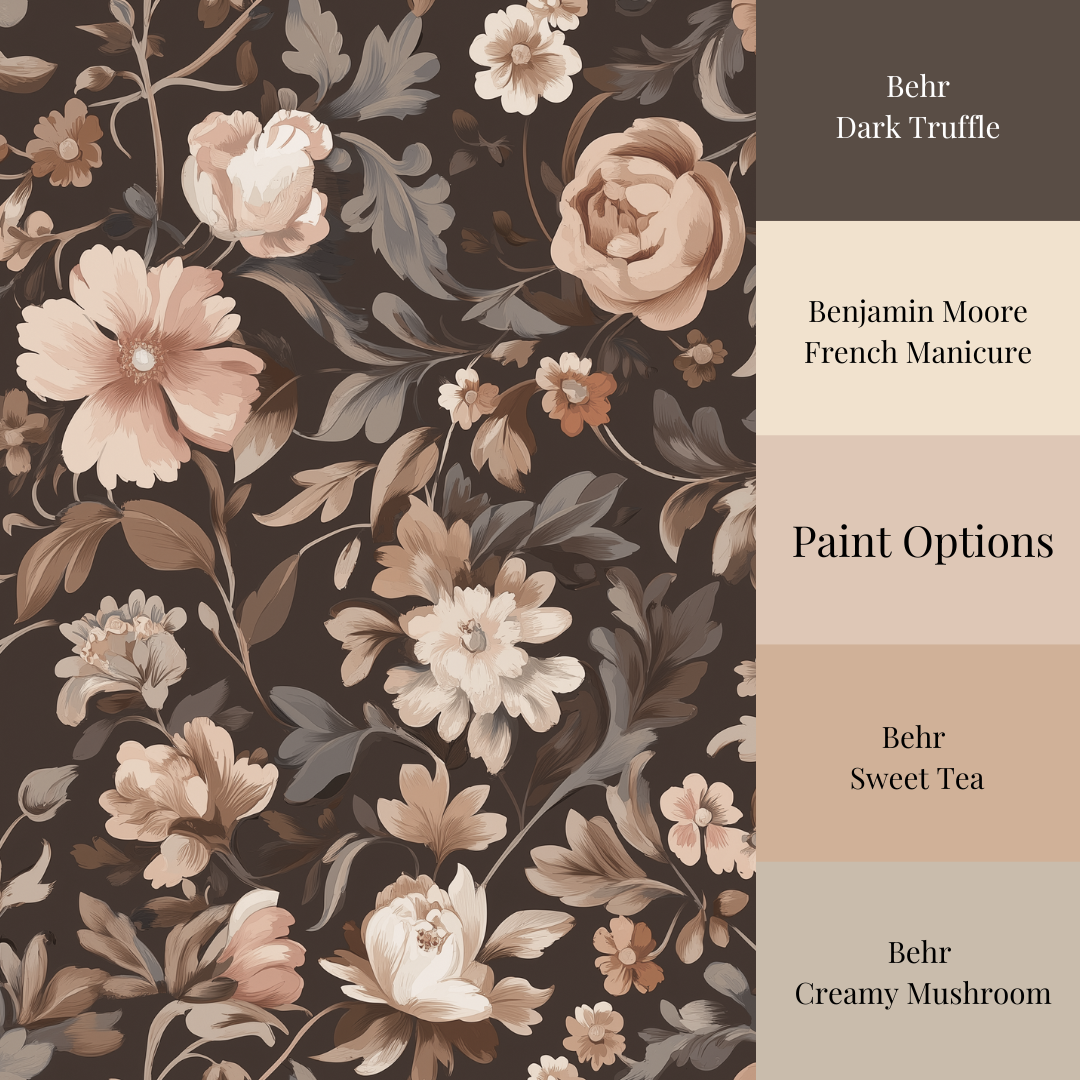 This design carries the softness of age—muted blush petals, bone-white florals, and warm taupe leaves spill over a backdrop of deep brown, like a faded textile kept folded in a cedar chest. There’s something familiar here: a quiet nostalgia wrapped in layered brushstrokes and gentle contrast.