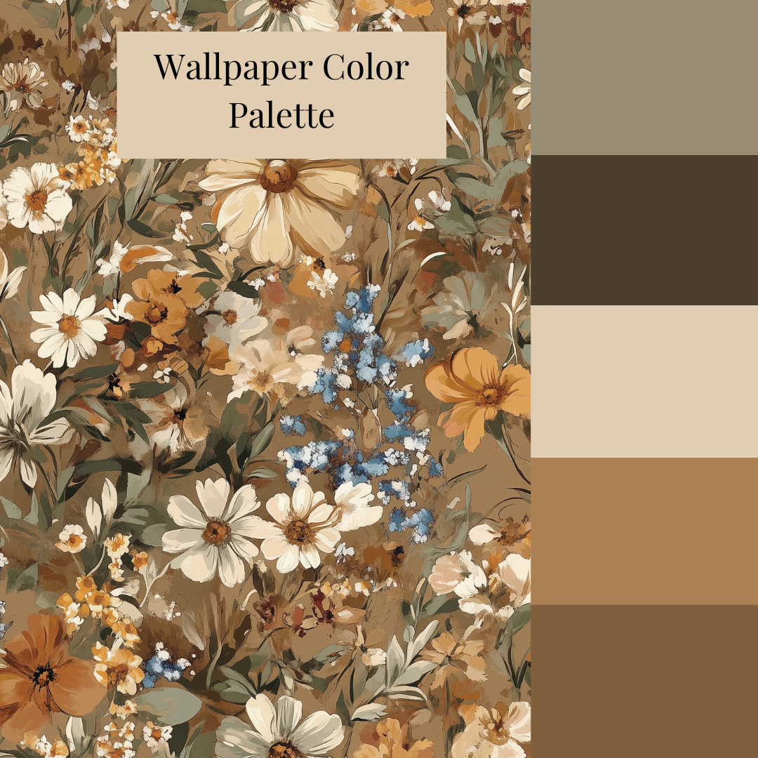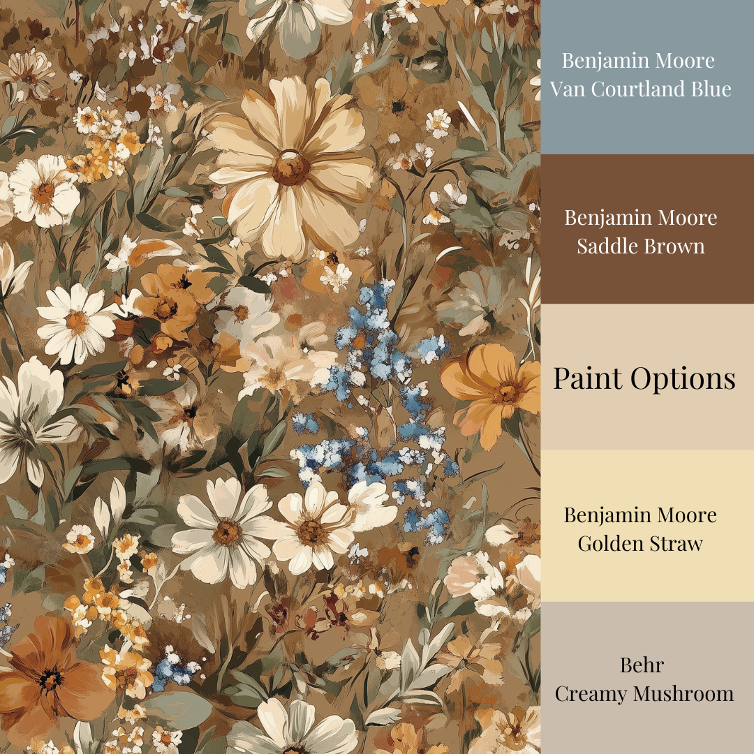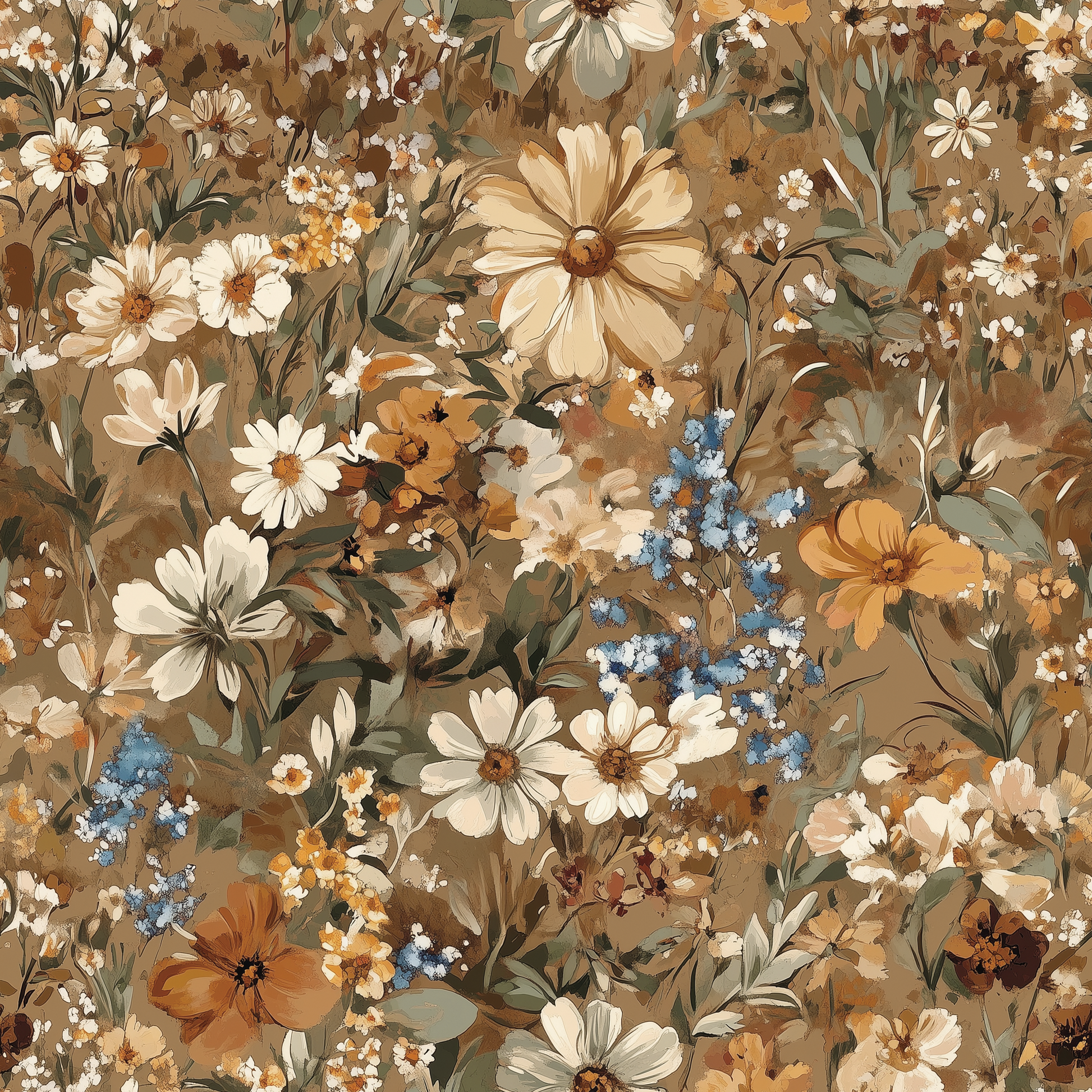 This design feels sun-warmed and wind-swept—daisies, buttercups, cornflowers, and forget-me-nots bloom in painterly layers across a golden brown backdrop. The palette is rooted in dry grass and late summer skies: warm ochre, soft ivory, muted sage, and vivid blue. It’s unpolished on purpose—loose, textured, and full of movement.