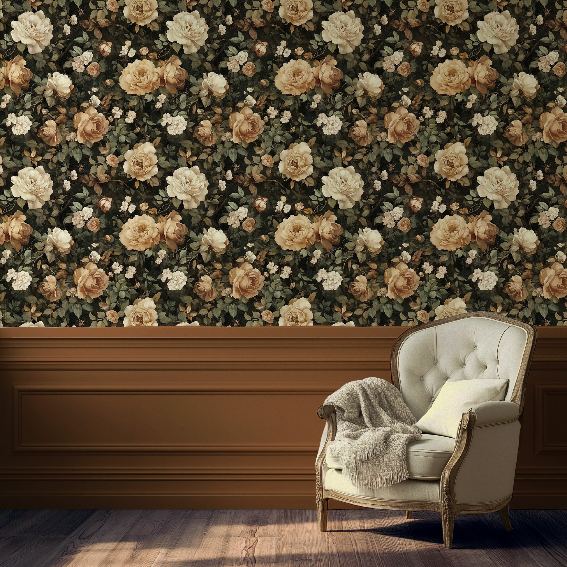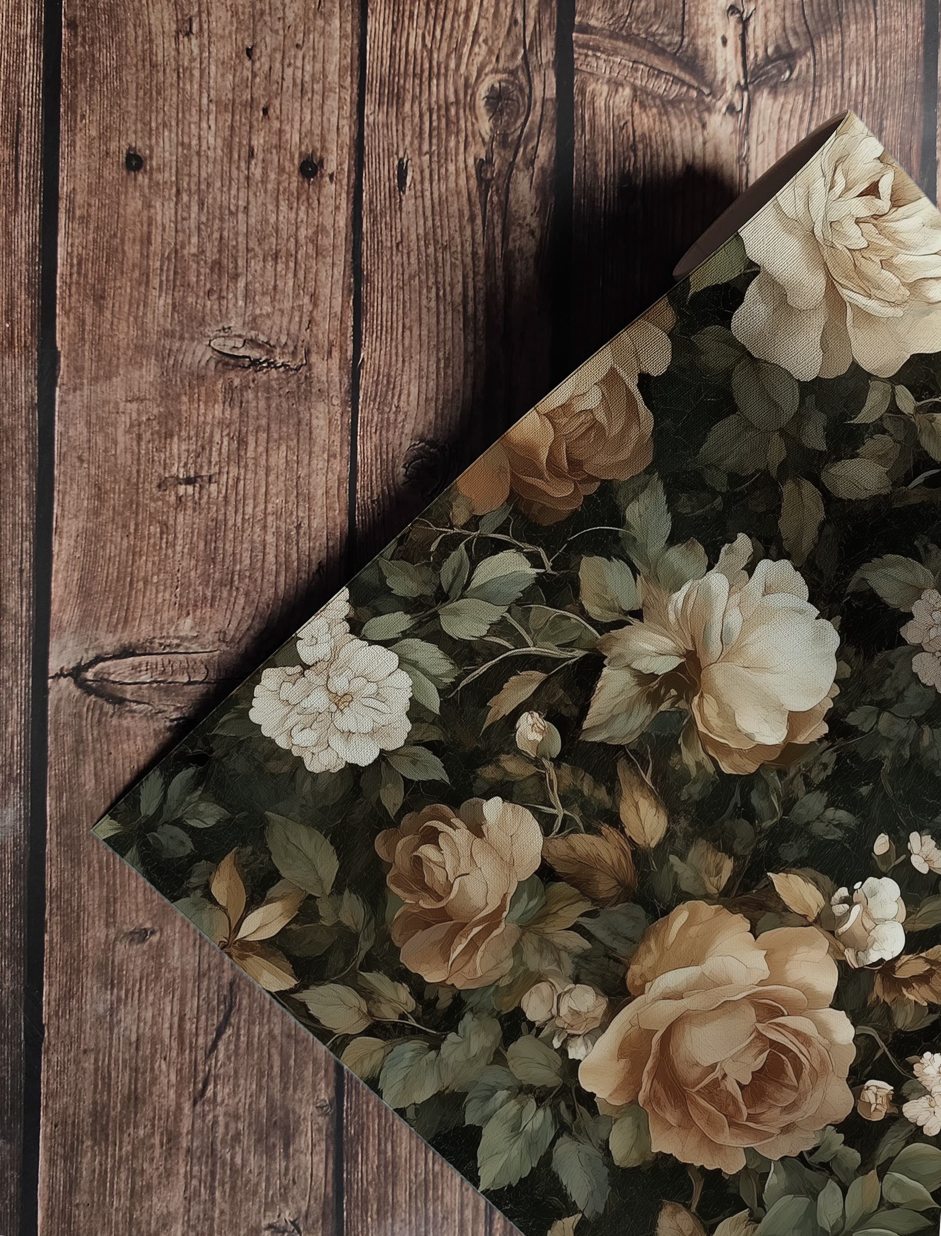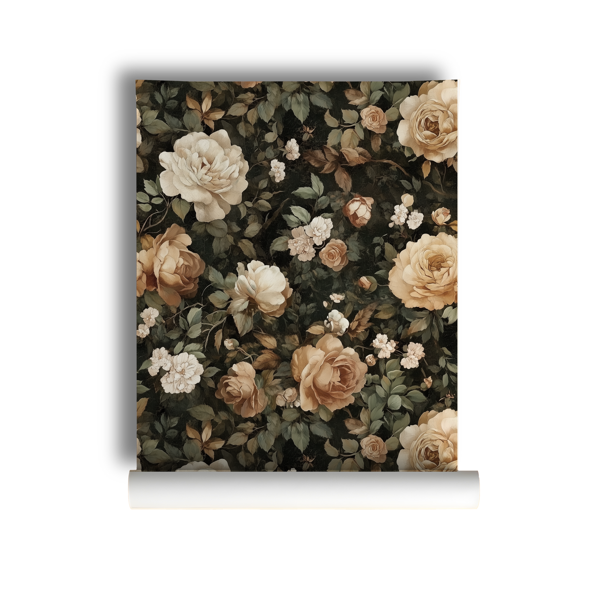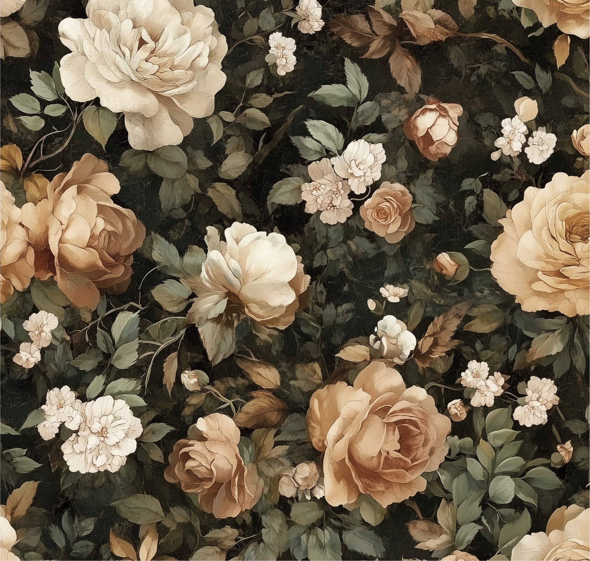 Cream and sepia-toned blooms open gently against a deep, moody backdrop, like they’ve only just woken from a long, luxurious dream. The palette is soft but grounded, romantic without sweetness. It feels like a memory too precious to speak aloud.