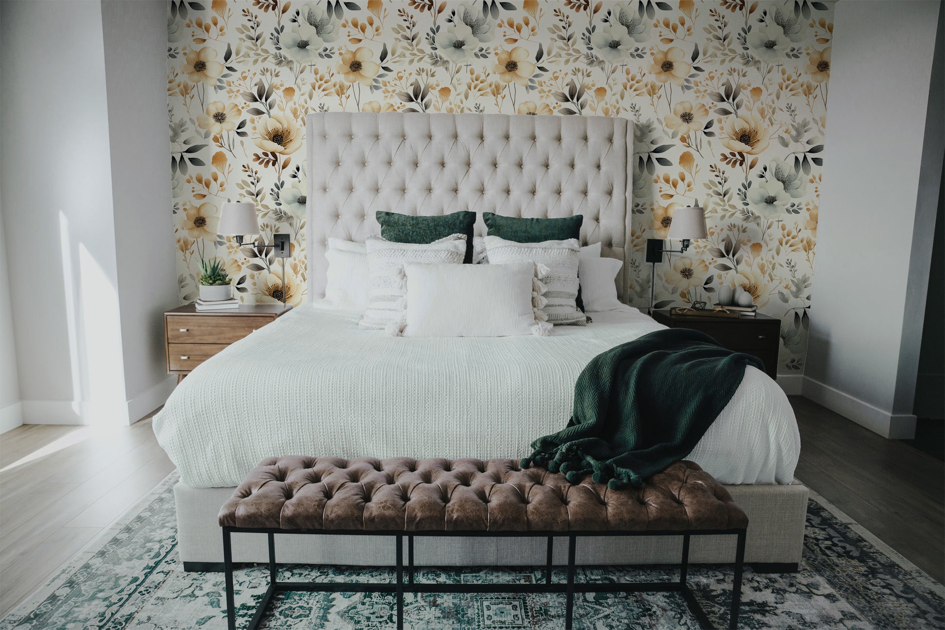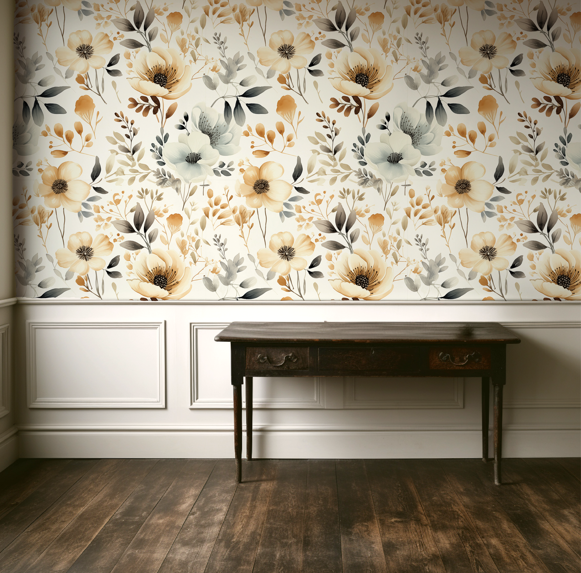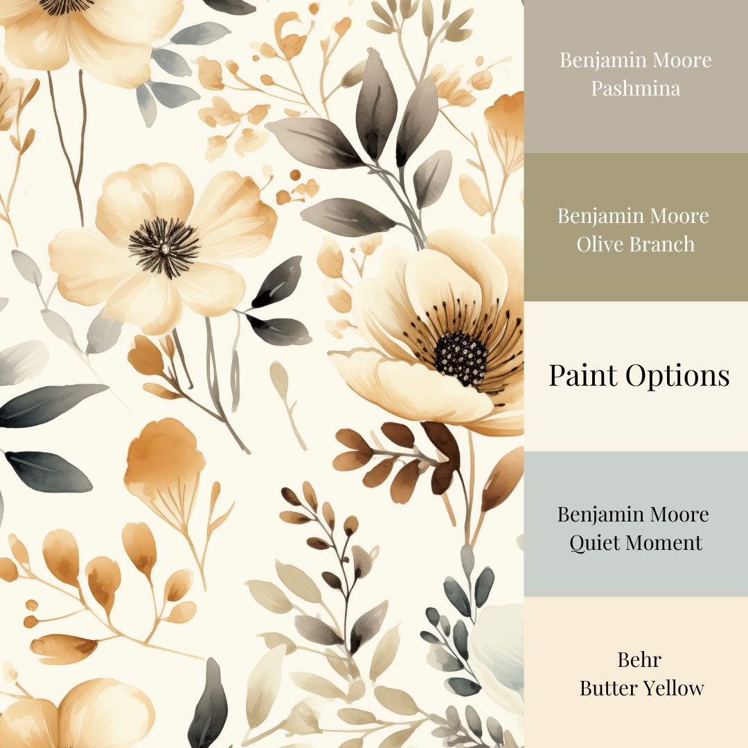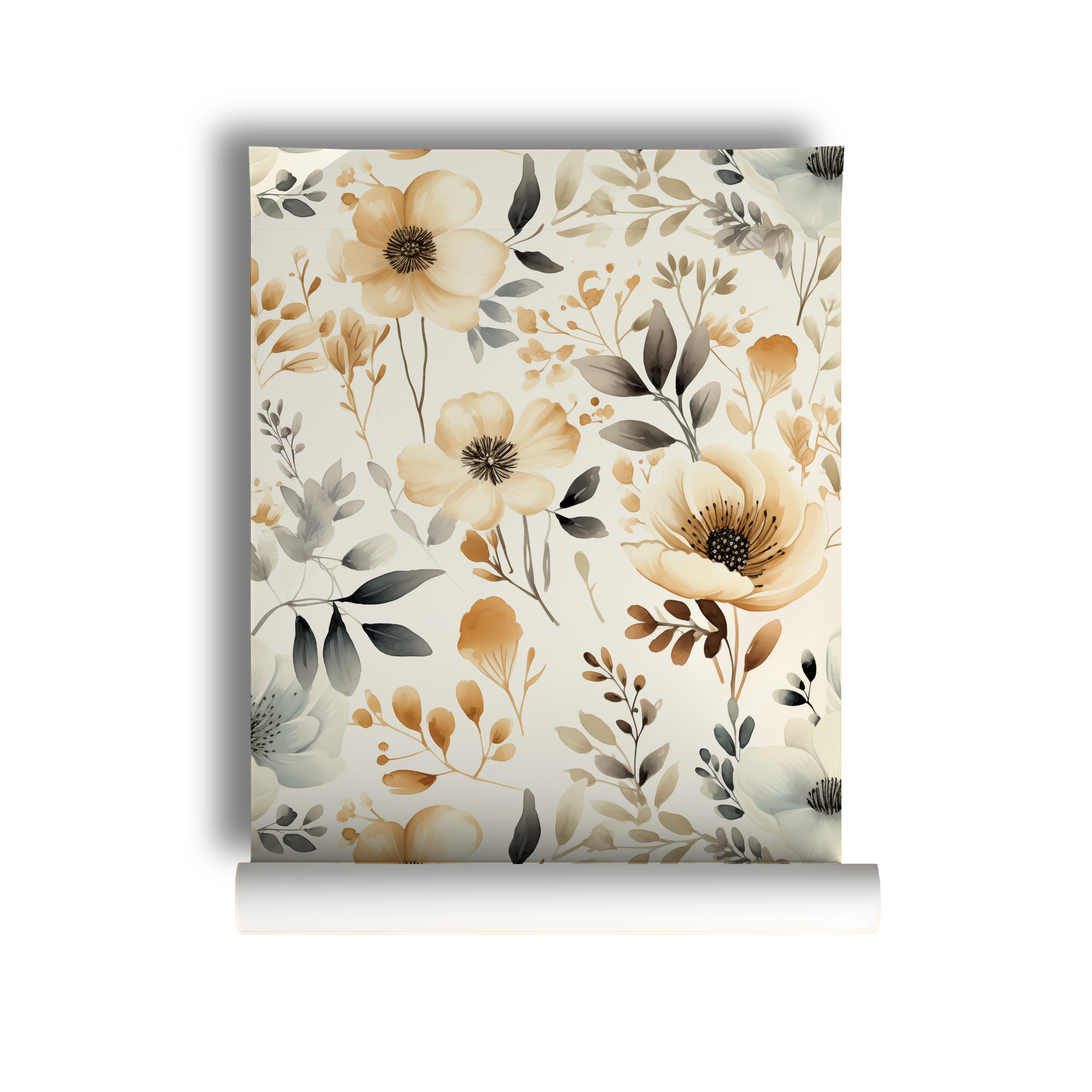 There’s a quiet kind of magic in that hour before dusk—when everything glows golden and shadows stretch softly across the garden. That fleeting moment inspired this design. Sun-washed petals and inky leaves drift across a pale parchment ground like pressed flowers kept safe in a forgotten book.