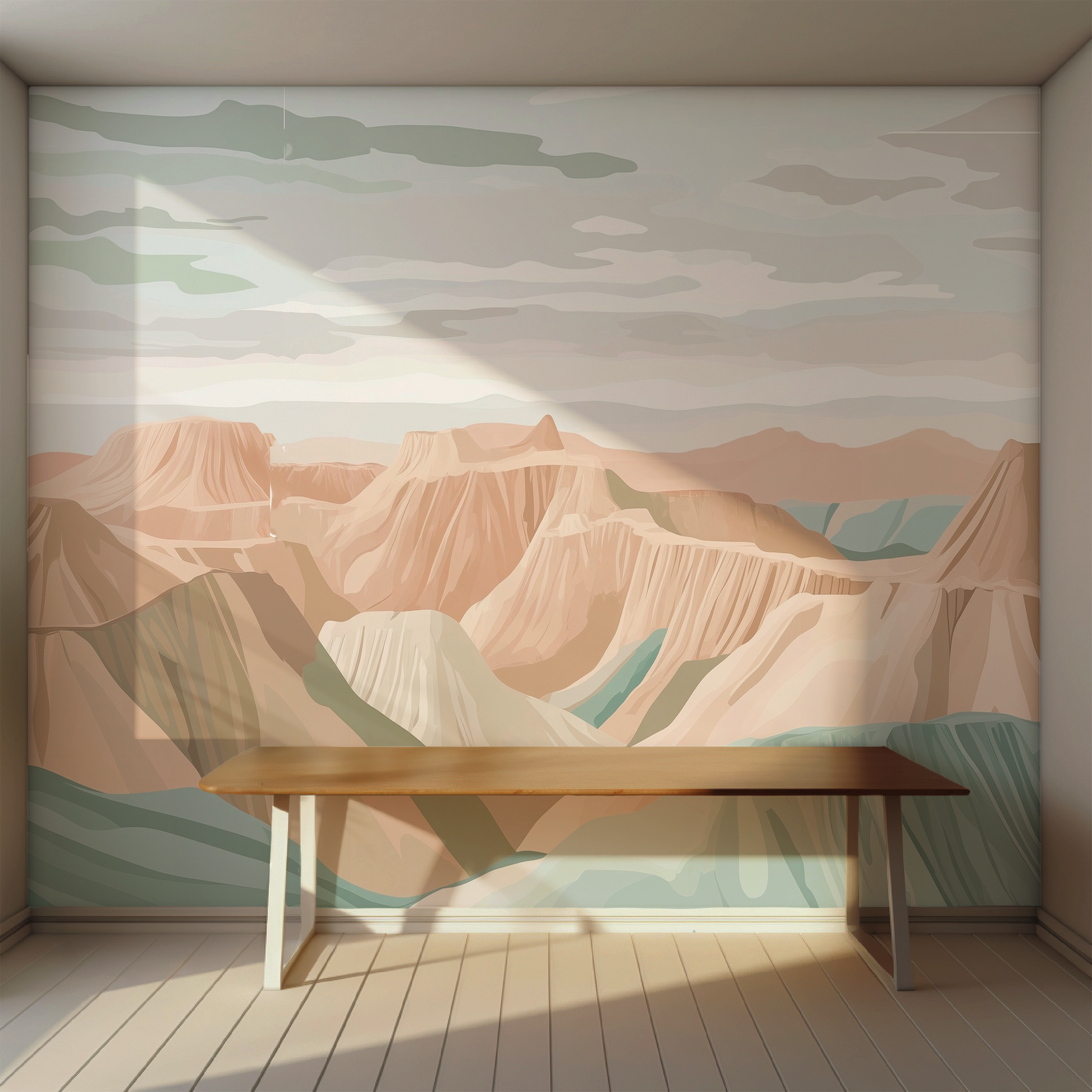 Dusty rose, sandstone, sage, and pale blue layer together like whispered stories etched into rock—quiet, timeless, resilient. There’s strength here, but also softness. A mural for those who find beauty in solitude, in texture, in vast stillness.