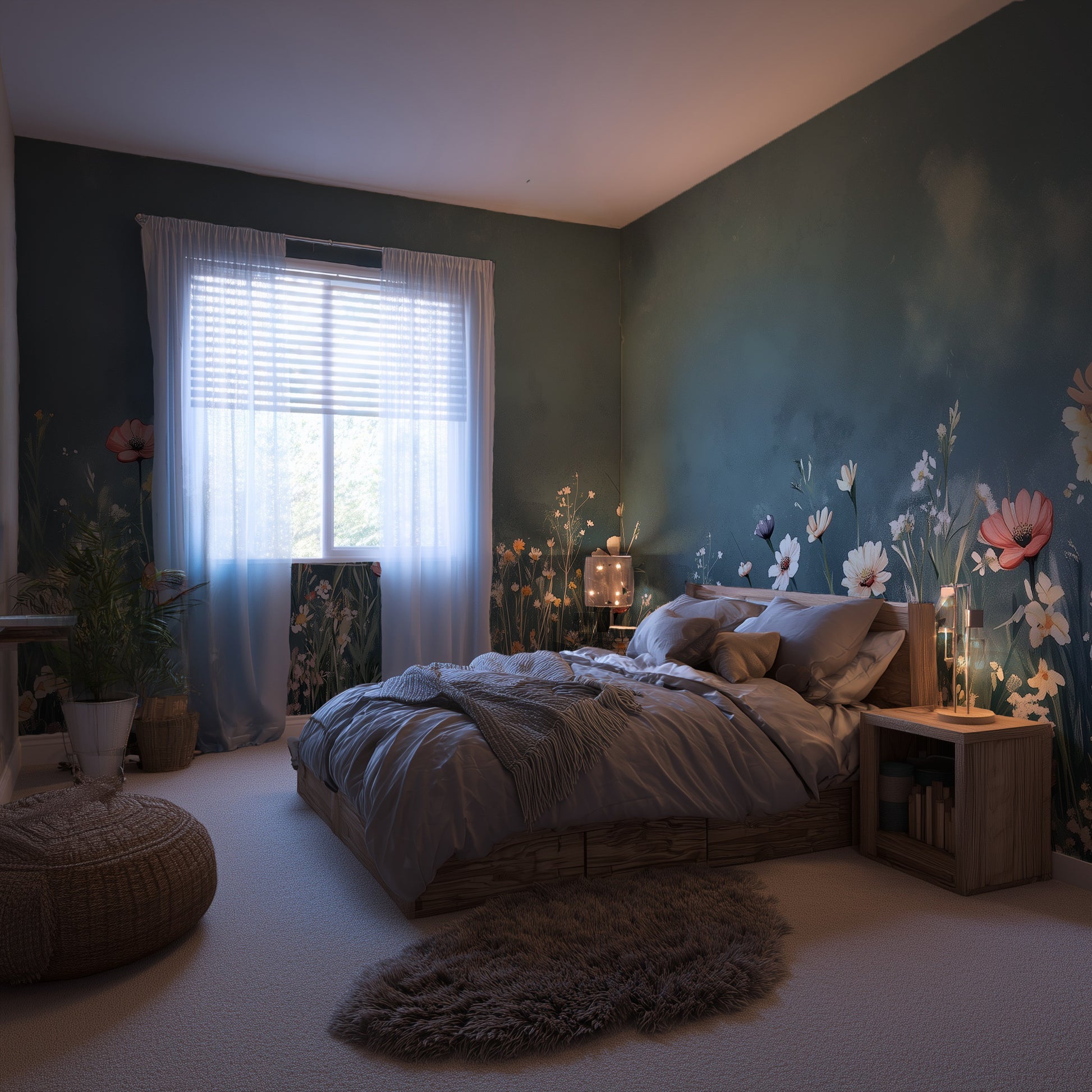 A stormy blue sky cradles a wild tangle of florals below: poppies, daisies, clover, and yarrow—painted in soft creams, coral pinks, lavender, and pale gold. There's a moodiness here, like the edge of a dream, yet every bloom feels alive, reaching for light. It's a wall made not just for decorating, but for remembering the sacredness of care.