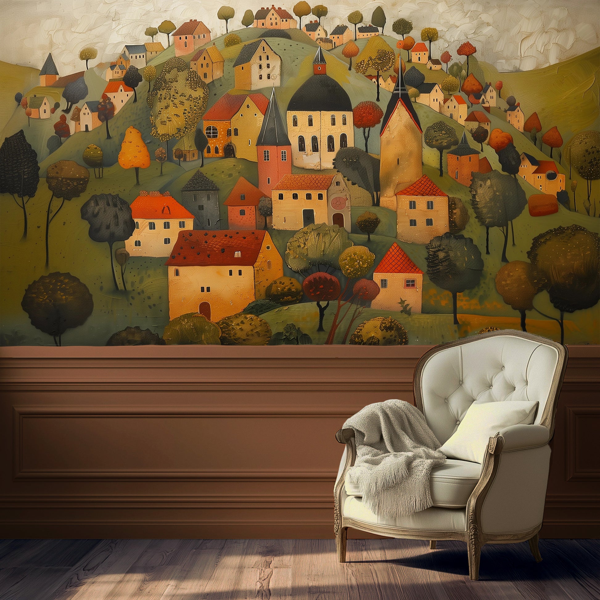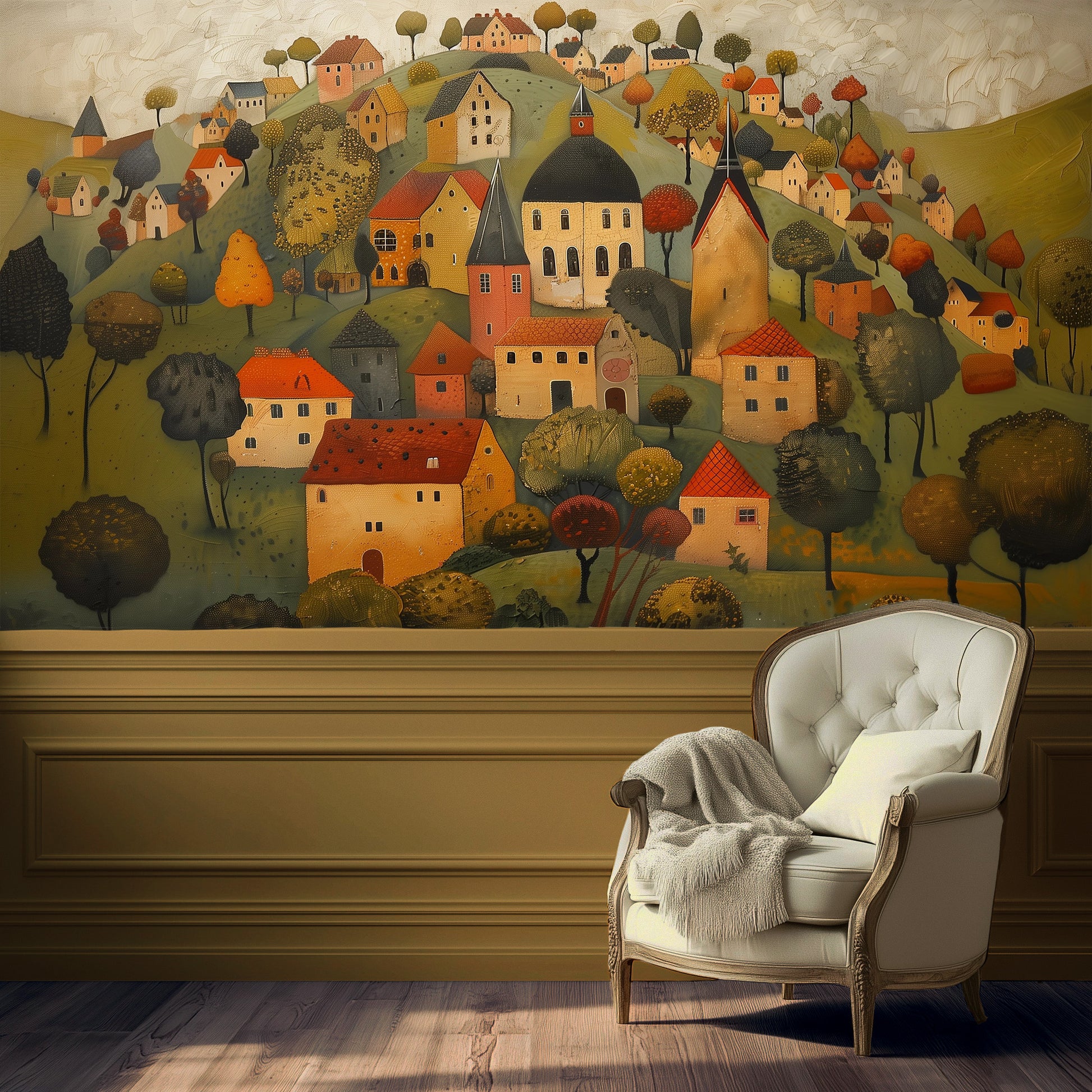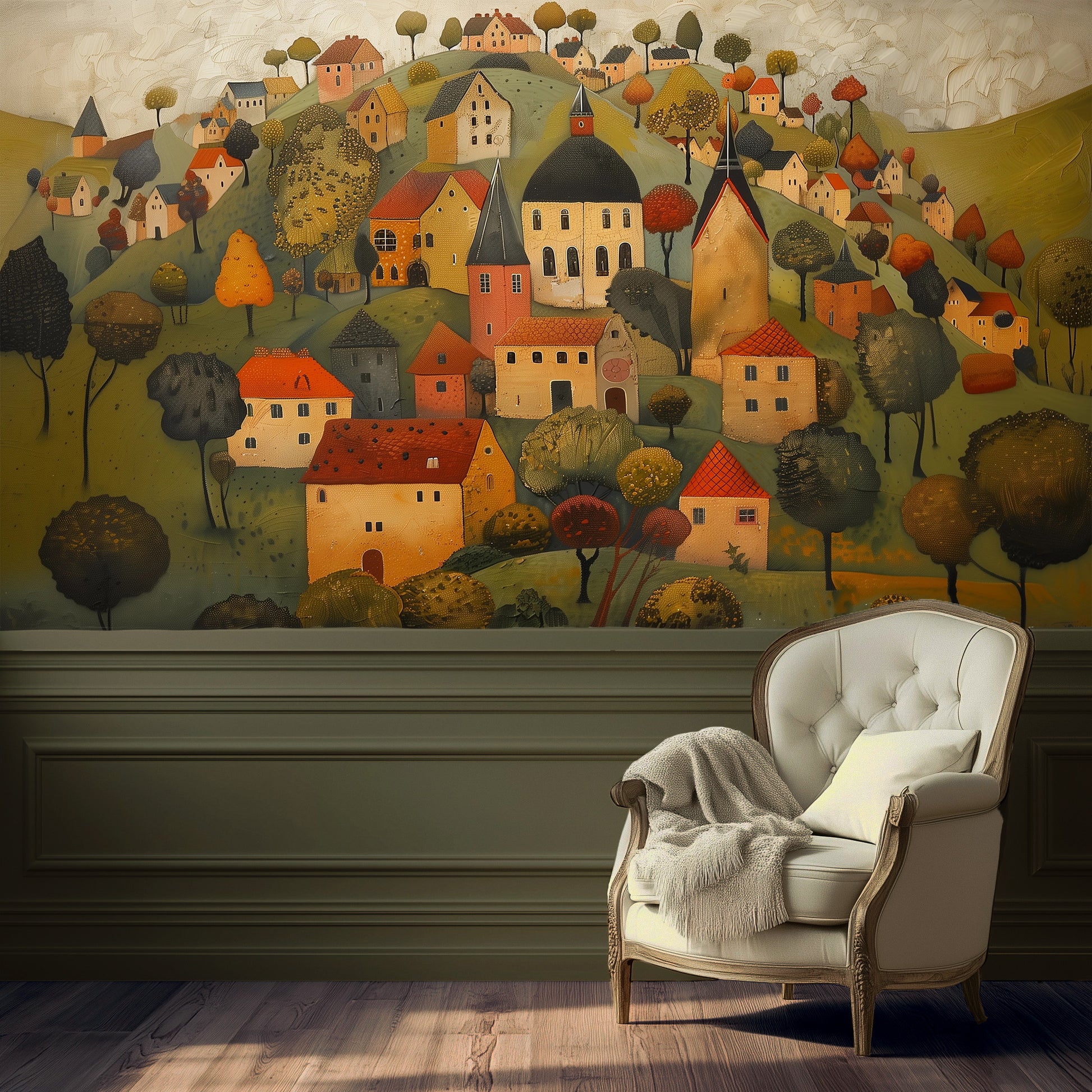 Each brushstroke tells a tale: of bell towers that chime at dusk, of winding cobbled paths between harvest-orange houses, of a quiet life lived in rhythm with the seasons. The palette—a tapestry of ochre, sage, rust, and mushroom grey—grounds the mural in old-world charm while still feeling playful and imaginative.