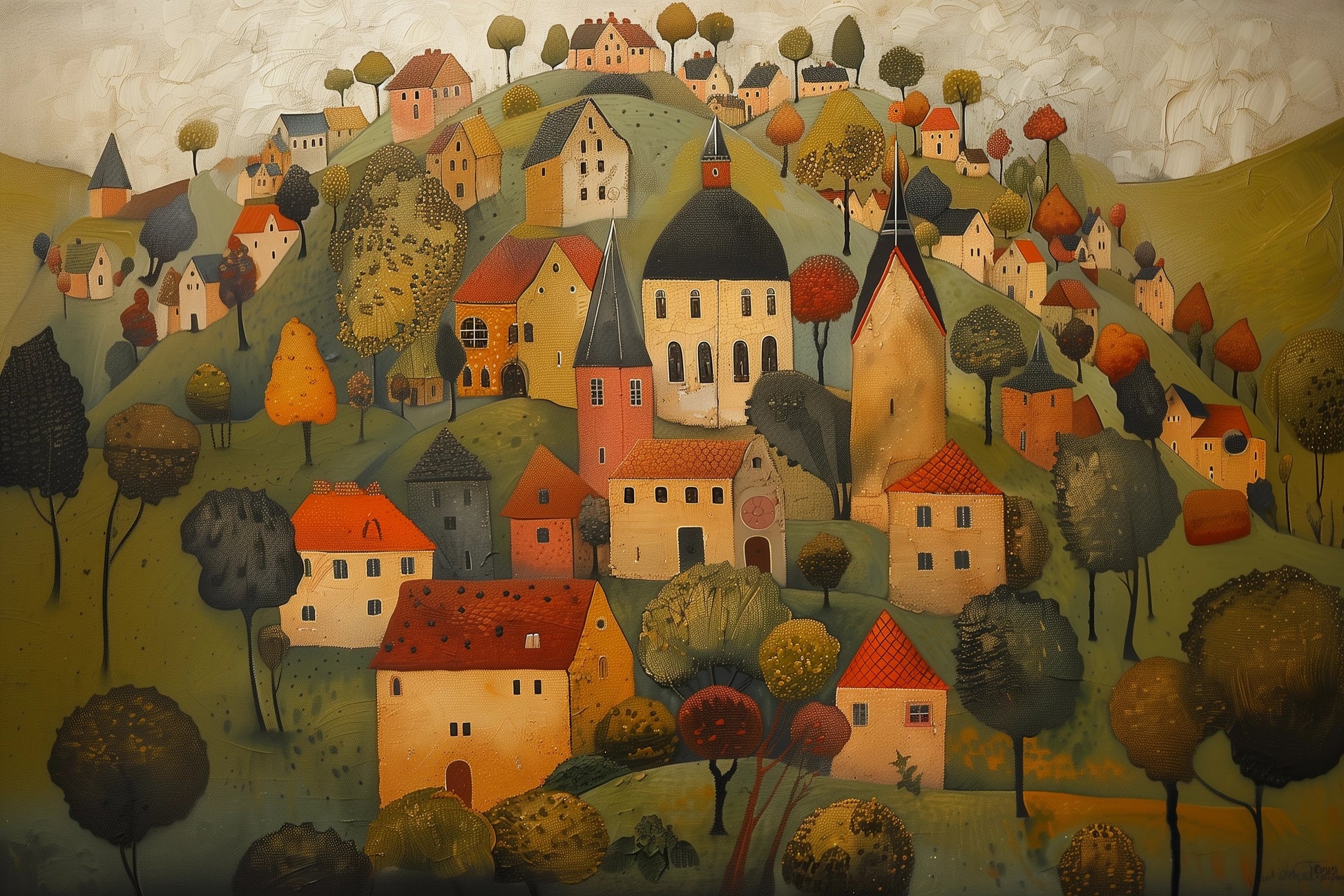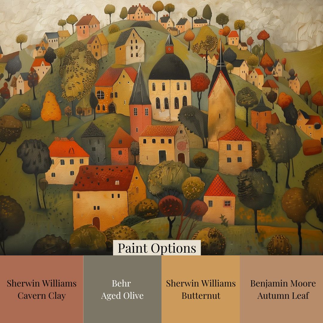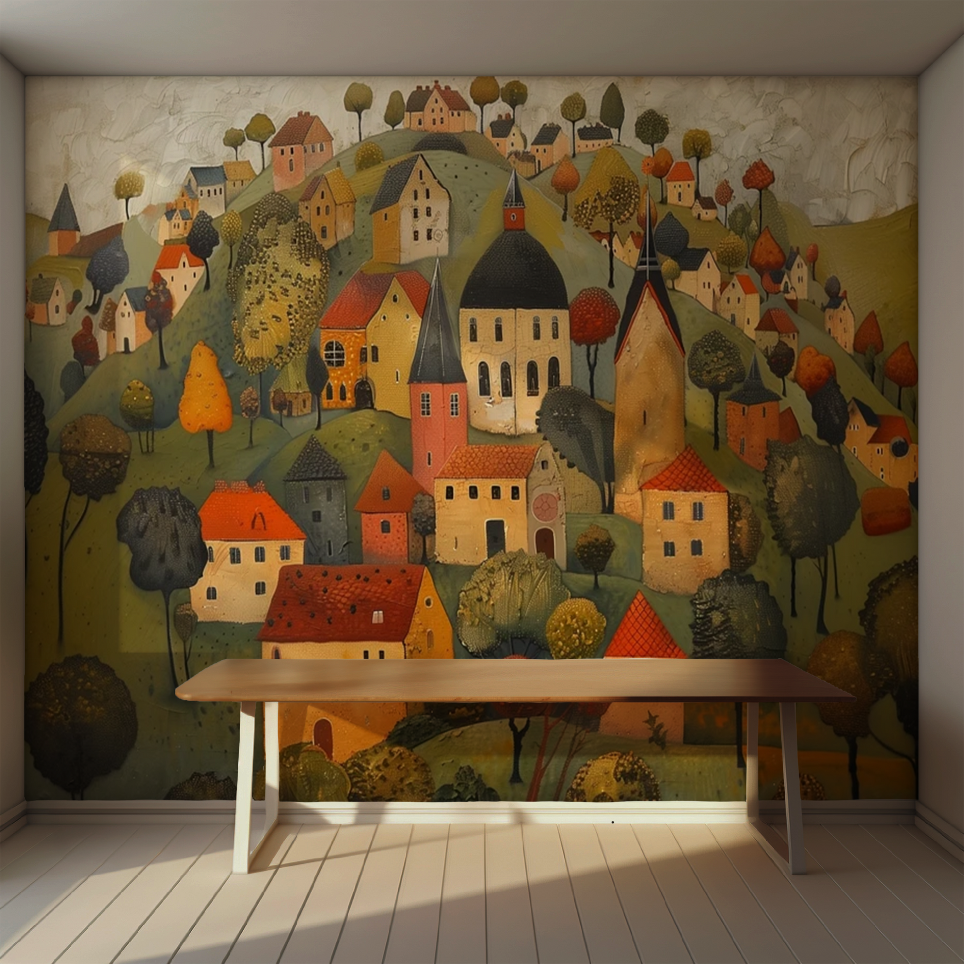 Each brushstroke tells a tale: of bell towers that chime at dusk, of winding cobbled paths between harvest-orange houses, of a quiet life lived in rhythm with the seasons. The palette—a tapestry of ochre, sage, rust, and mushroom grey—grounds the mural in old-world charm while still feeling playful and imaginative.