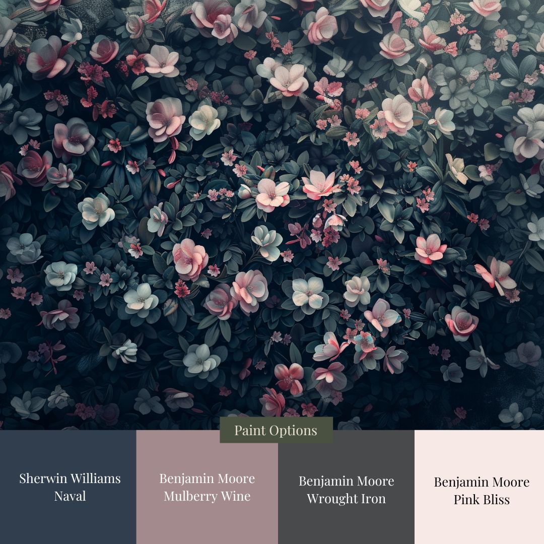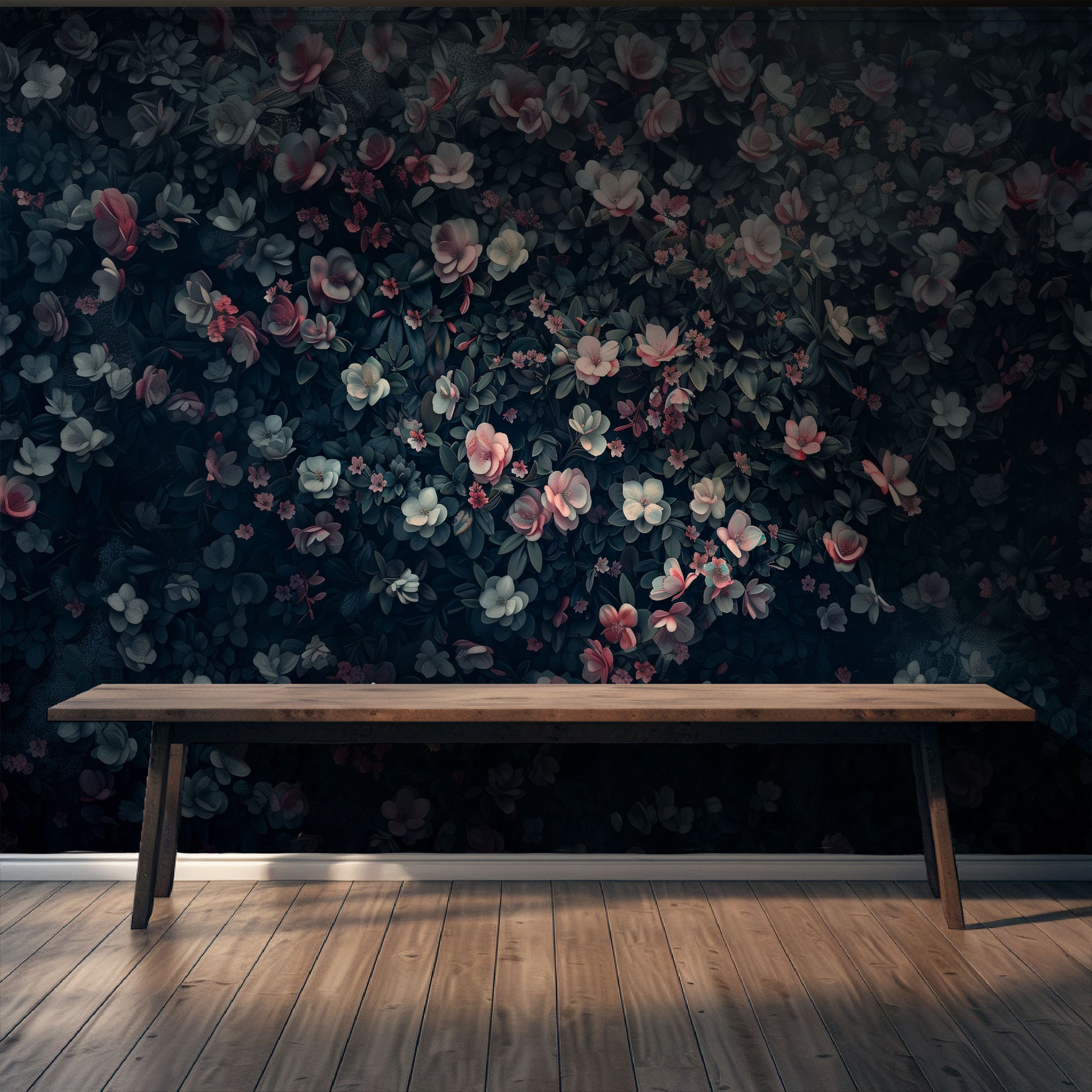 Inspired by the world just beyond the looking glass, this mural feels like stepping into a place where time bends, petals speak, and nothing is quite as it seems. The air is thick with the scent of wild roses and cool stone—like finding a secret key tucked under moss. Each bloom glows softly against its inky backdrop, alive with mischief and memory.
