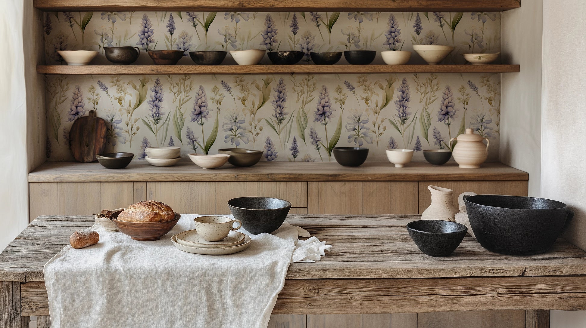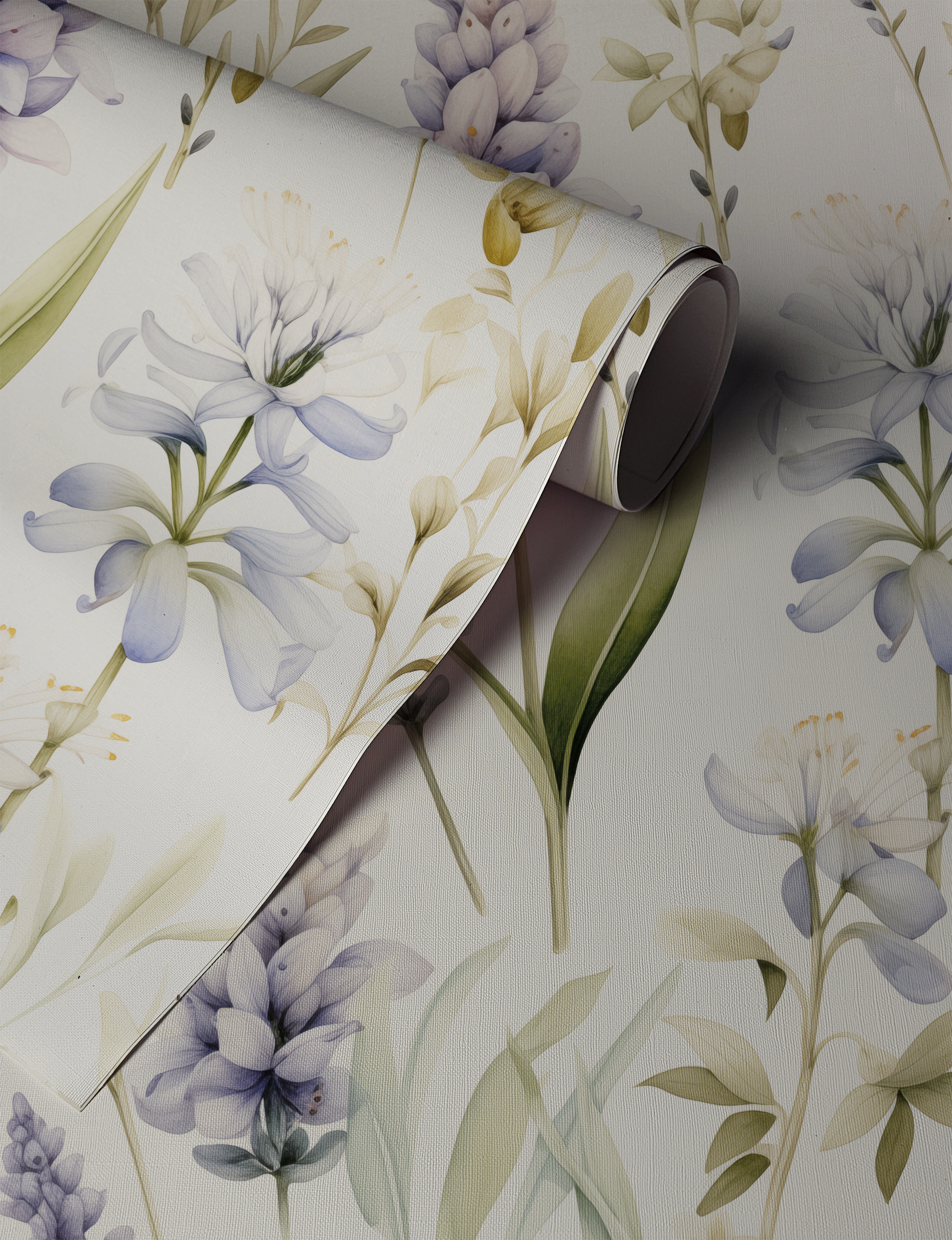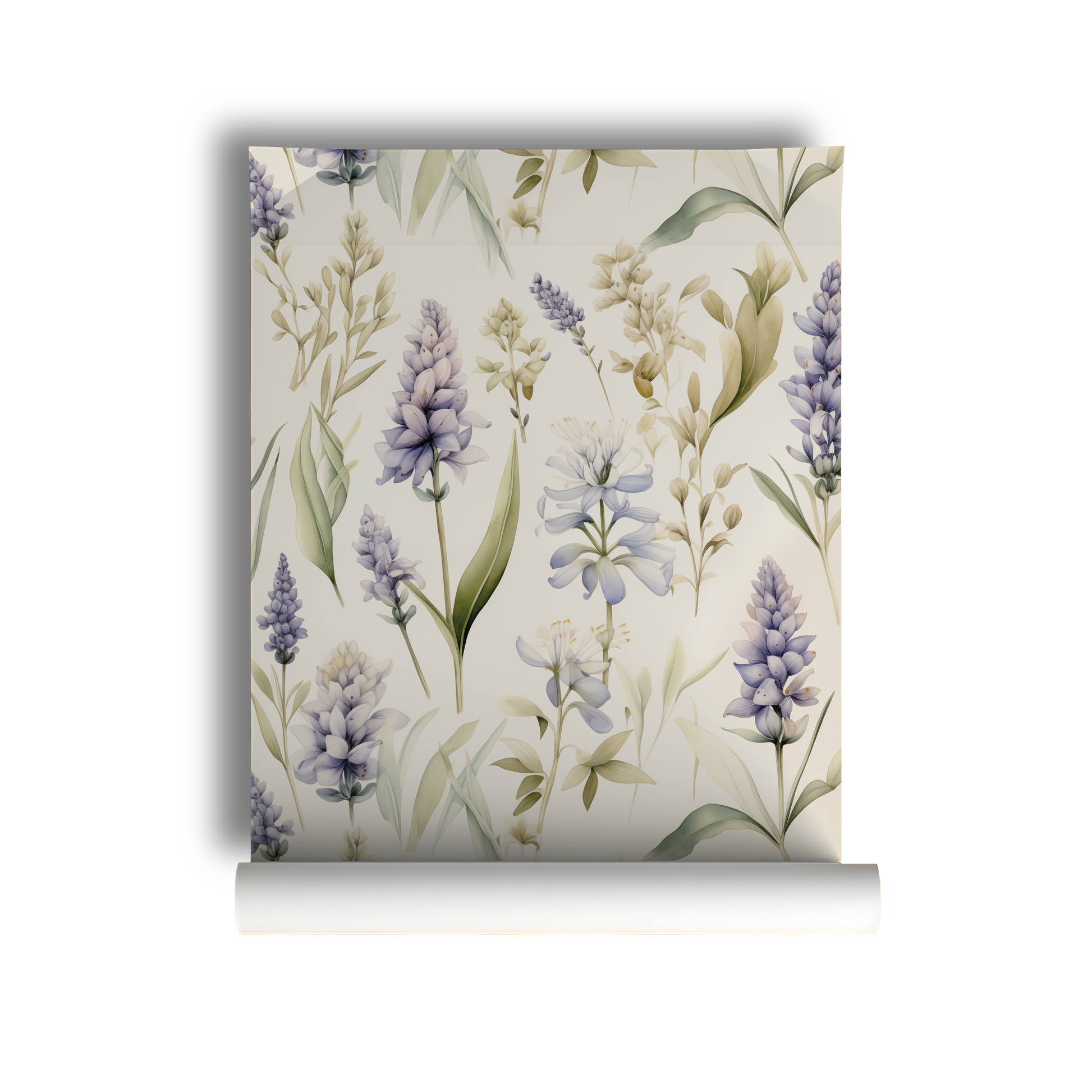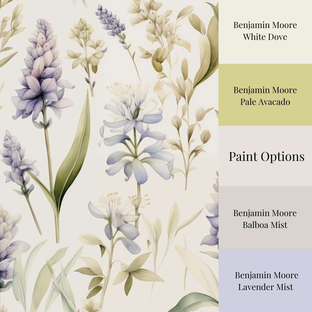Some designs are like memories you haven’t made yet. This one feels like spring in the south of France, walking through fields of soft lavender and wild herbs with nothing to do but breathe in the calm. The pale stems, creamy buds, and muted violets feel quiet, yet full of life—like pages of a well-loved field journal come to life on your walls.